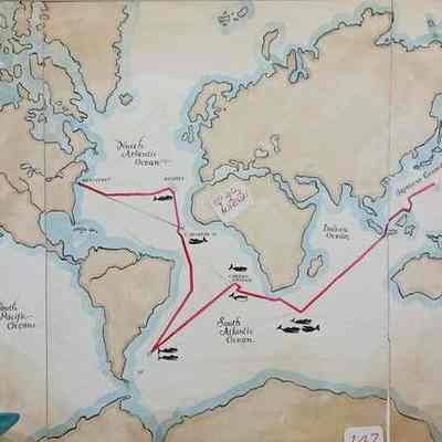 Ahab in harpoon shadow (map of ocians showing whales N. & S. atlantic & indian with Back of .080: (DRAWINGS FOR the short film " Herman Melville's MOBY DICK " in colaboration with Jerry Winters, 1955)