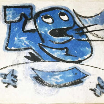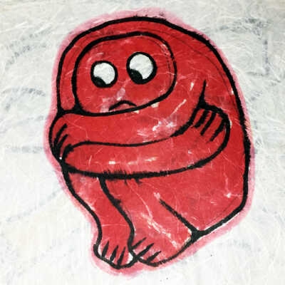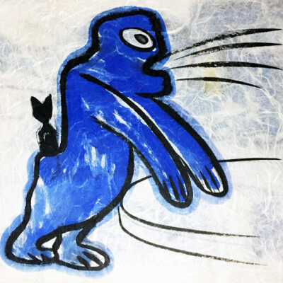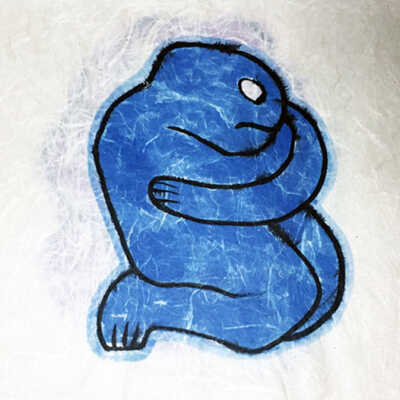 side of Blue Hue Man hugging self legs folded under, eyes open (Drawings for Old Mr. World and the Hue Mans animated film)