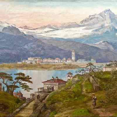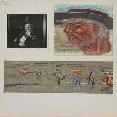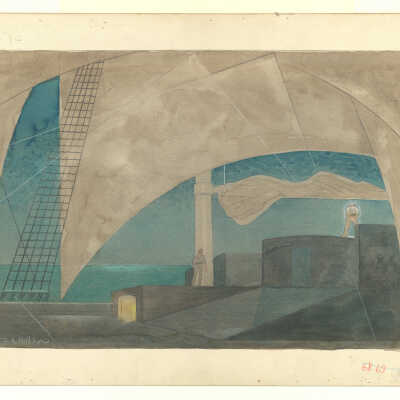A Unit Set Design For a Mobile Stage -Front View for THE WHITE WHALE Back: photo Lauritz Melchior , drawing Walter Huston as Ahab, a visual schemata of the Music as it might look registered in Sound Waves (Epic theater symphonic drama in five acts- based