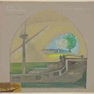 A Unit Set Design for a Mobile Stage -Side View for THE WHITE WHALE Back: Drawing on bd, the Peg Leg" & taped image spiral of clouds focuses view on diagonal mast w man;(A spoken drama with background music...and scene projection... based loosly on Mel