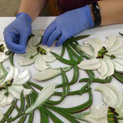 Victoria Lupia and Board Member, Gail Yowell, cleaning the "filigree" for Good Shepherd