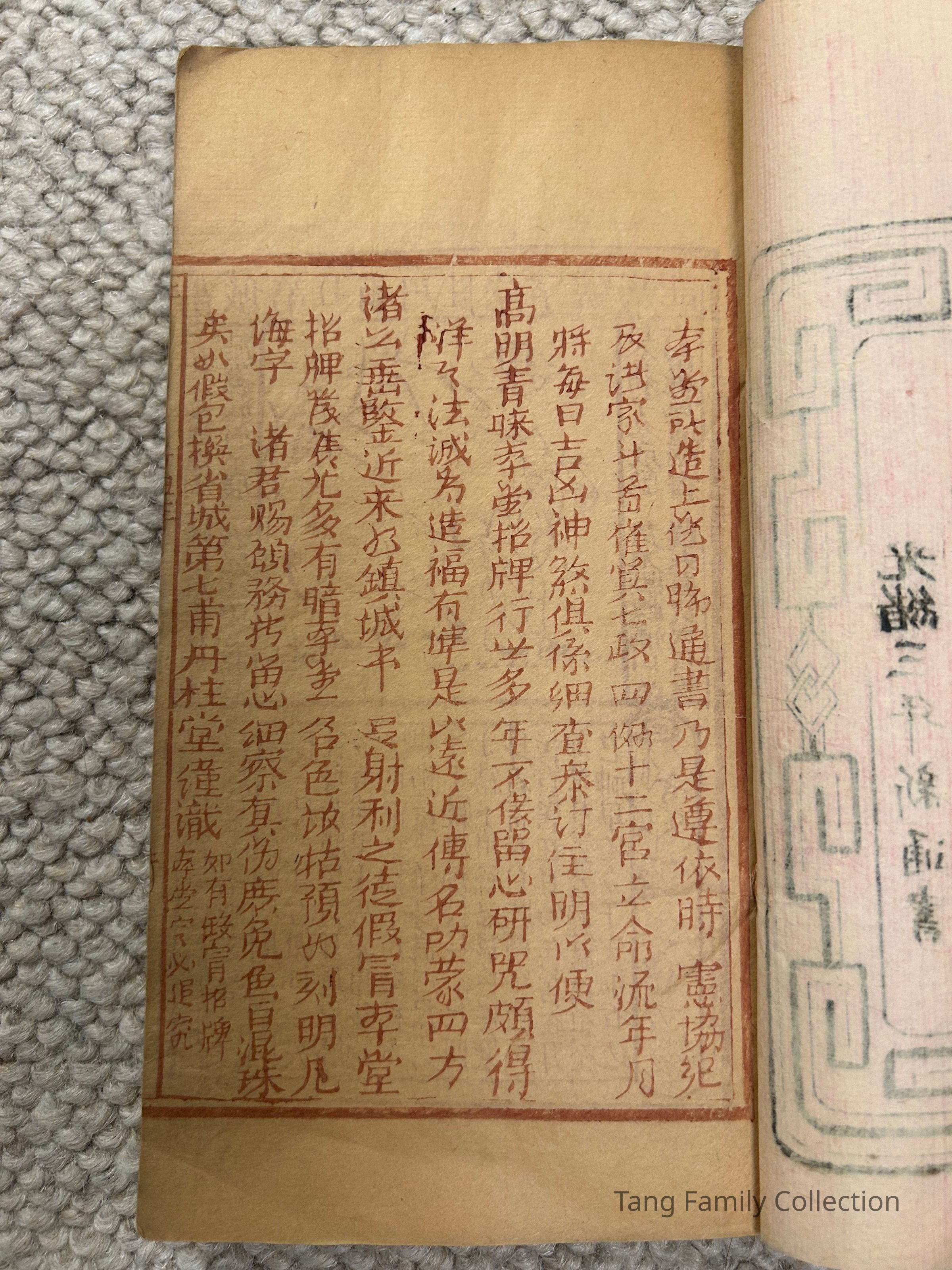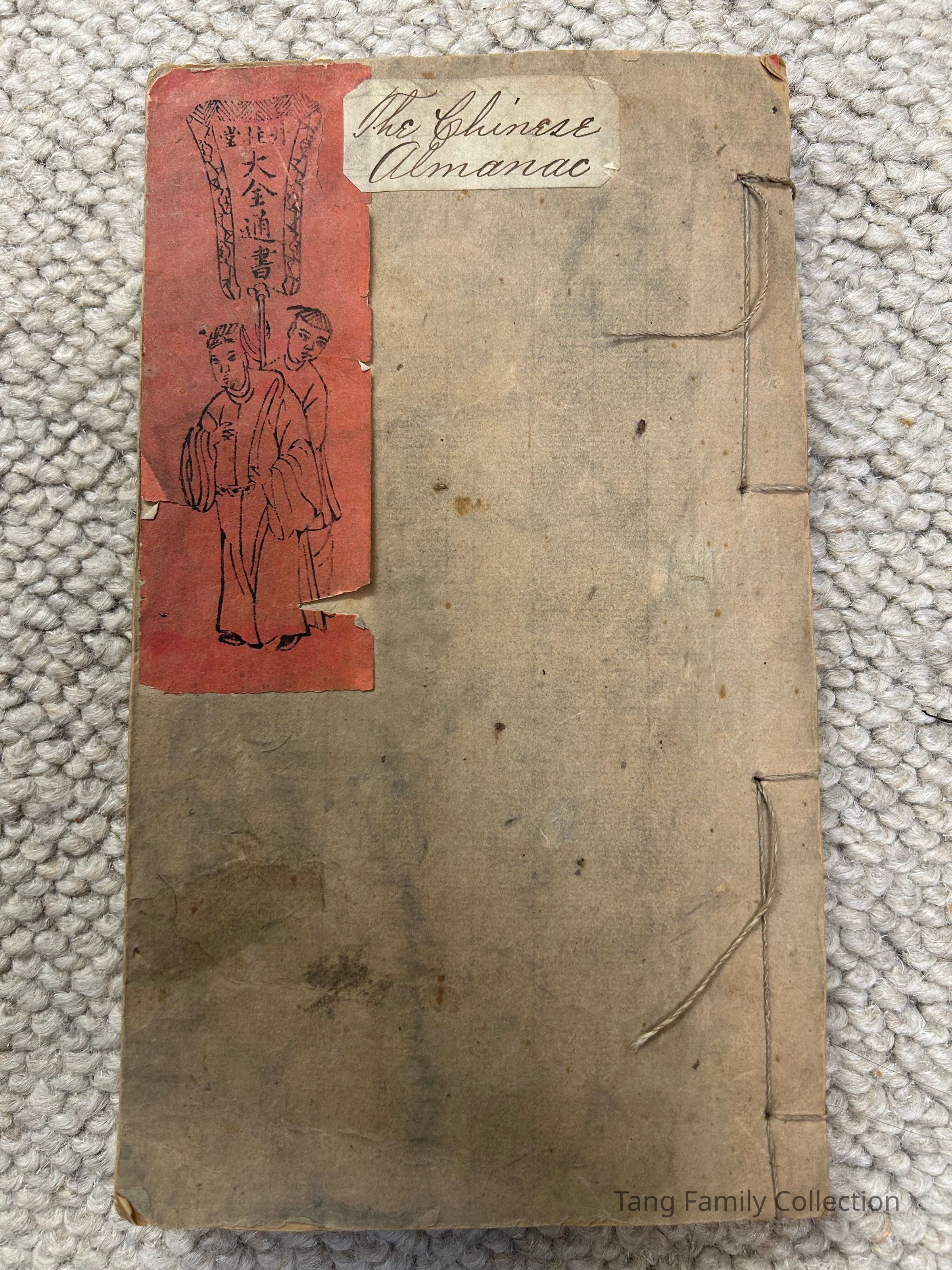 This copy of a traditional Chinese almanac, known as a Tōngshū, dates back to the third year of the Guangxu Era (1877). The cover page, in a vibrant red, is decorated with the auspicious phrase "Long life and much happiness". The book was printed by Dānguìtáng in the provincial capital.