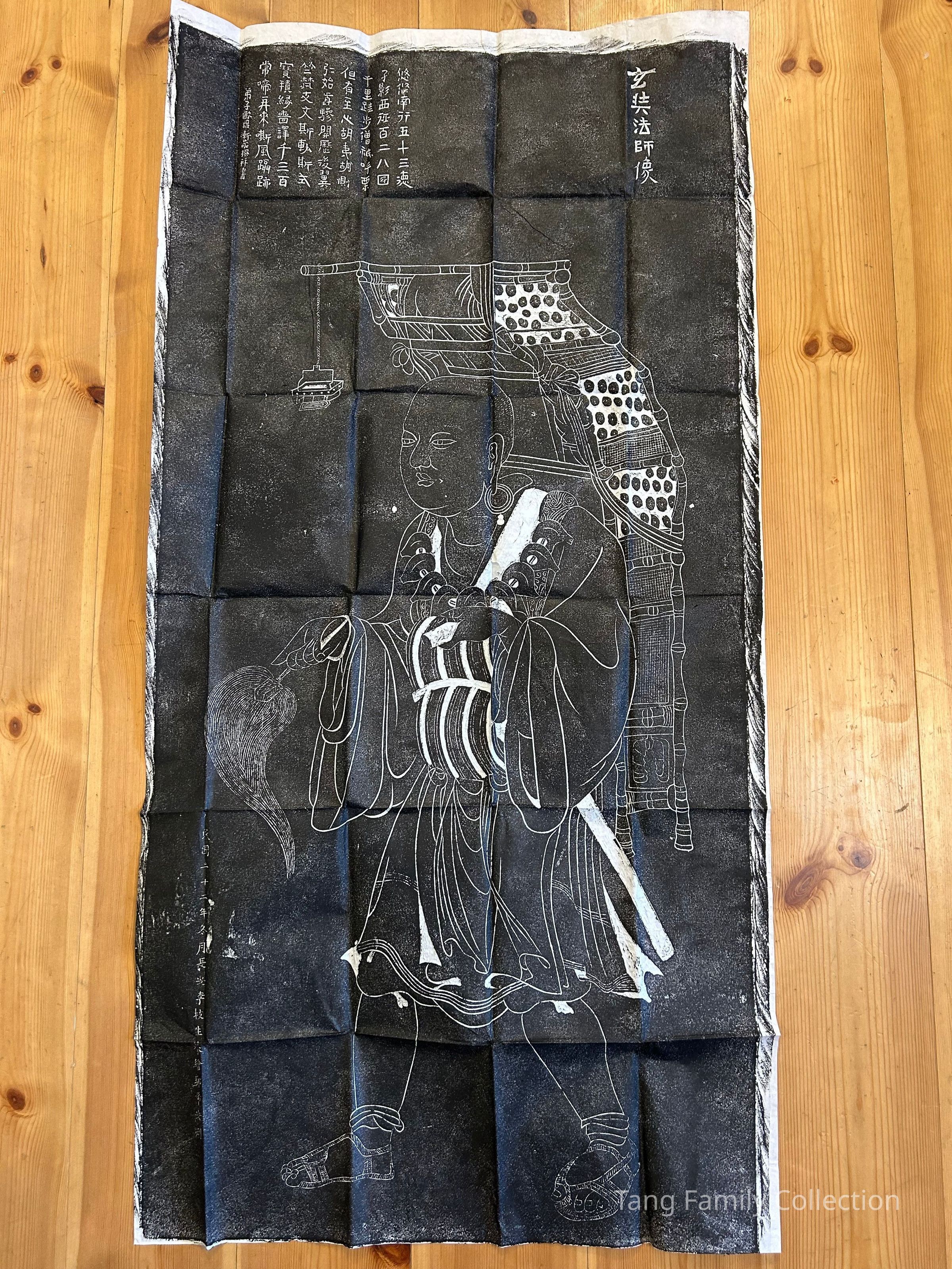 Xuanzang's historic journey to collect Buddhist scriptures is a central story in Chinese Buddhism and is the basis for the classic novel Journey to the West. The rubbing technique preserves and reproduces significant historical and religious imagery, such as that found at the Xingjiao Temple in Shaanxi, from which similar depictions originate.