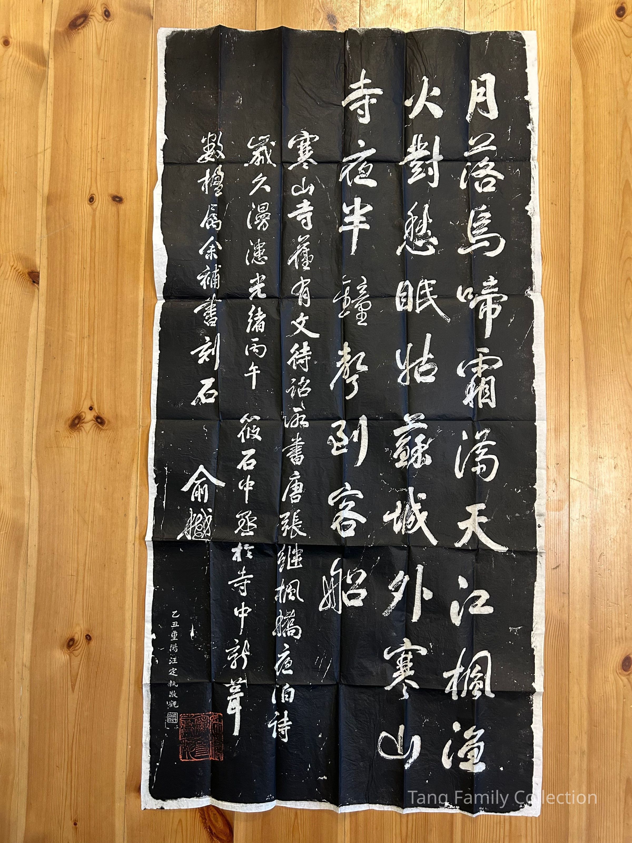 This exquisite Chinese stone rubbing features the famous poem "Night Mooring at Maple Bridge" by the Tang dynasty poet Zhang Ji. The poem celebrates the serene scenery near Hanshan Temple in Suzhou and reflects the poet's melancholic state of mind as he spends a sleepless night aboard a moored boat.
