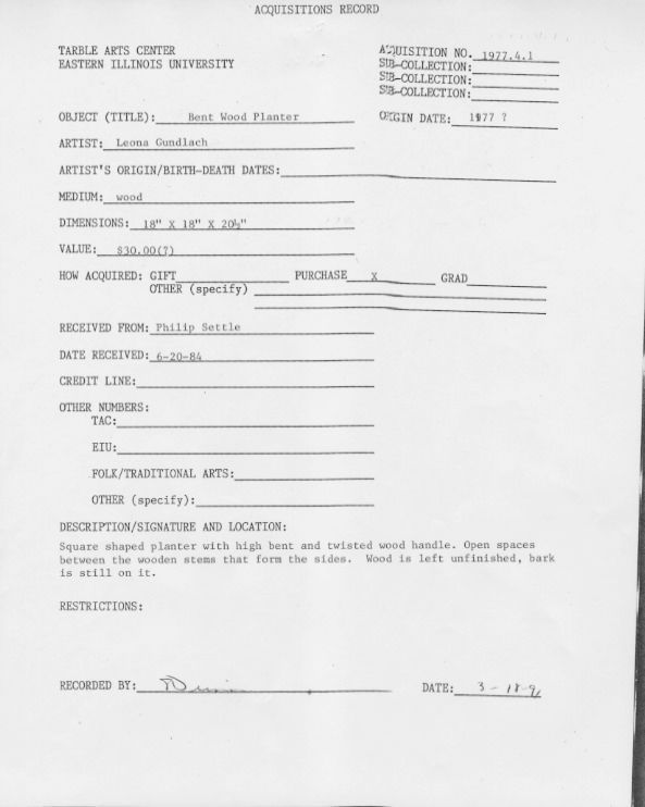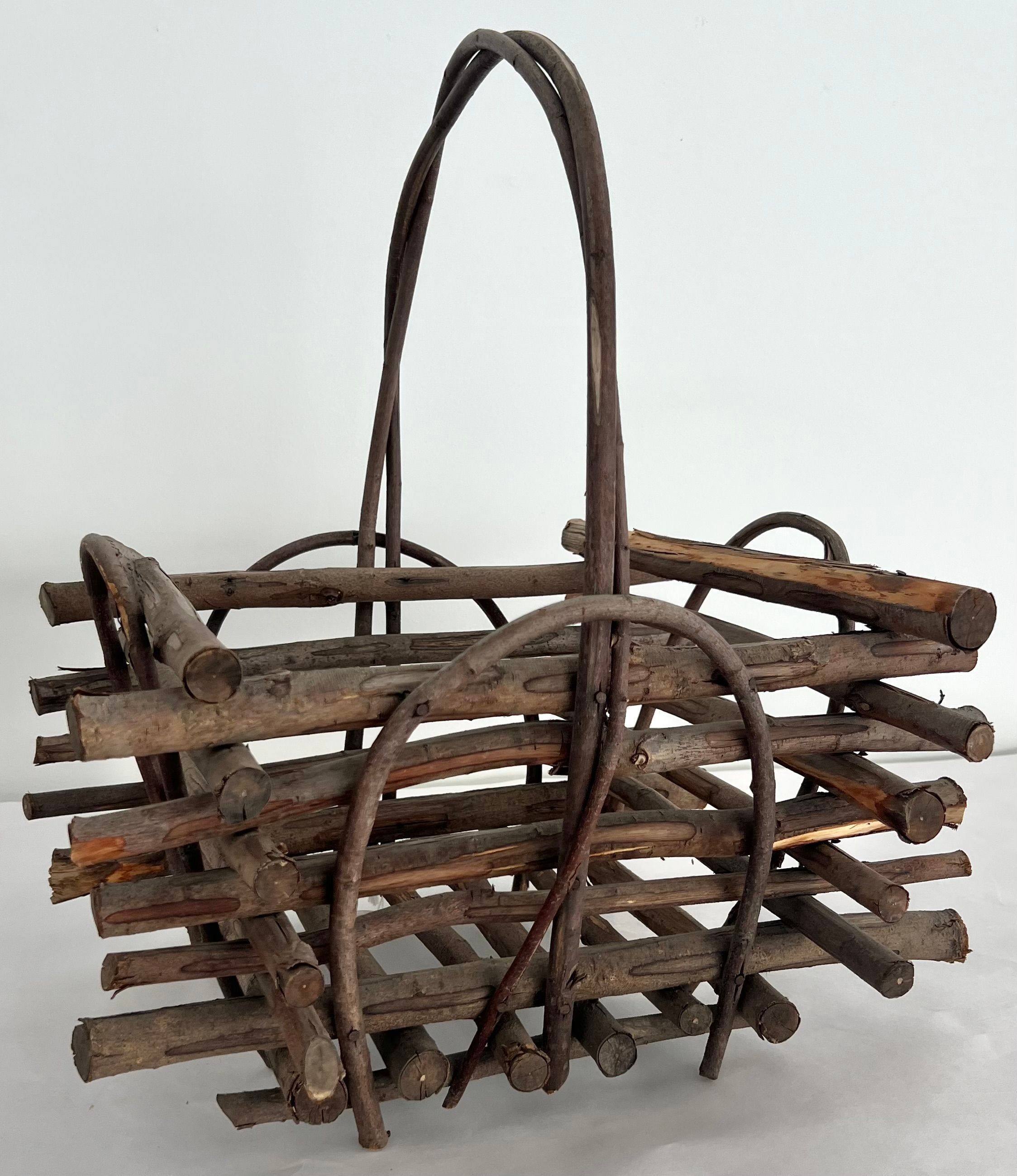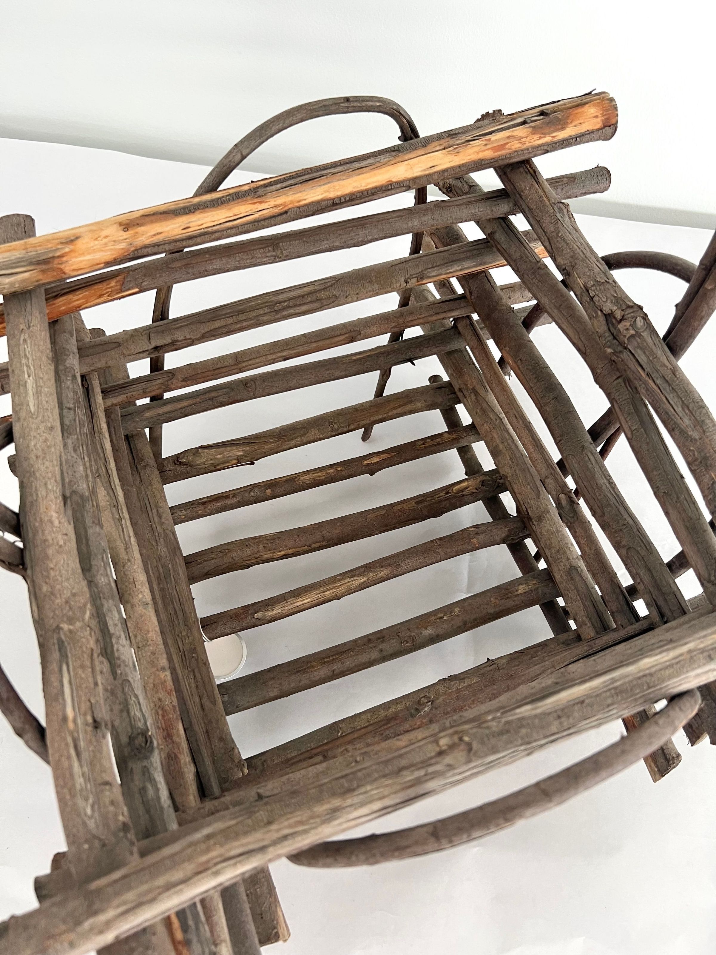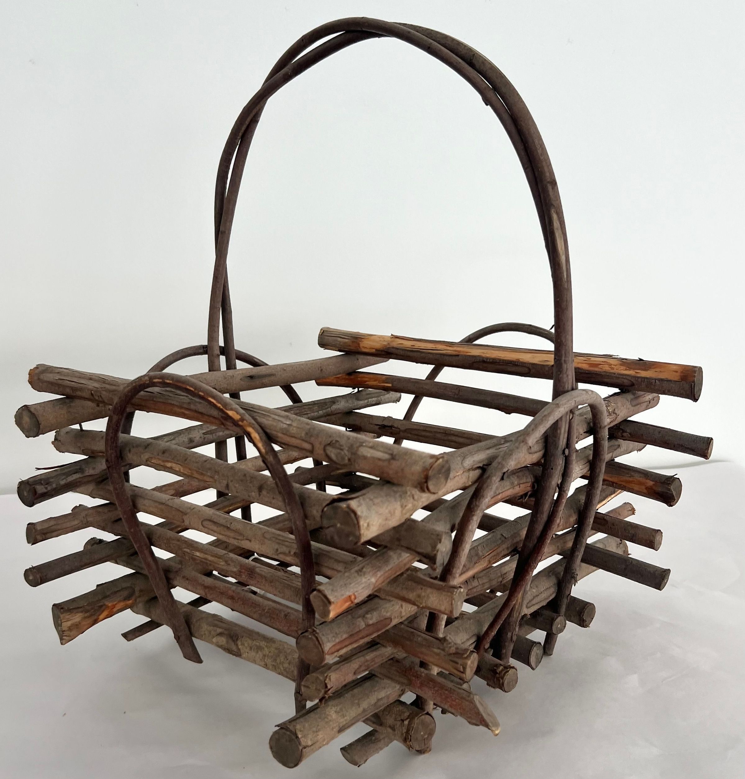 Interlocking twigs form an open top box. Open spaces between the wooden sticks that from the sides. Tall bent twig handle at top. The wood is unfinished, bark is still on it.Collection