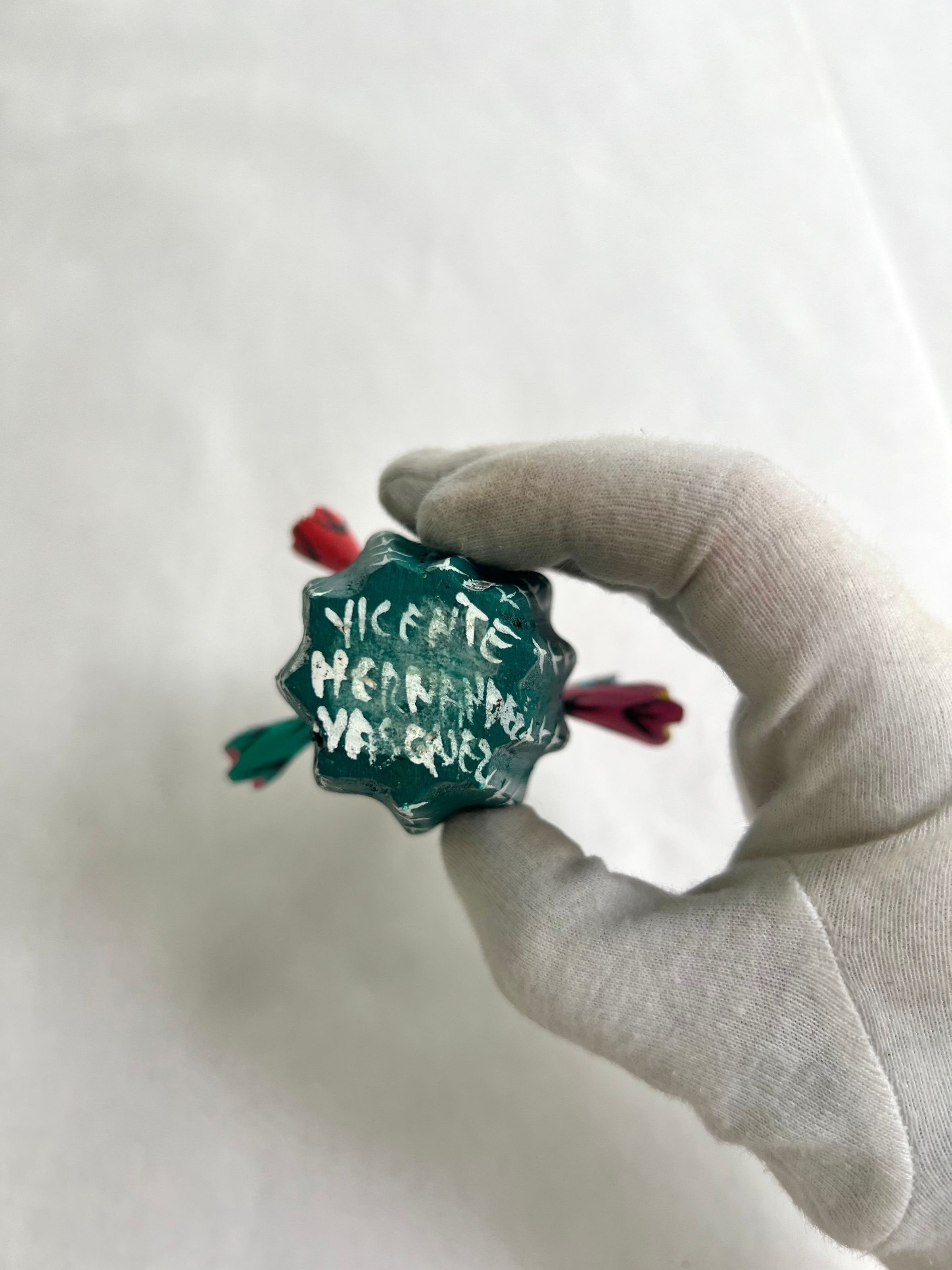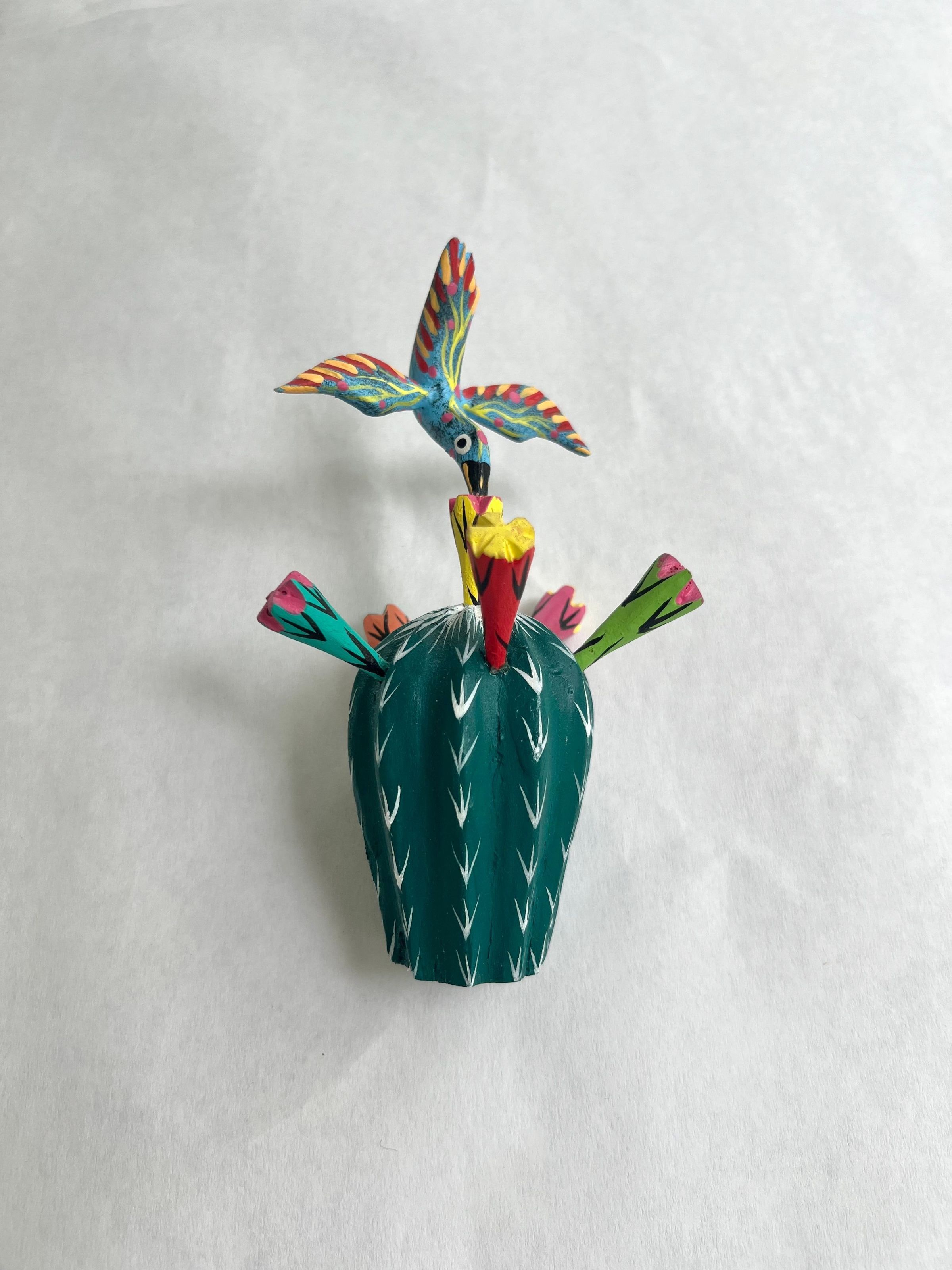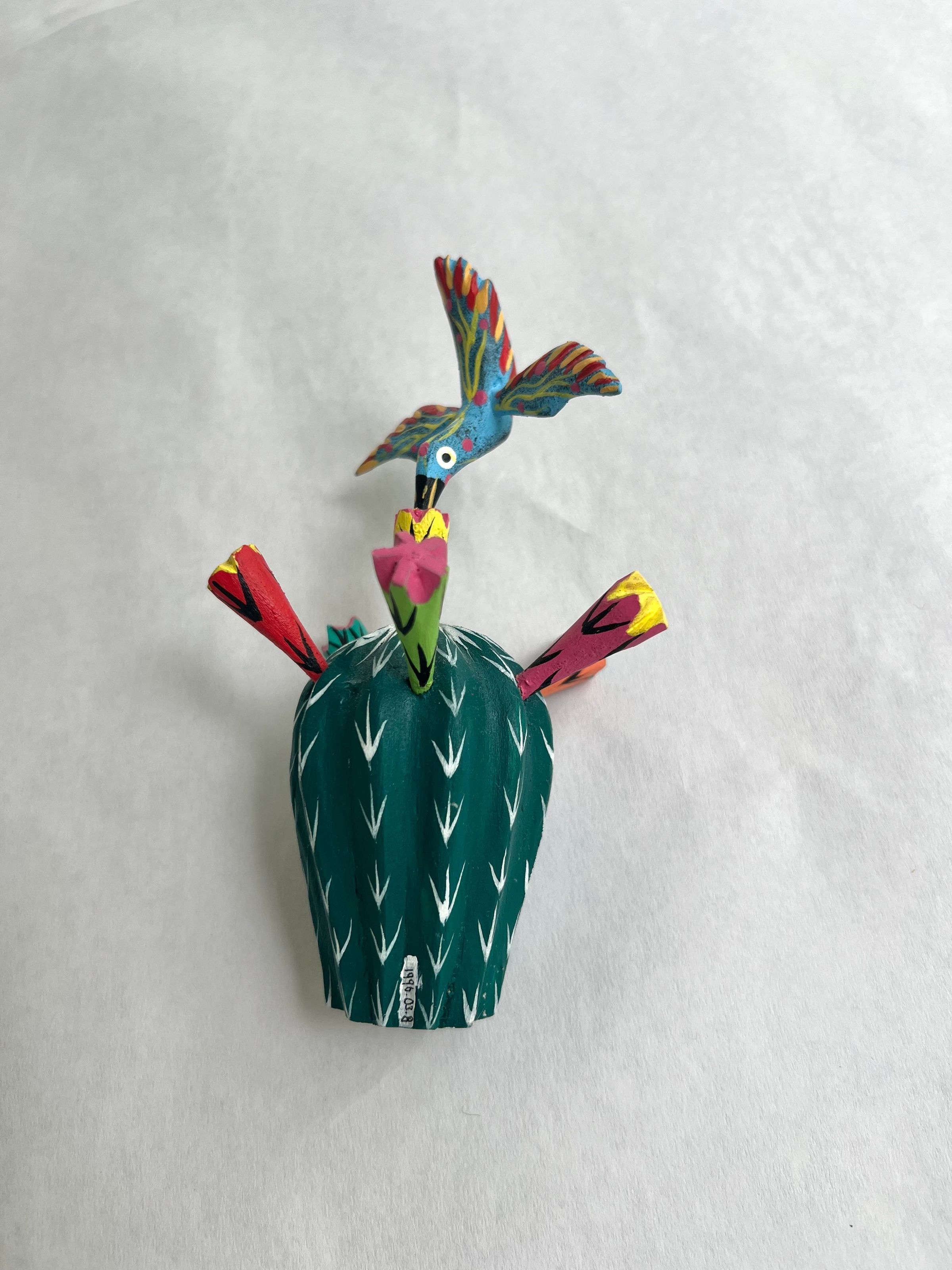 Oaxacan carving of a bird drinking nectar from a flowering cactus. It is a green cactus with multicolored bird and flowers.Collection