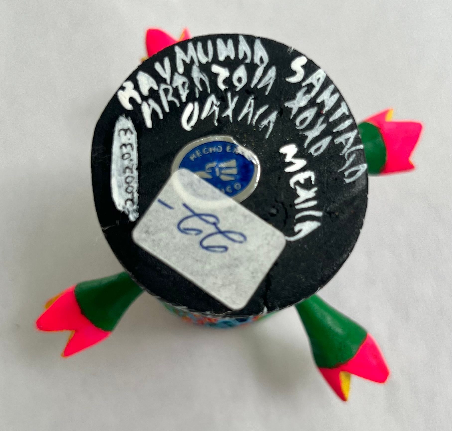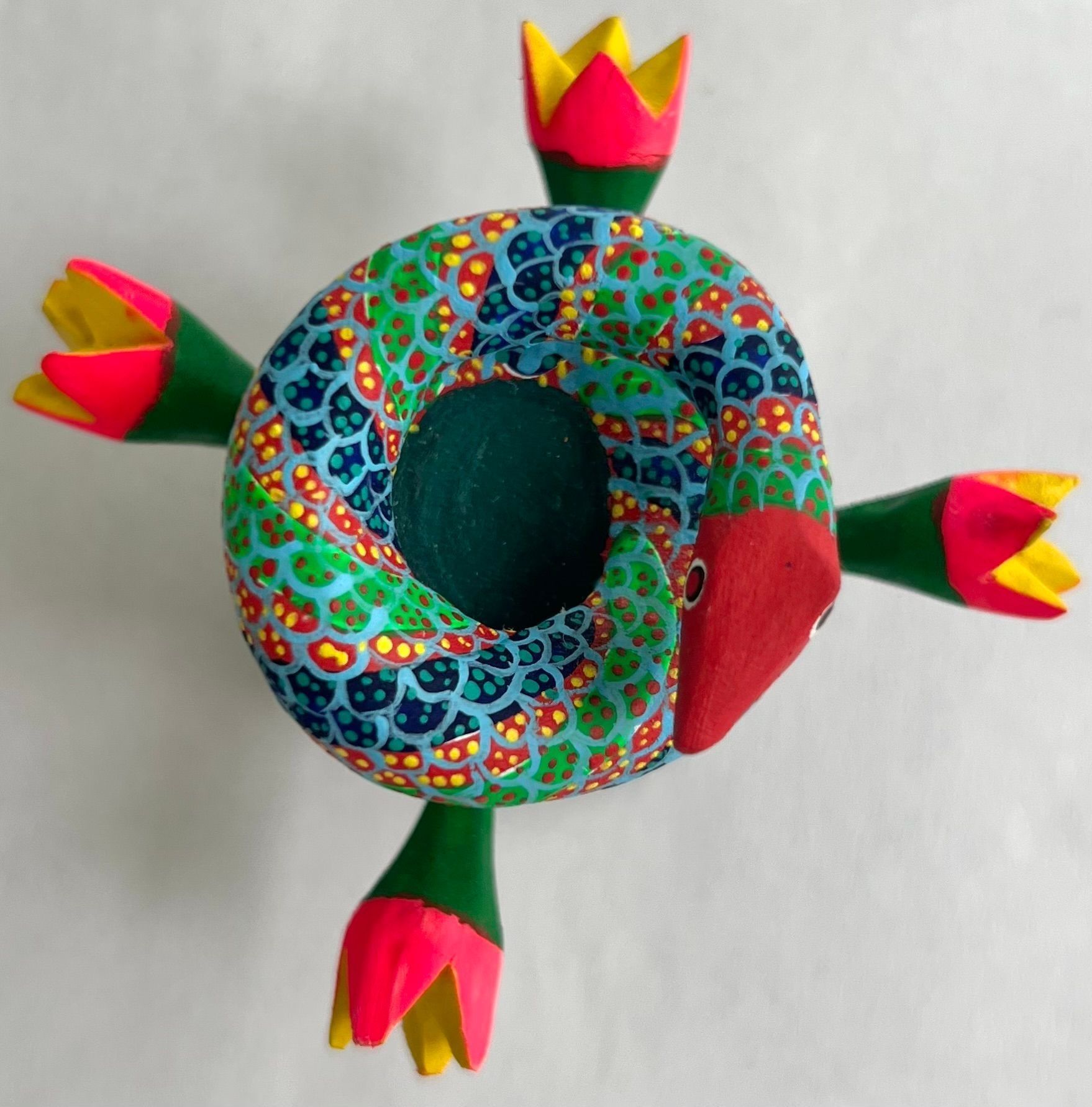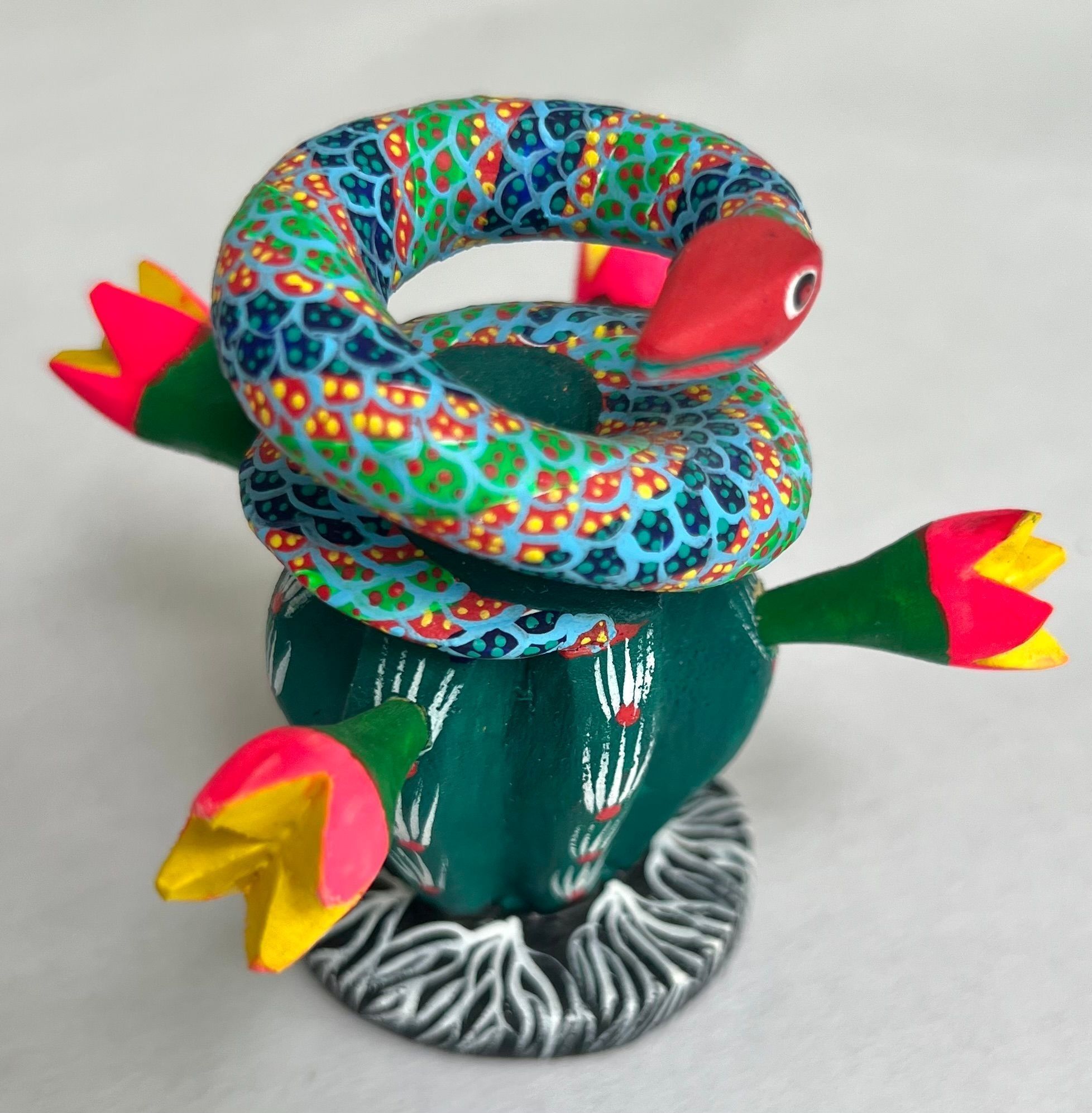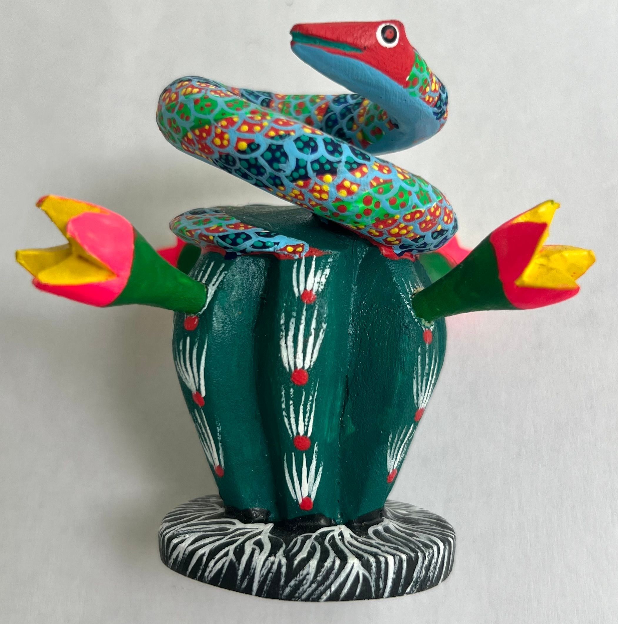 Carved cactus with black and white base; 4 red and yellow flowers with coiled snake on top. Snake is polychrome with a red head.Collection