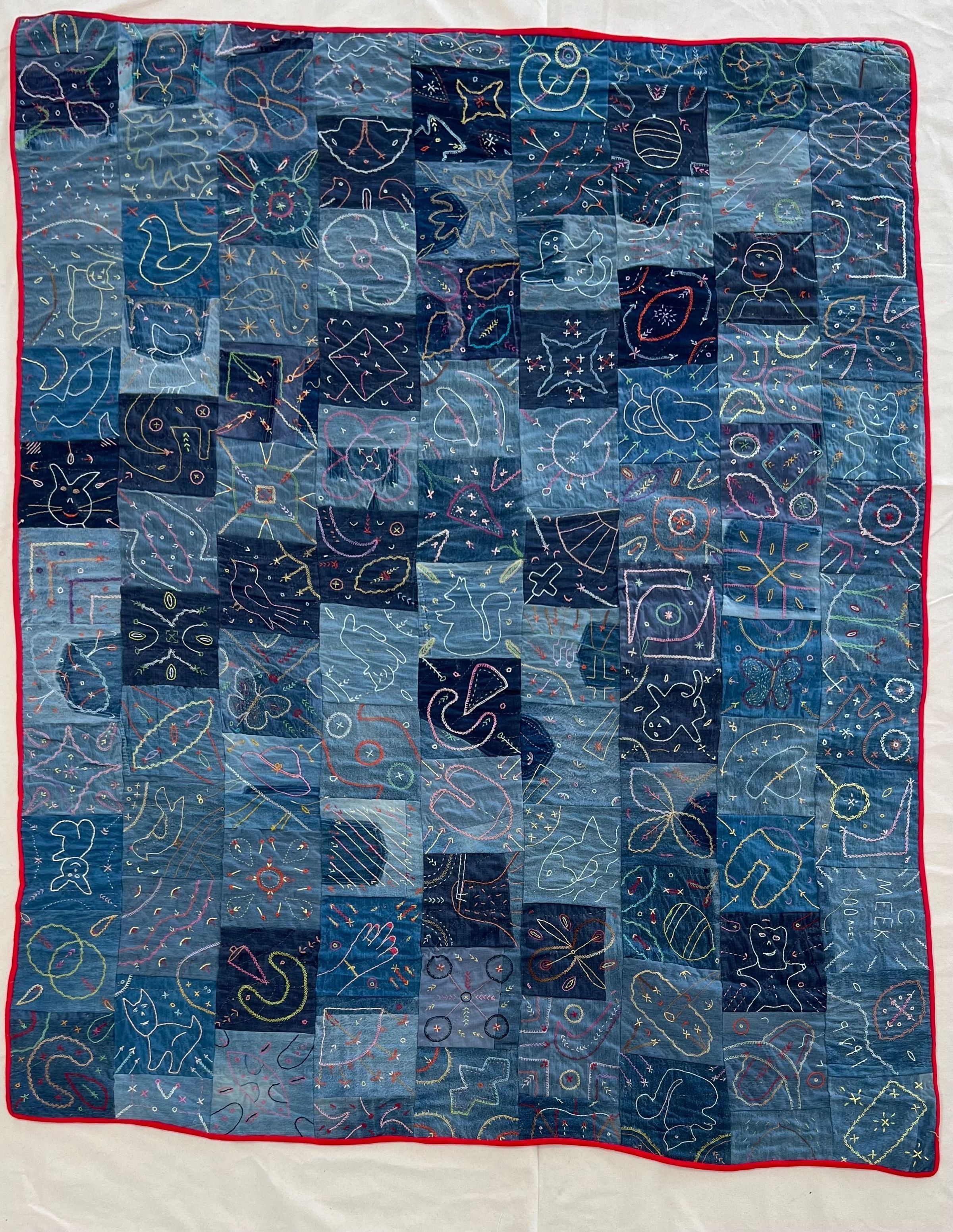 Signed "C. Meek 100 AGE " in 3rd square from upper right corner date "9891" in 2nd square from upper right corner, red cord border, denim embroidered squares.Collection