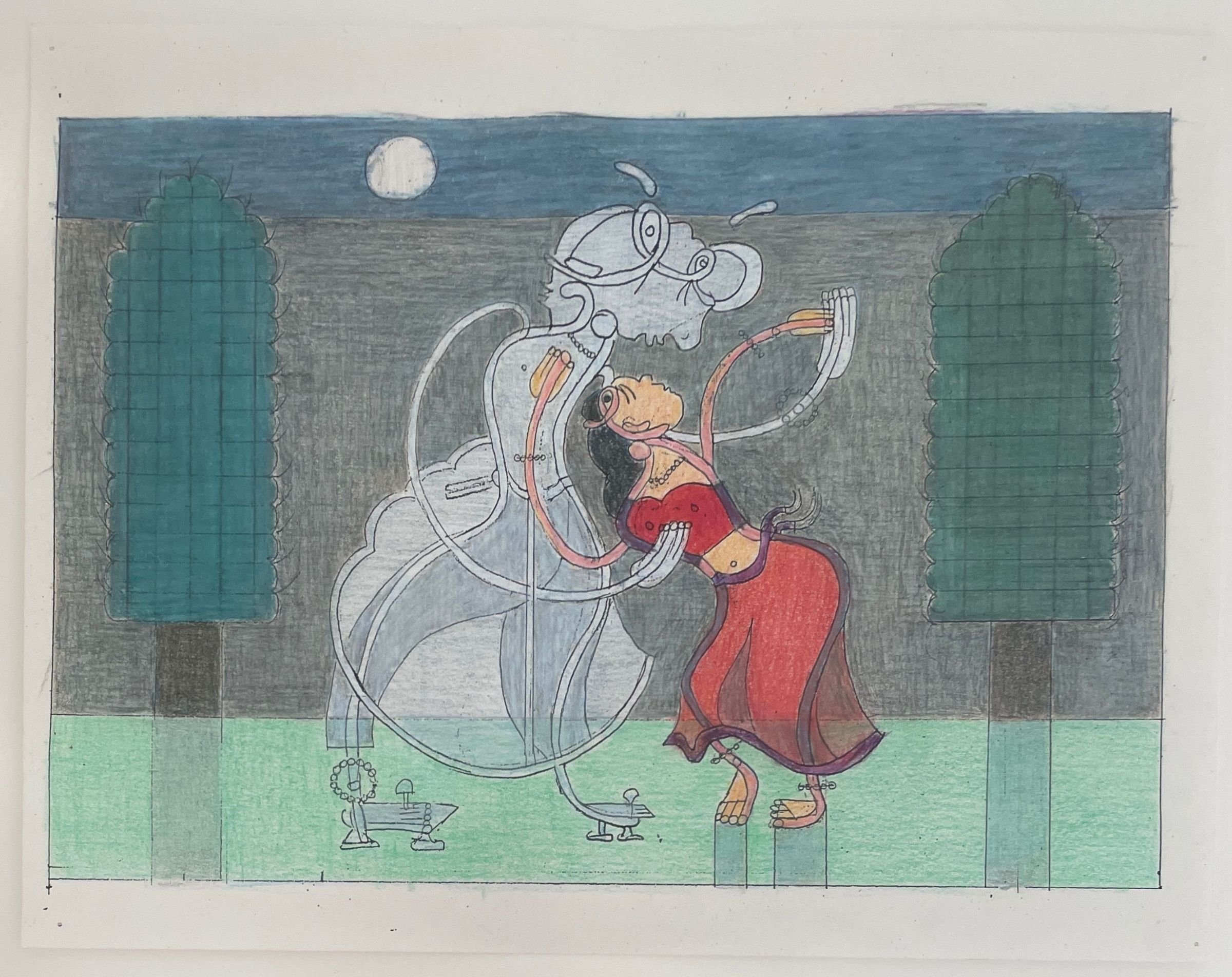 color study for Moon Meet May. Moon is a light blue with some darker blue bits. May is in a red dress trimmed in purple. the wall is a dark gray. the sky is dark blue and the ground is green. trees are dark green with a grid pattern. no birds