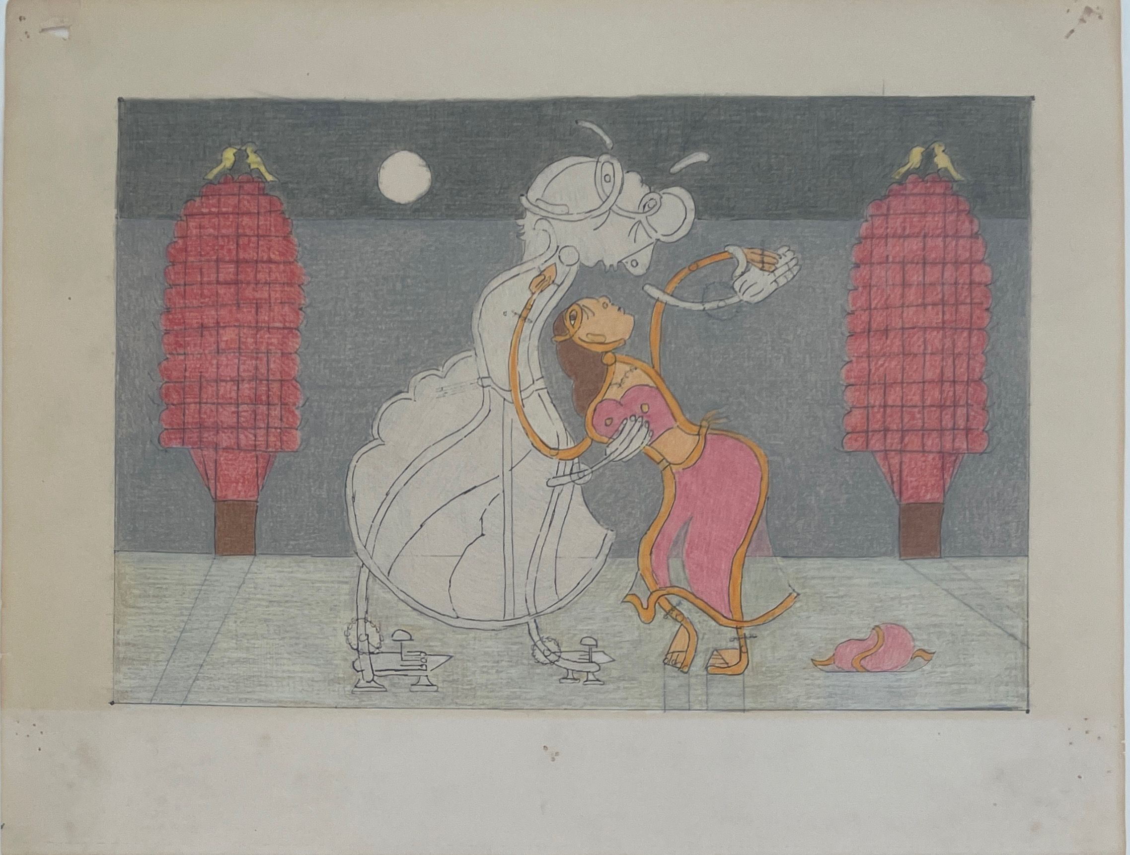 color study for Moon Meet May. "Moon" figure is opaque light blue, "May" is dressed in a pink and yellow dress. The background wall is a blue color and the ground is a light blue. trees in the background are red with a grid pattern. two yellow birds sit atop each of the two trees.Acquisition