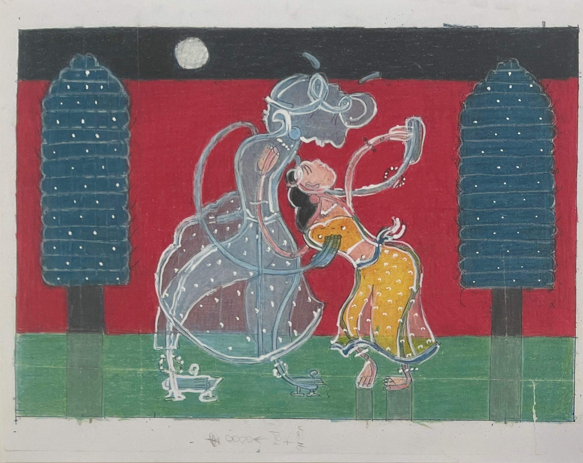 color study for Moon Meet May. Figures are outlined in white, Trees are a dark blue/green, red wall in back, very similar to finished pieceAcquisition