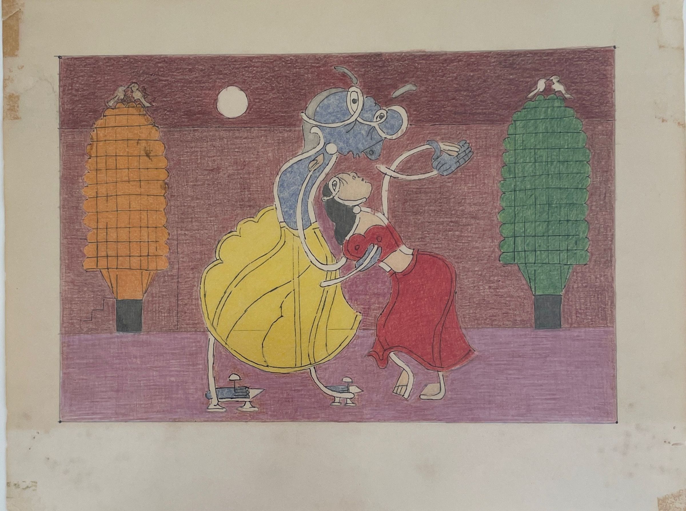 color study for Moon Meet May. foreground, middle ground and background are separated by a slight change in maroon. "Moon" figure is dark blue with a yellow skirt, "may" is in a red dress. trees in the back are orange and green with a grid pattern. Two tan birds sit atop the left tree and two white birds sit atop the right tree.Acquisition