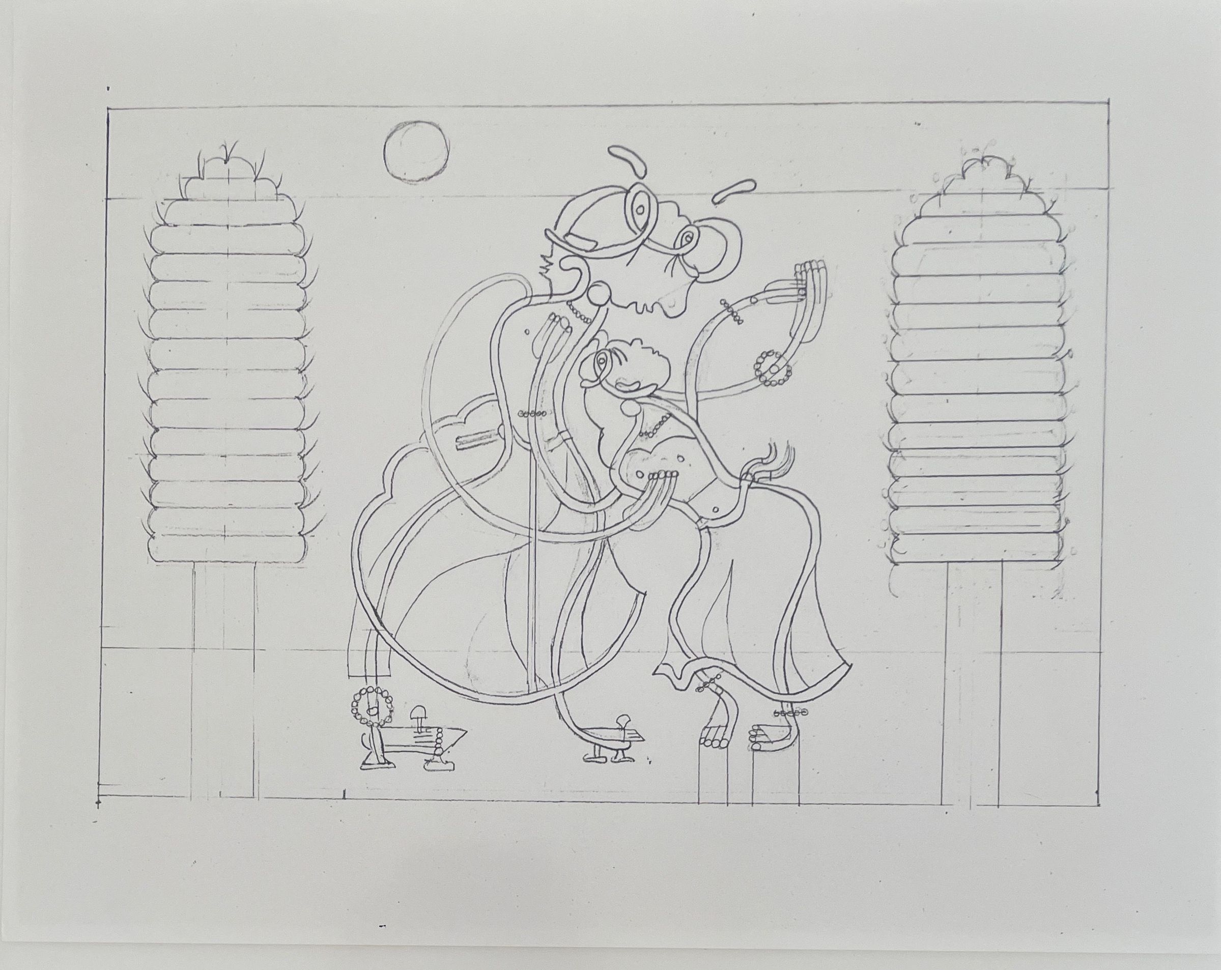 black and white study sketch for Moon Meet May. Trees have marks all over border of tree.