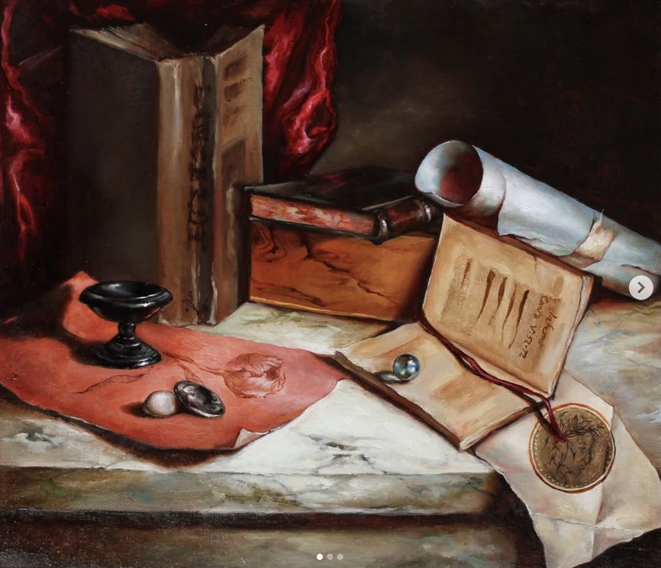Painting is in perfect condition. Frame holds minor scratches and little chipping on edges. Cotton hairs scattered across surface of painting.Created By