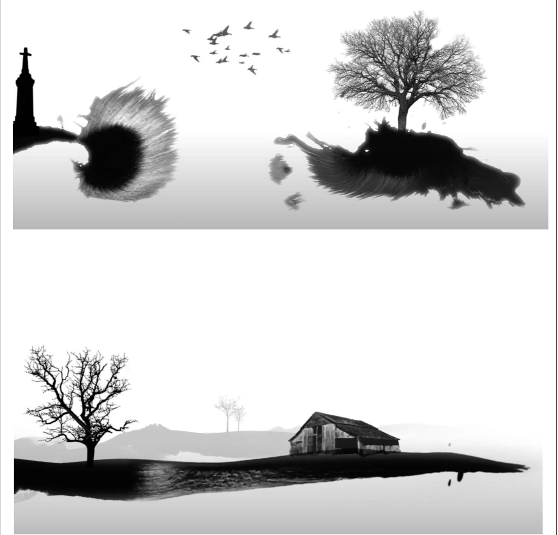 This video work was created in collaboration with Gothic-folk musical artists Manzanita Bones. Ink splashes were captured directly to video, and then digitally manipulated and edited to move the viewer through an ever-blooming and bleeding monochromatic rural landscape.Created By