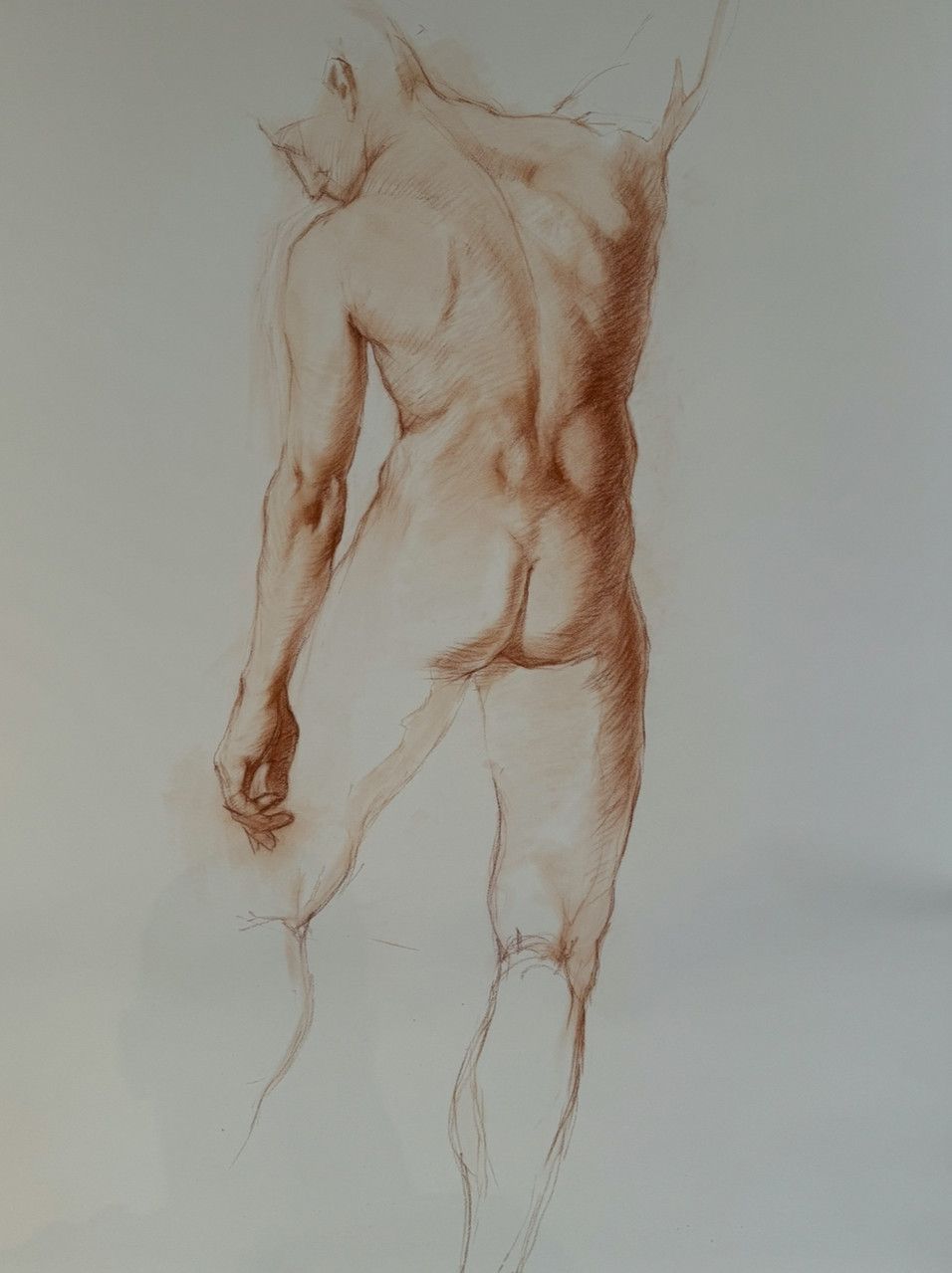 Drawing of the back of a figure. Drawn on a roll of paper, the rest of the roll rests on the floor.Type of Drawing
