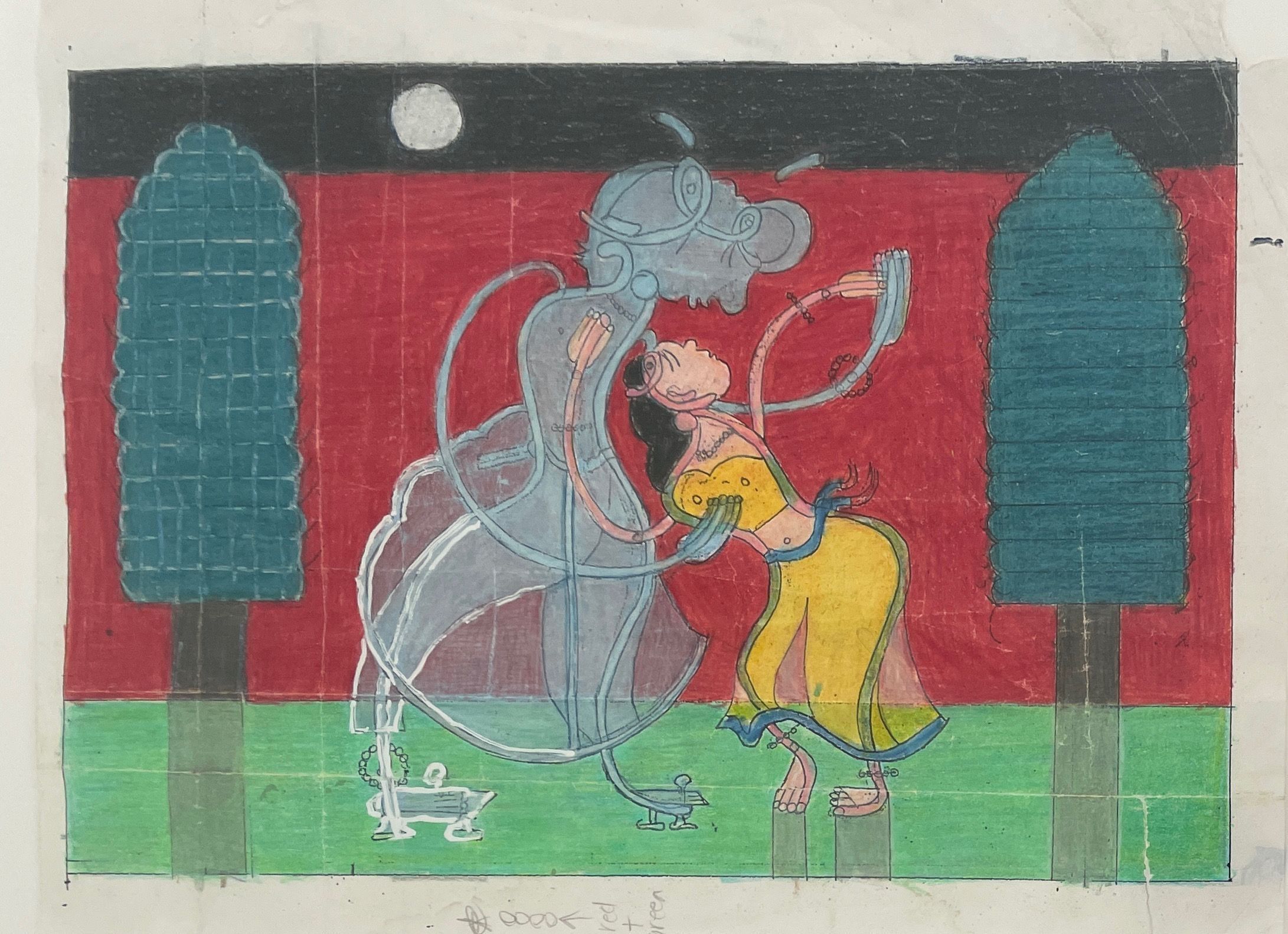 color study for Moon Meet May. colors are very similar to finished piece. bottom left of 'Moon' figure is outlined in white.