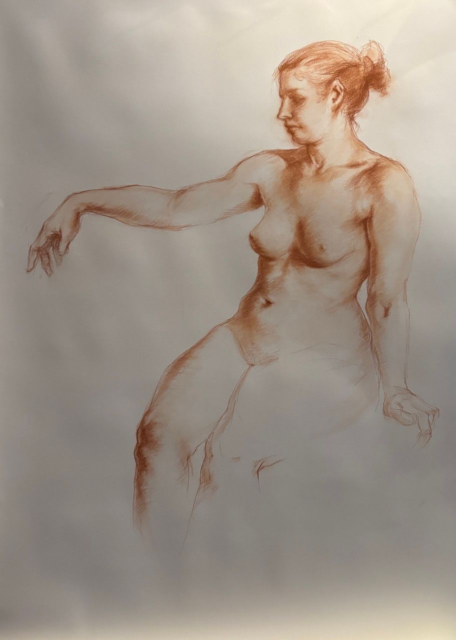 Drawing of a female figure with outstretched arm. Drawn on a roll of paper, excess paper rests on the floor.Type of Drawing