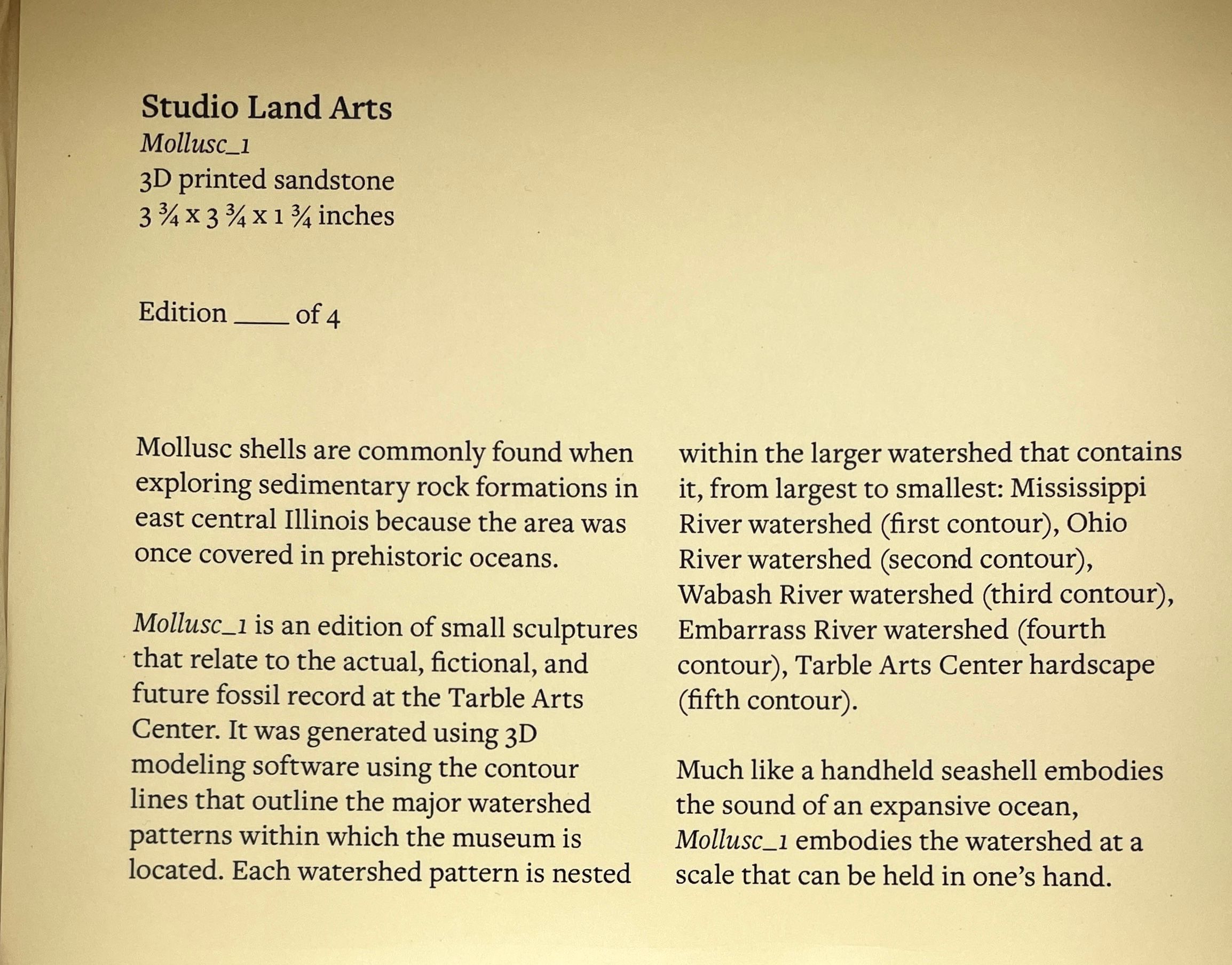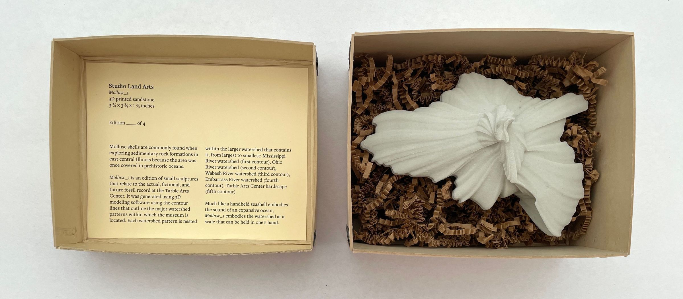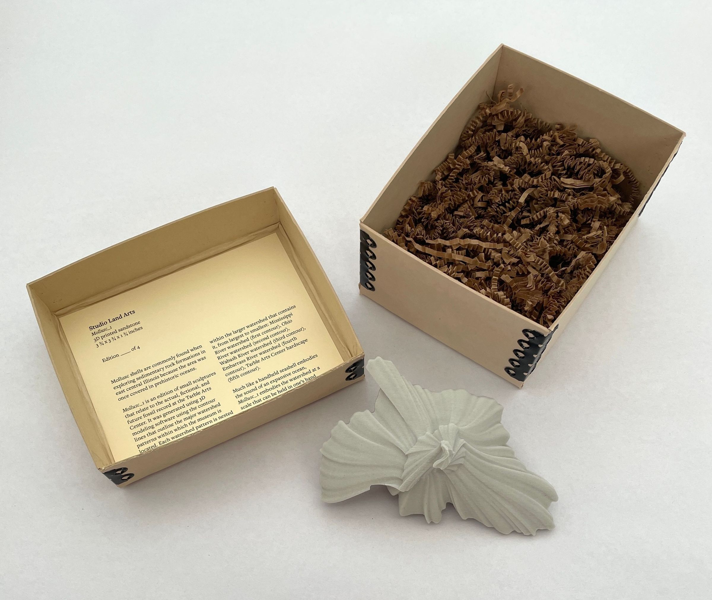Mollusc shells are commonly found when exploring sedimentary rock formations in east central Illinois because the area was once covered in prehistoric oceans. Mollusc_1 is an edition of small sculptures that relate to the actual, fictional, and future fossil record at the Tarble Arts Center. It was generated using 3D modeling software using the contour lines that outline the major watershed patterns within which the museum is located.