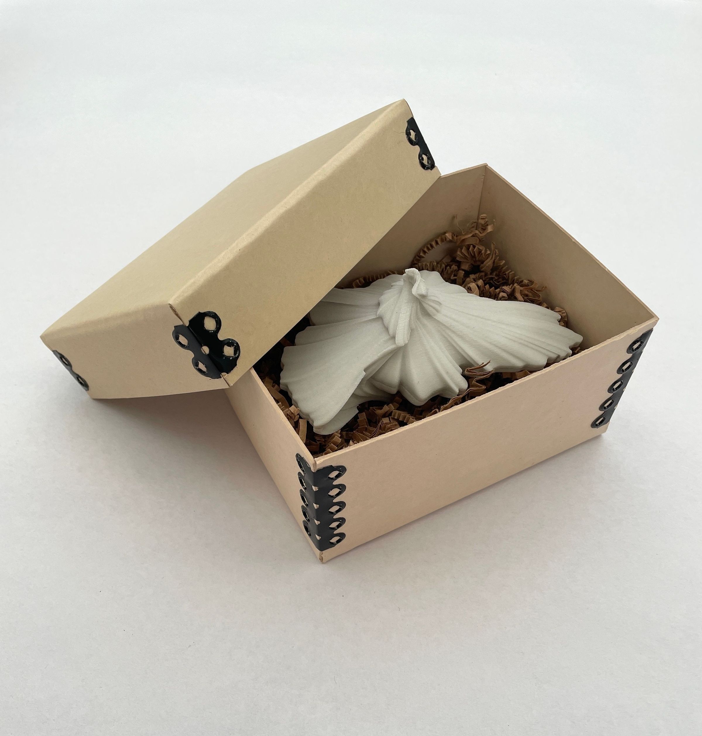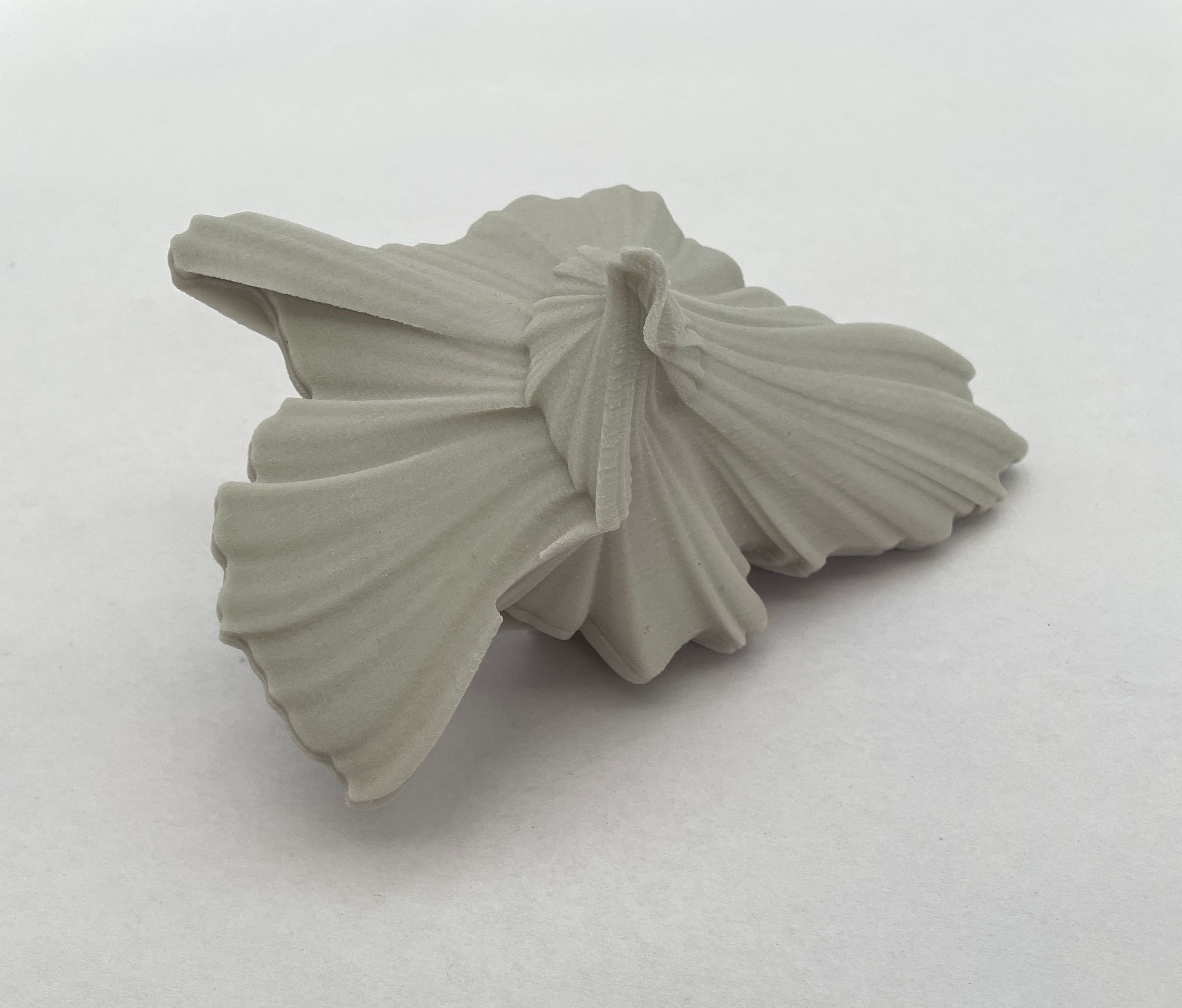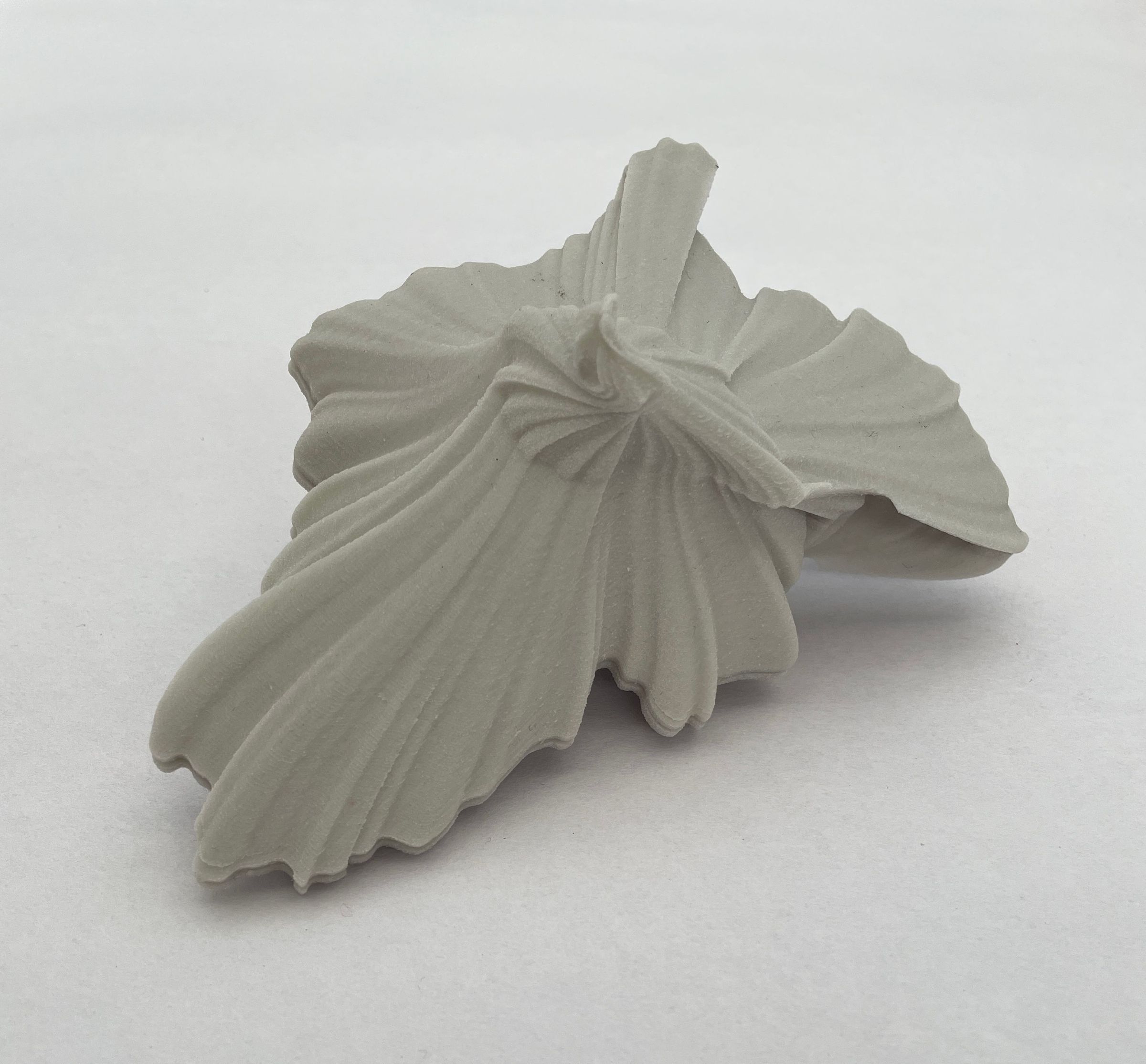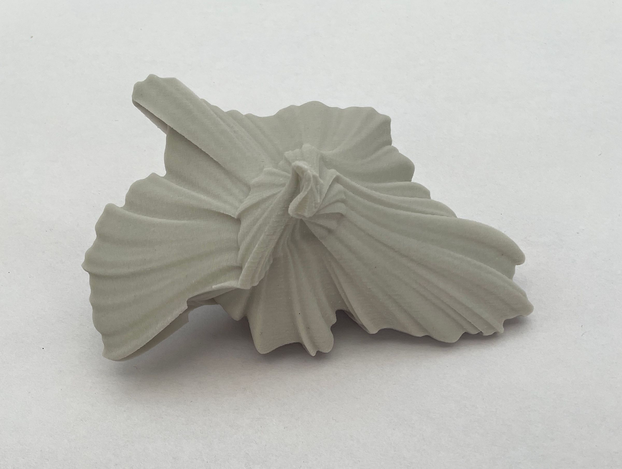 Mollusc shells are commonly found when exploring sedimentary rock formations in east central Illinois because the area was once covered in prehistoric oceans. Mollusc_1 is an edition of small sculptures that relate to the actual, fictional, and future fossil record at the Tarble Arts Center. It was generated using 3D modeling software using the contour lines that outline the major watershed patterns within which the museum is located.