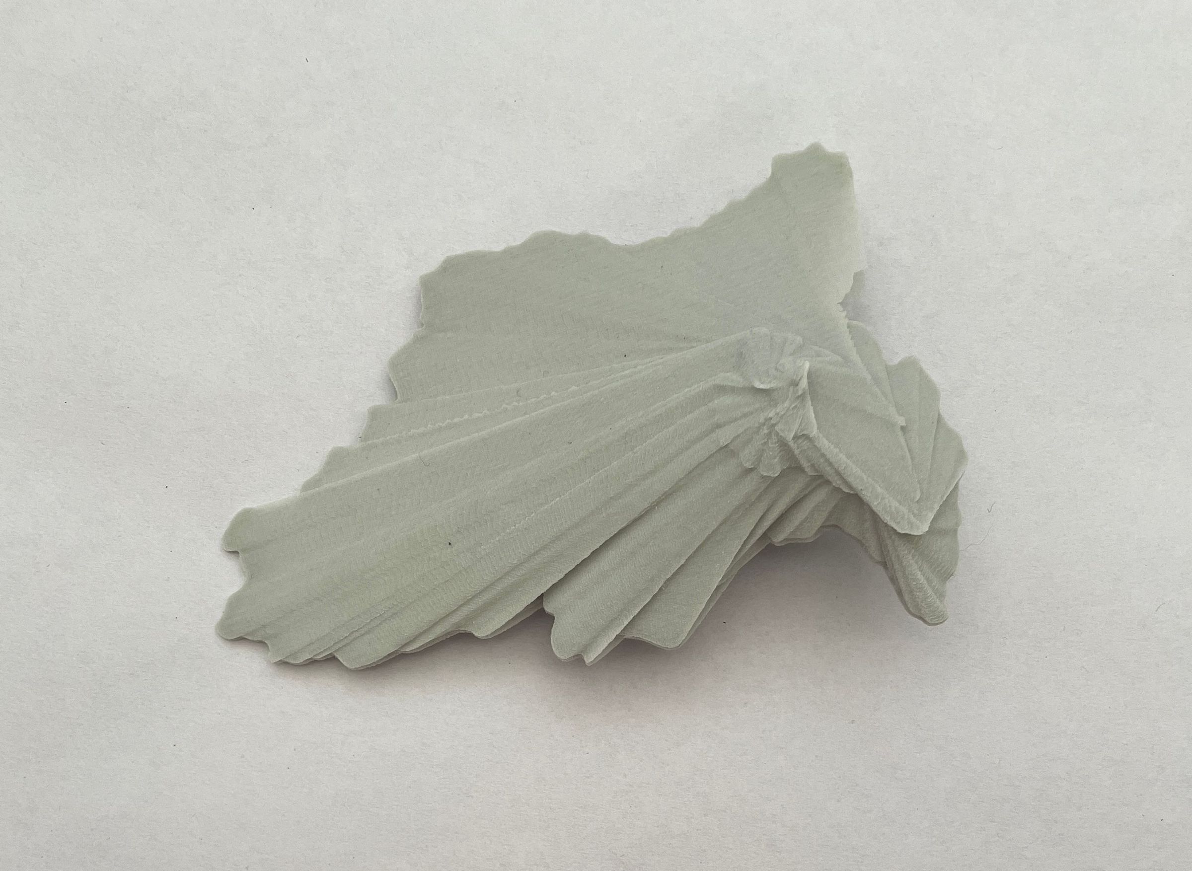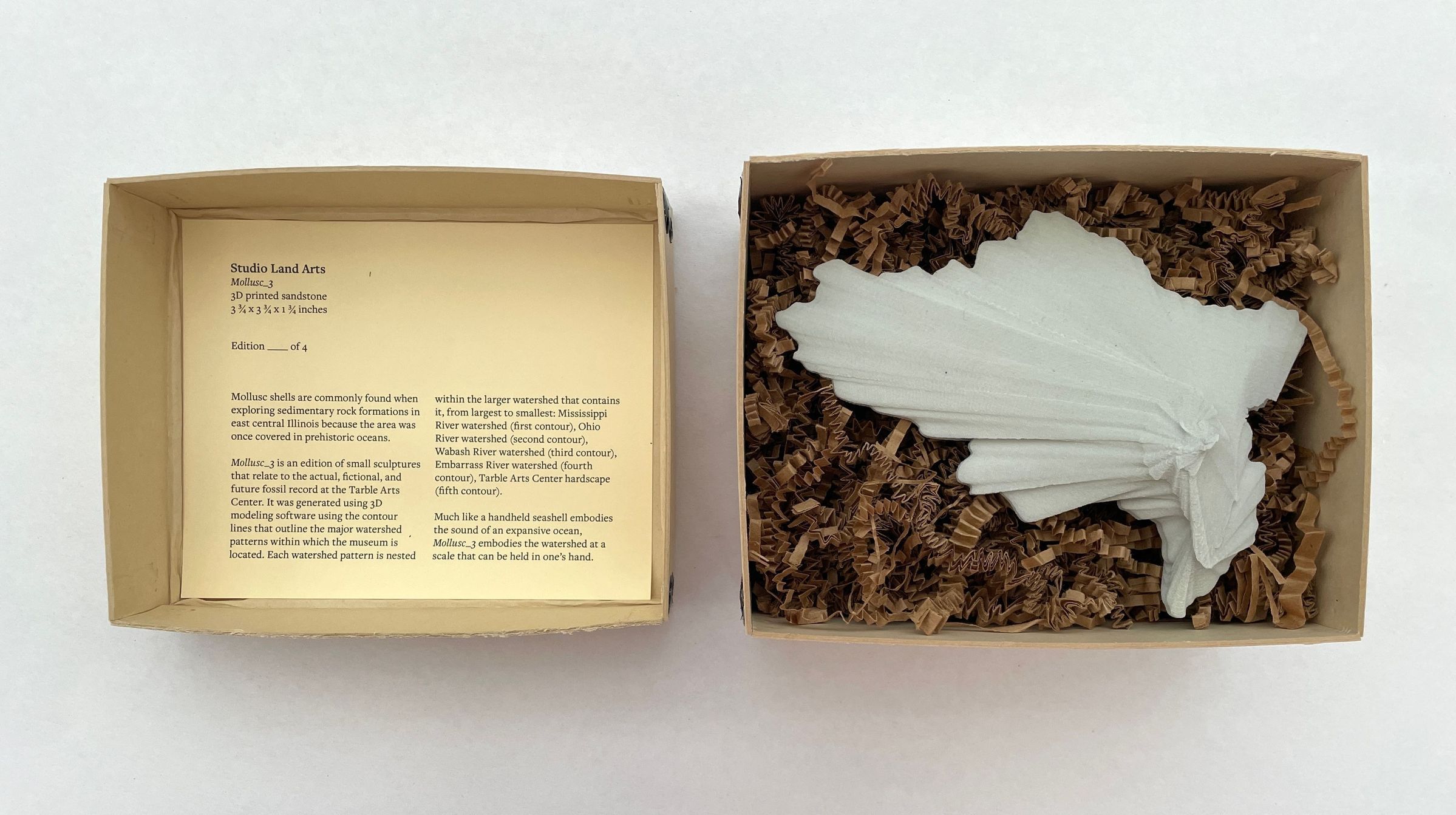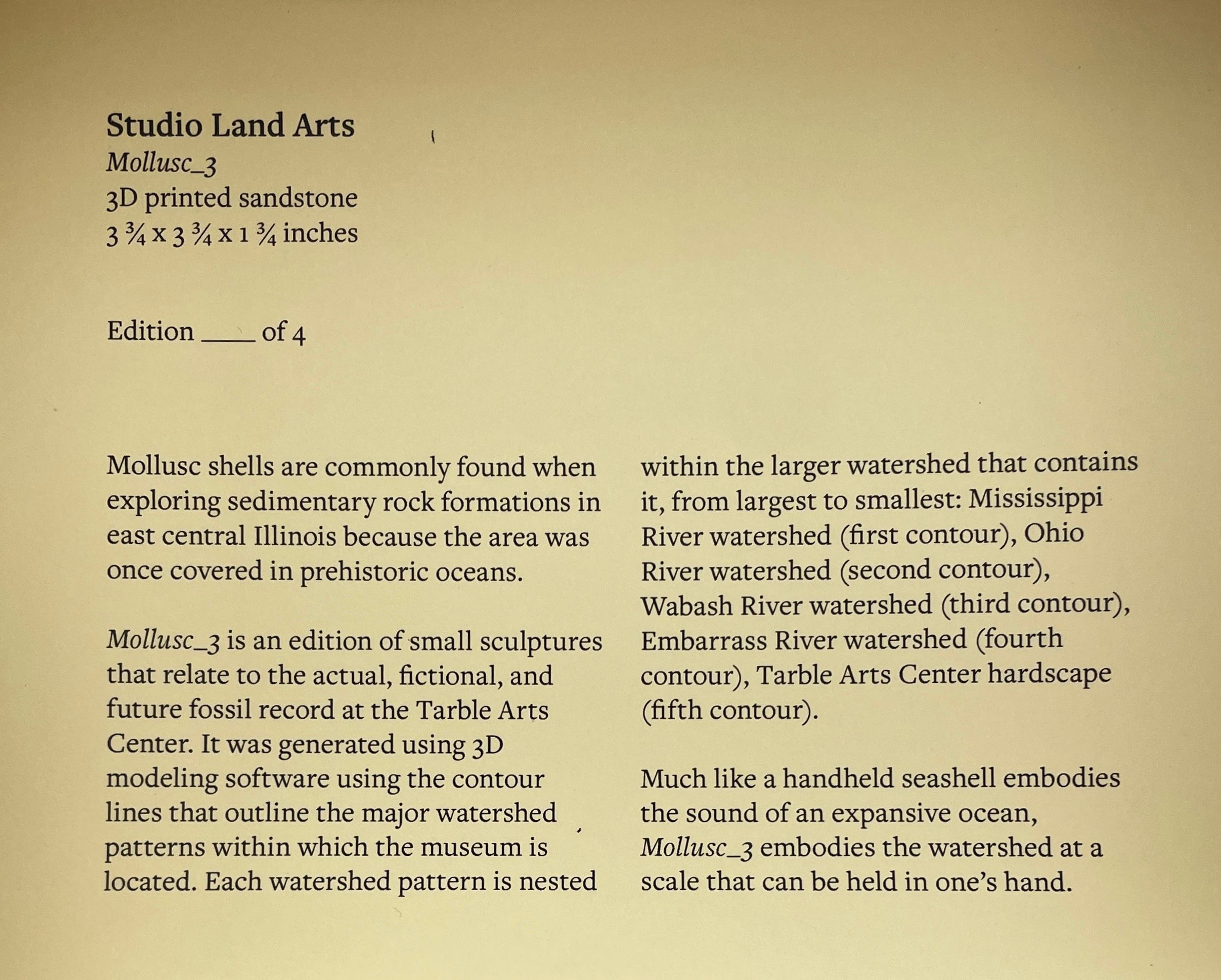 Mollusc shells are commonly found when exploring sedimentary rock formations in east central Illinois because the area was once covered in prehistoric oceans. Mollusc_1 is an edition of small sculptures that relate to the actual, fictional, and future fossil record at the Tarble Arts Center. It was generated using 3D modeling software using the contour lines that outline the major watershed patterns within which the museum is located.