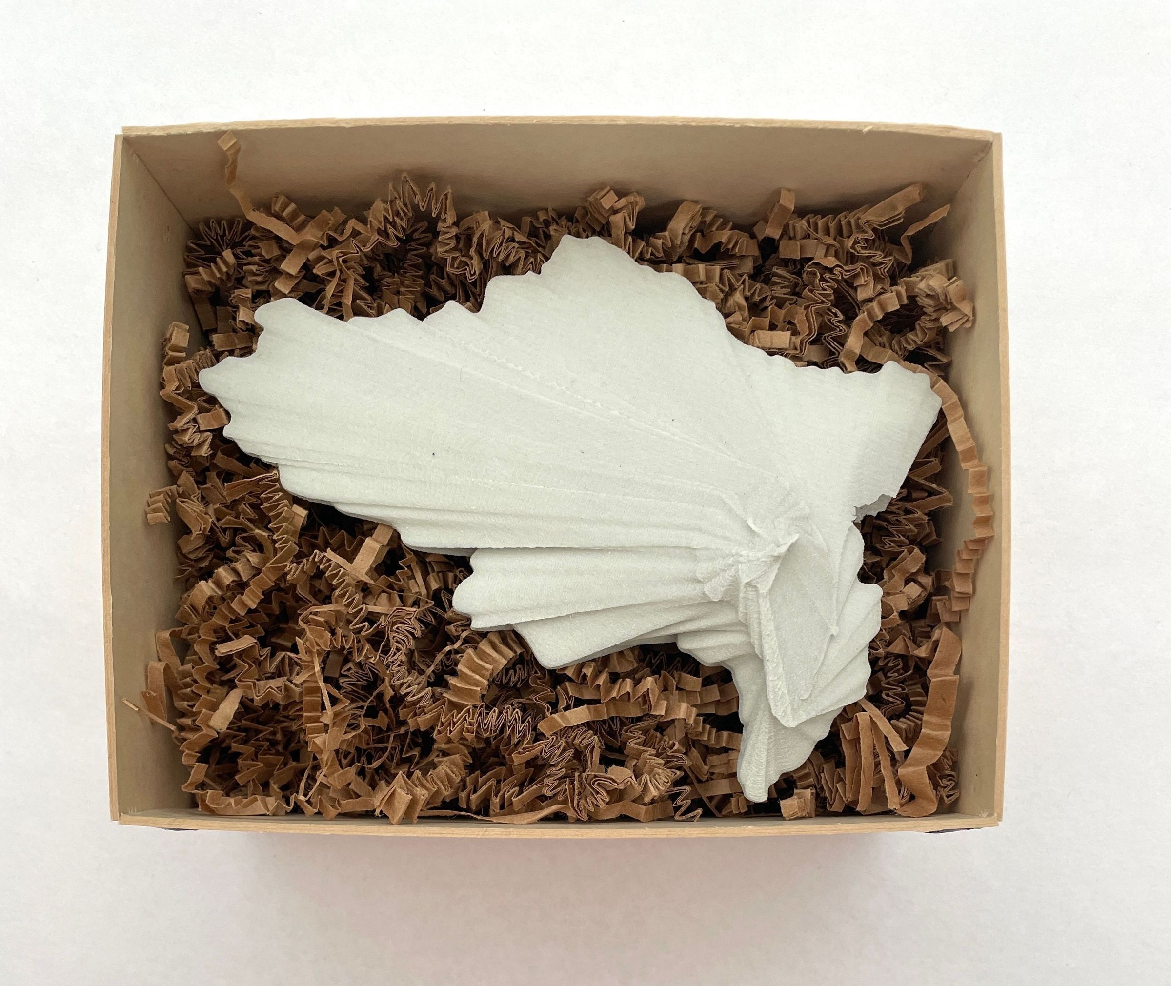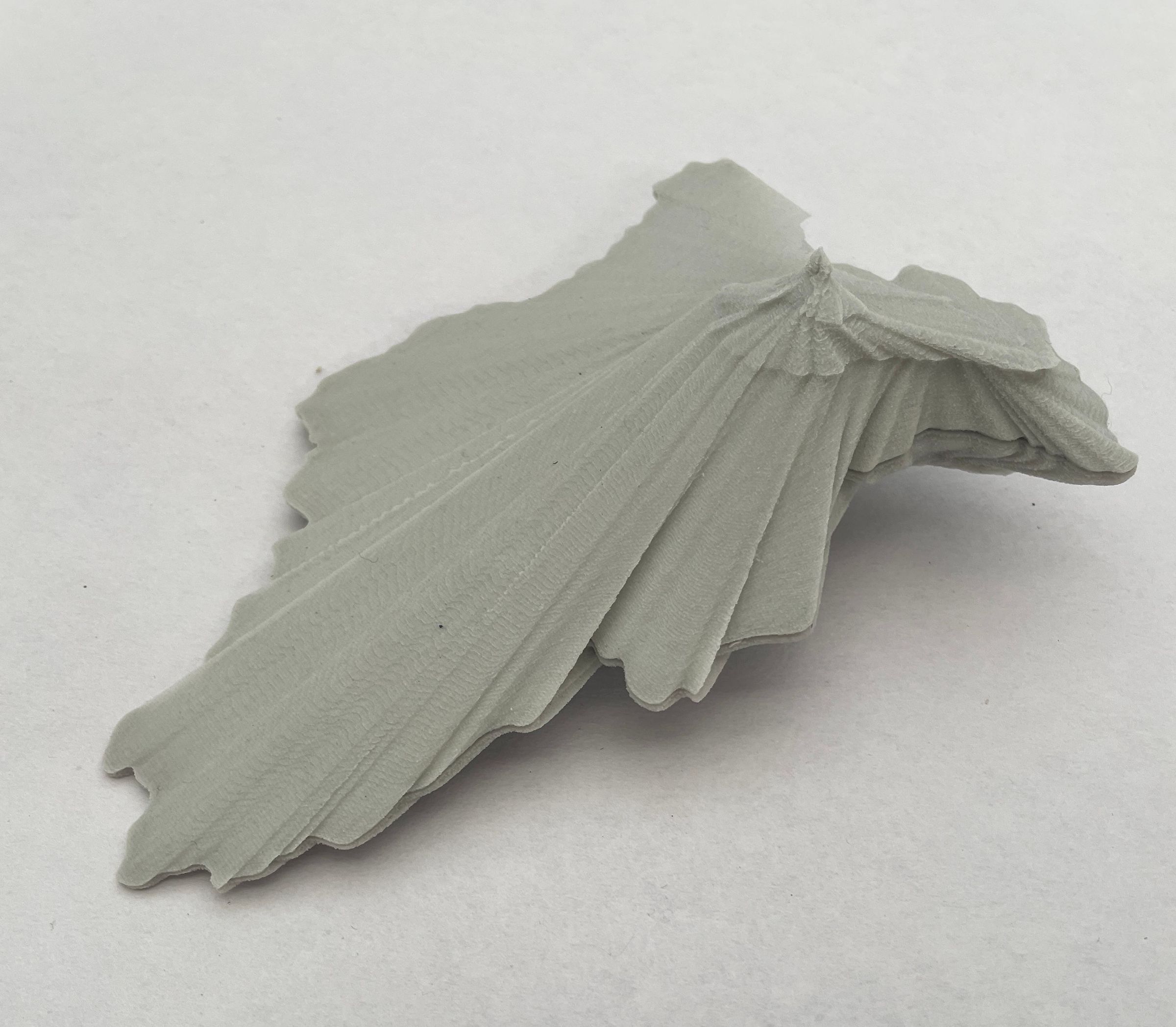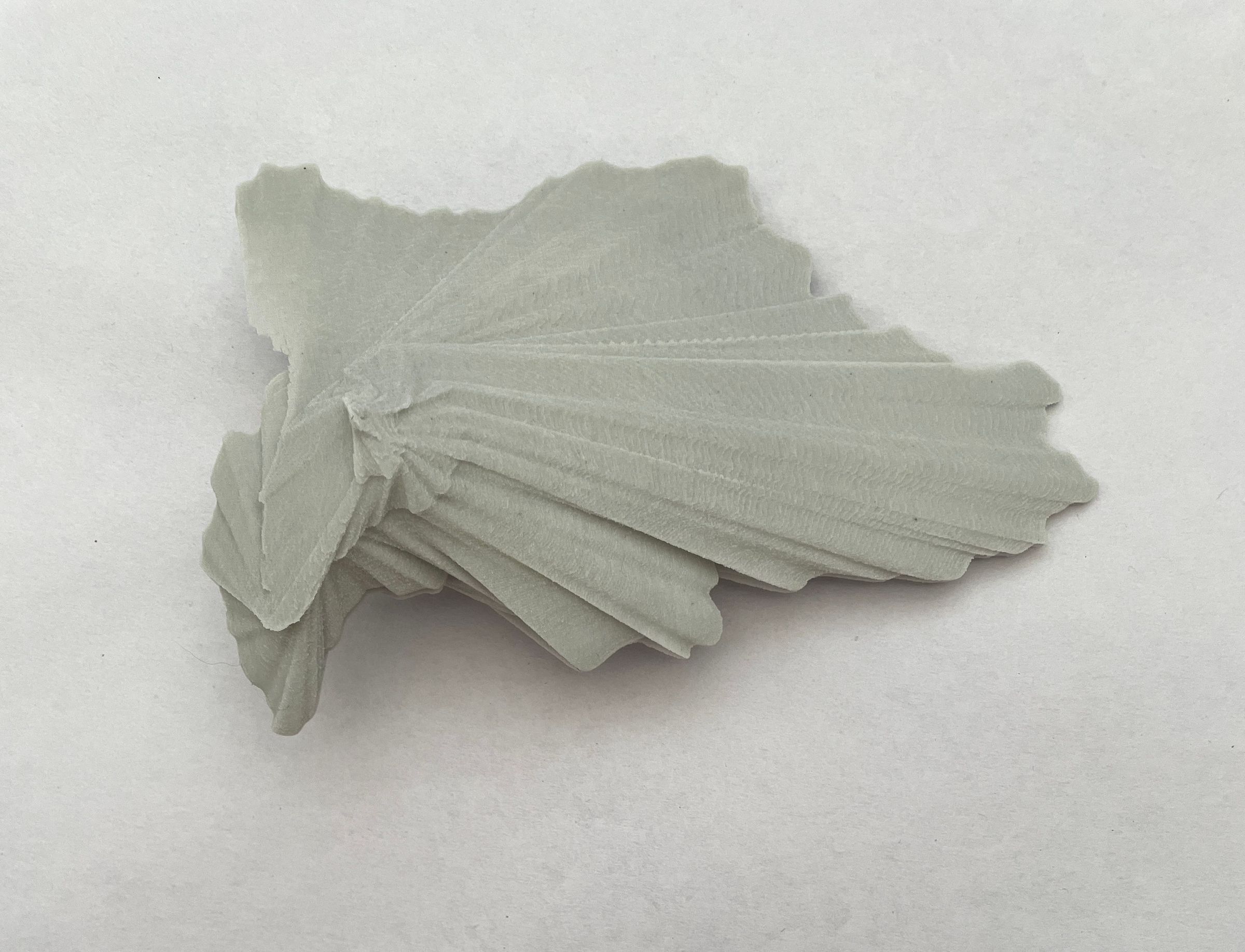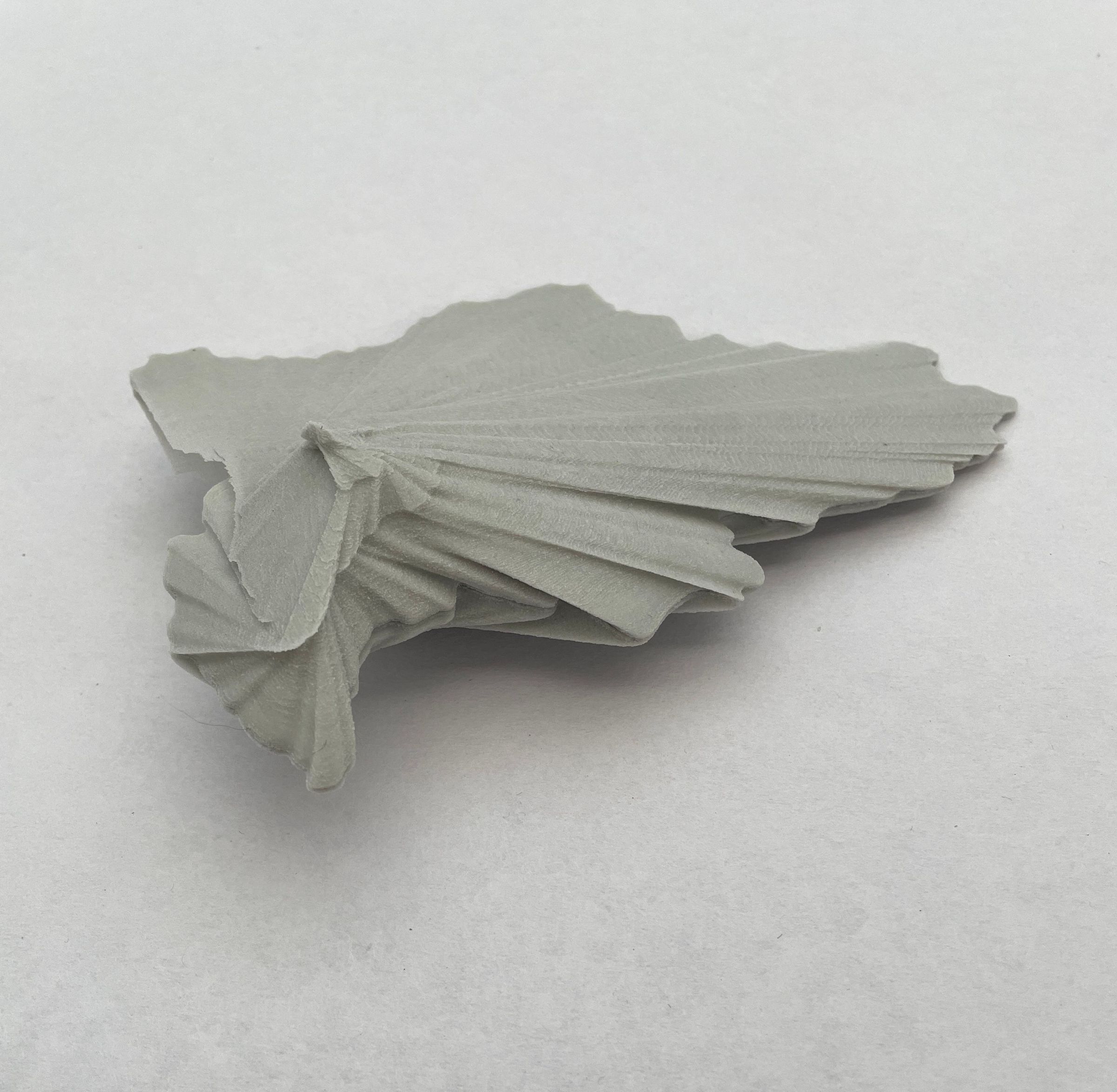 Mollusc shells are commonly found when exploring sedimentary rock formations in east central Illinois because the area was once covered in prehistoric oceans. Mollusc_1 is an edition of small sculptures that relate to the actual, fictional, and future fossil record at the Tarble Arts Center. It was generated using 3D modeling software using the contour lines that outline the major watershed patterns within which the museum is located.