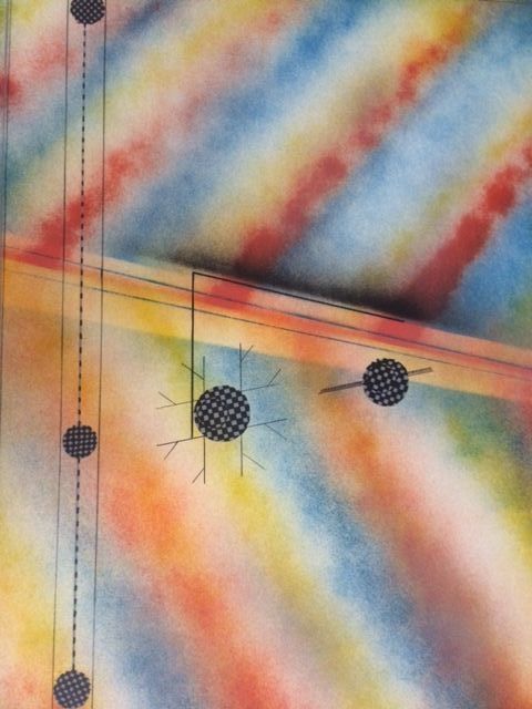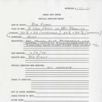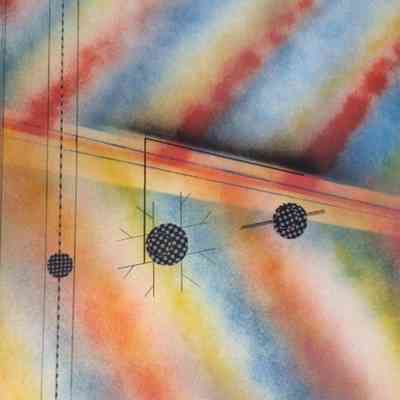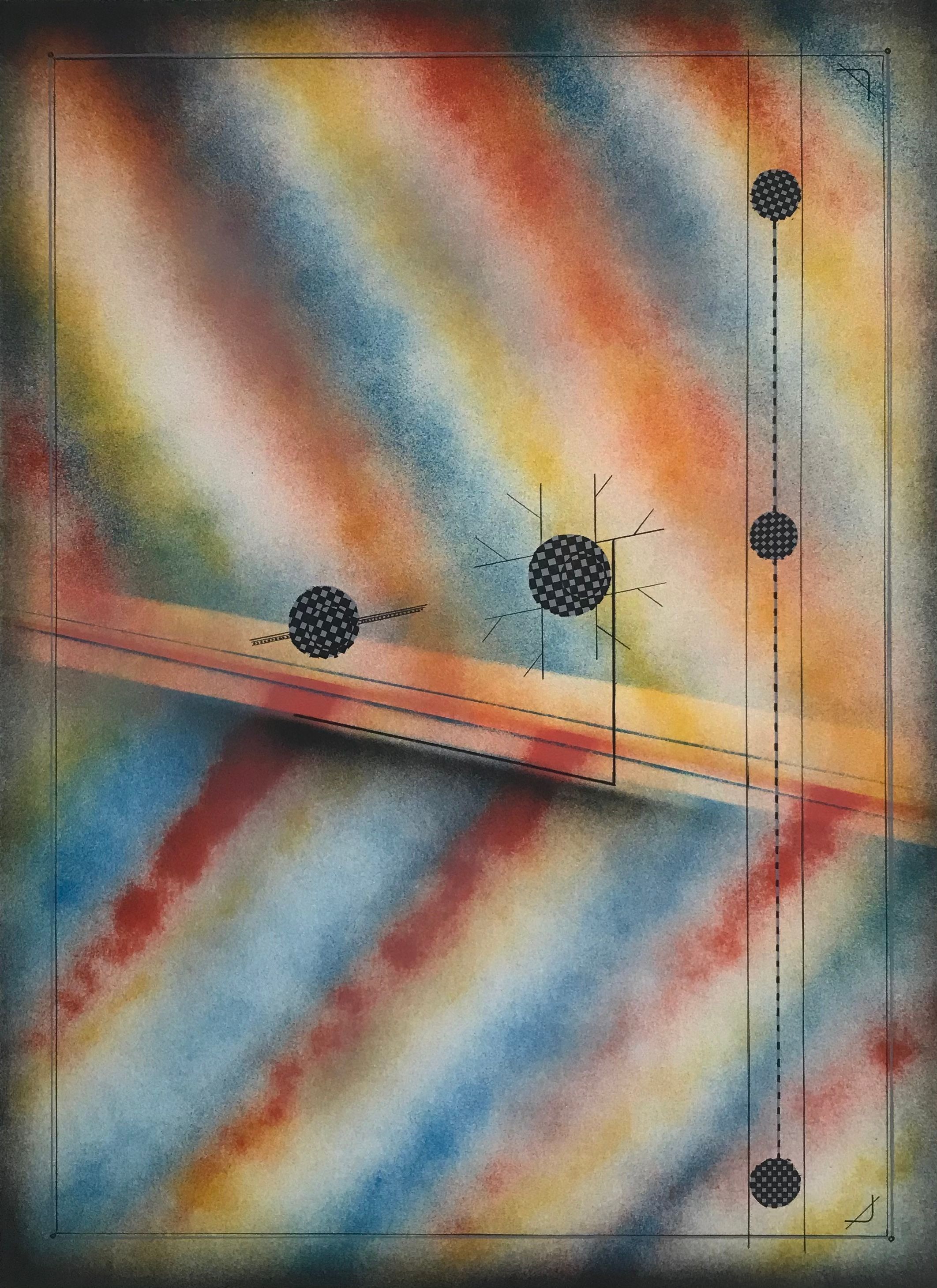Red, yellow, blue background, line border, contains 5 checkered circles 2 vertical blue lines divide the plane.Collection