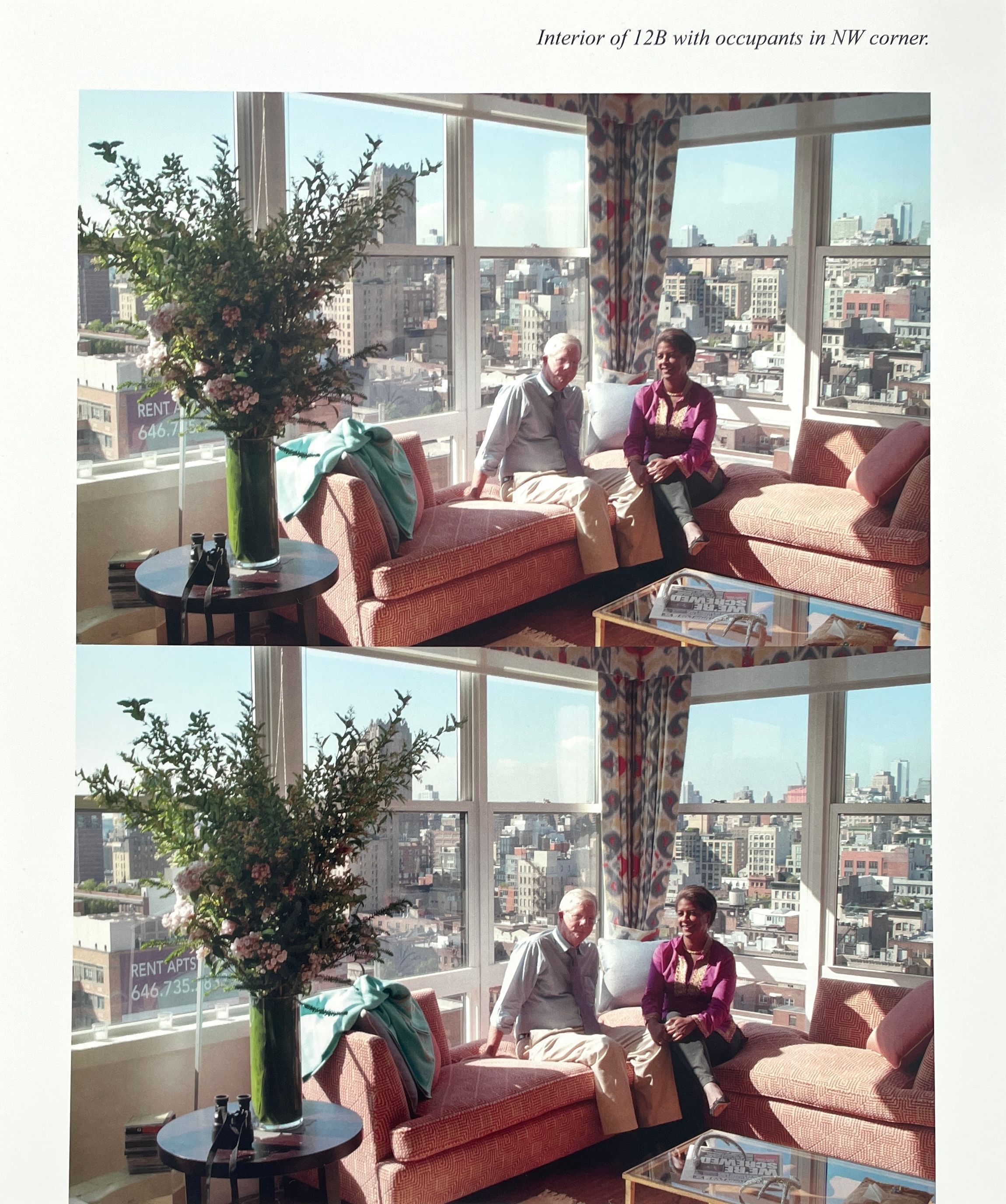 Interior of an apartment overlooking to city with occupants in NW corner sitting on a red couch. Pl Portfolio of Humaliwo Chambers Vol I 1 of 2 images. two nearly identical images run length wise for stereoscopic viewer.Collection