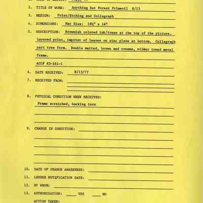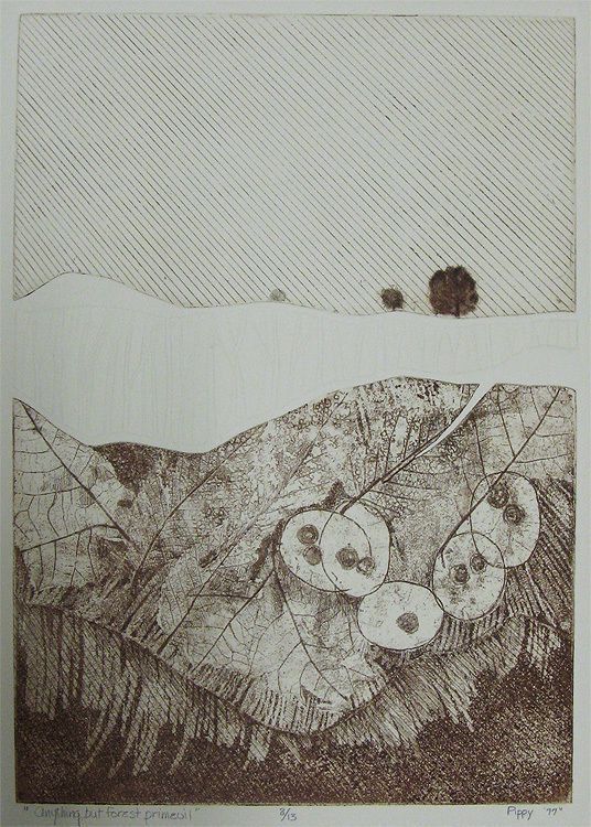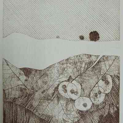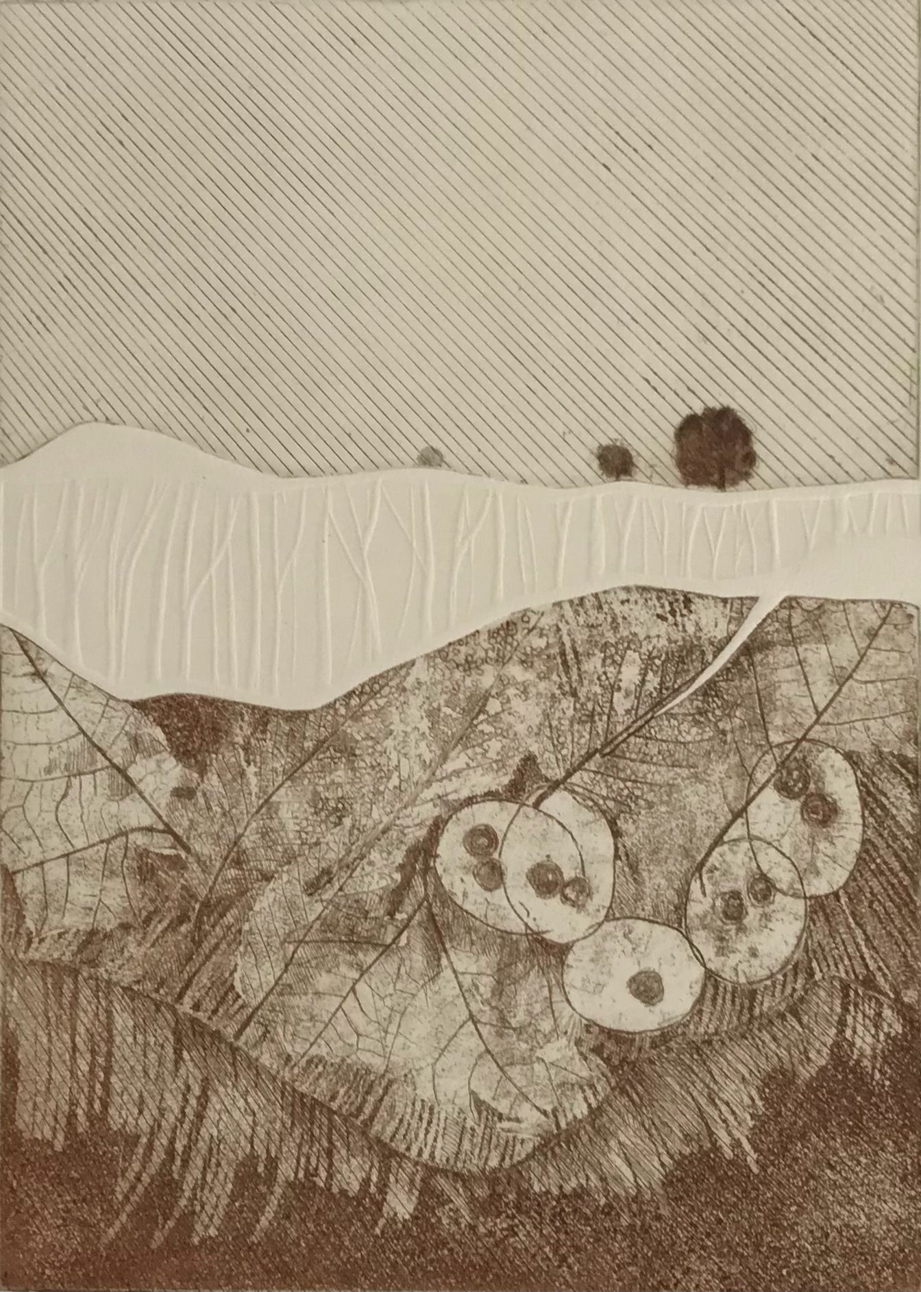 Brownish colored ink/trees at top of the picture. Layered print, imprint of leaves on zinc plate at bottom. Collagraph part tree form. Double matted, brown and cream, silver toned metal frame.Artwork Details