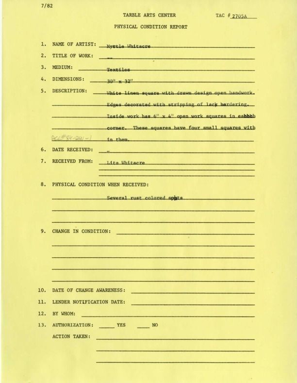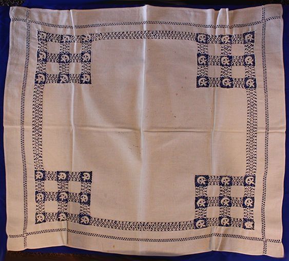 Card table cover. White linen square with 2 rows drawn design open handwork. Inside work has 6" x 4" open work square in each corner. Theses squares have 4 small squares within them. Drawn work design.Collection