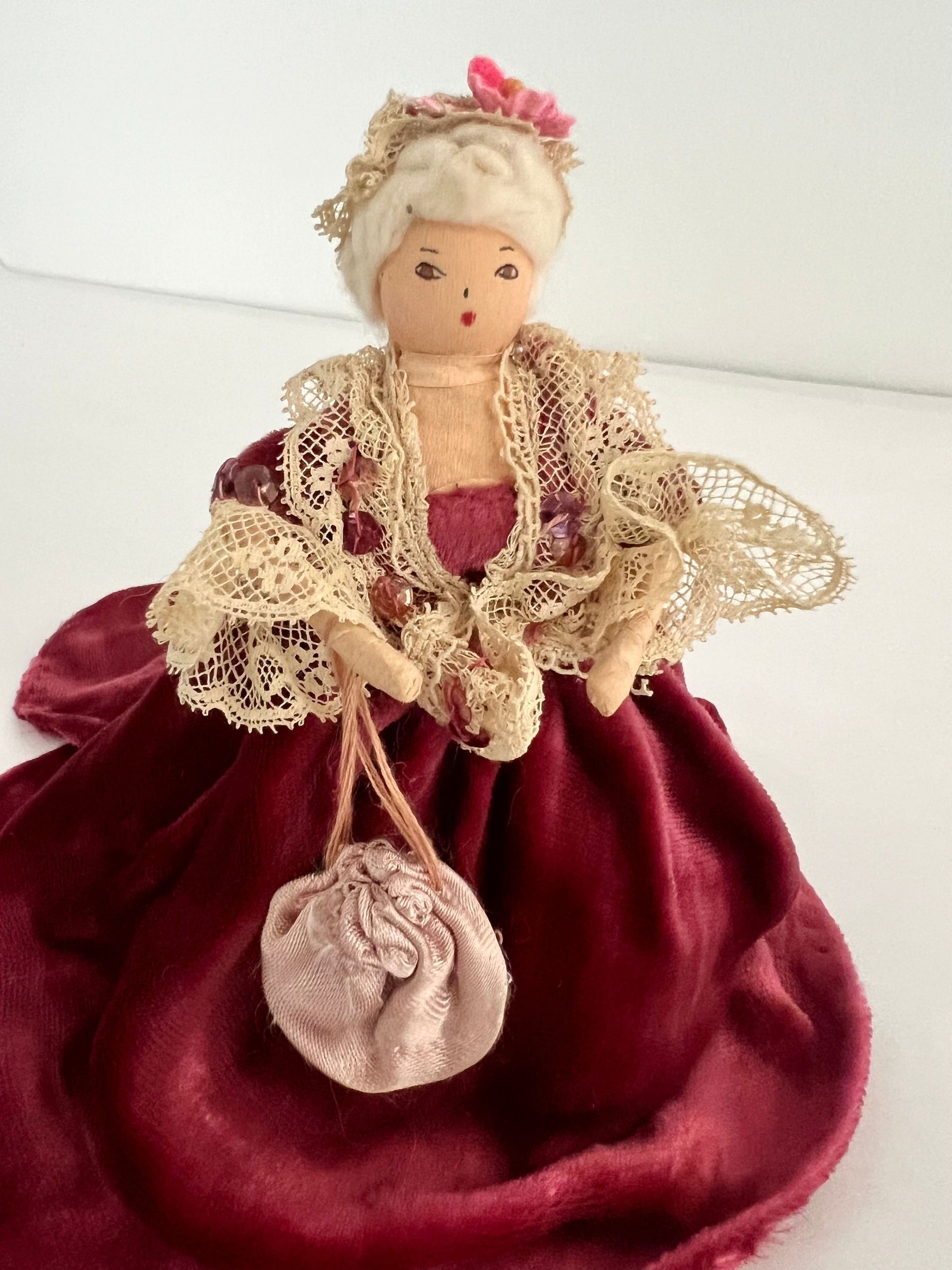 Doll is portrayed in a sitting position. Wears a rose velvet long dress with an extensive train behind. Lace around bodice and sleeves, rose sequin, carries pink drawstring handbag with sequins. White hair, creme lace cap with print ribbon and flower.Collection