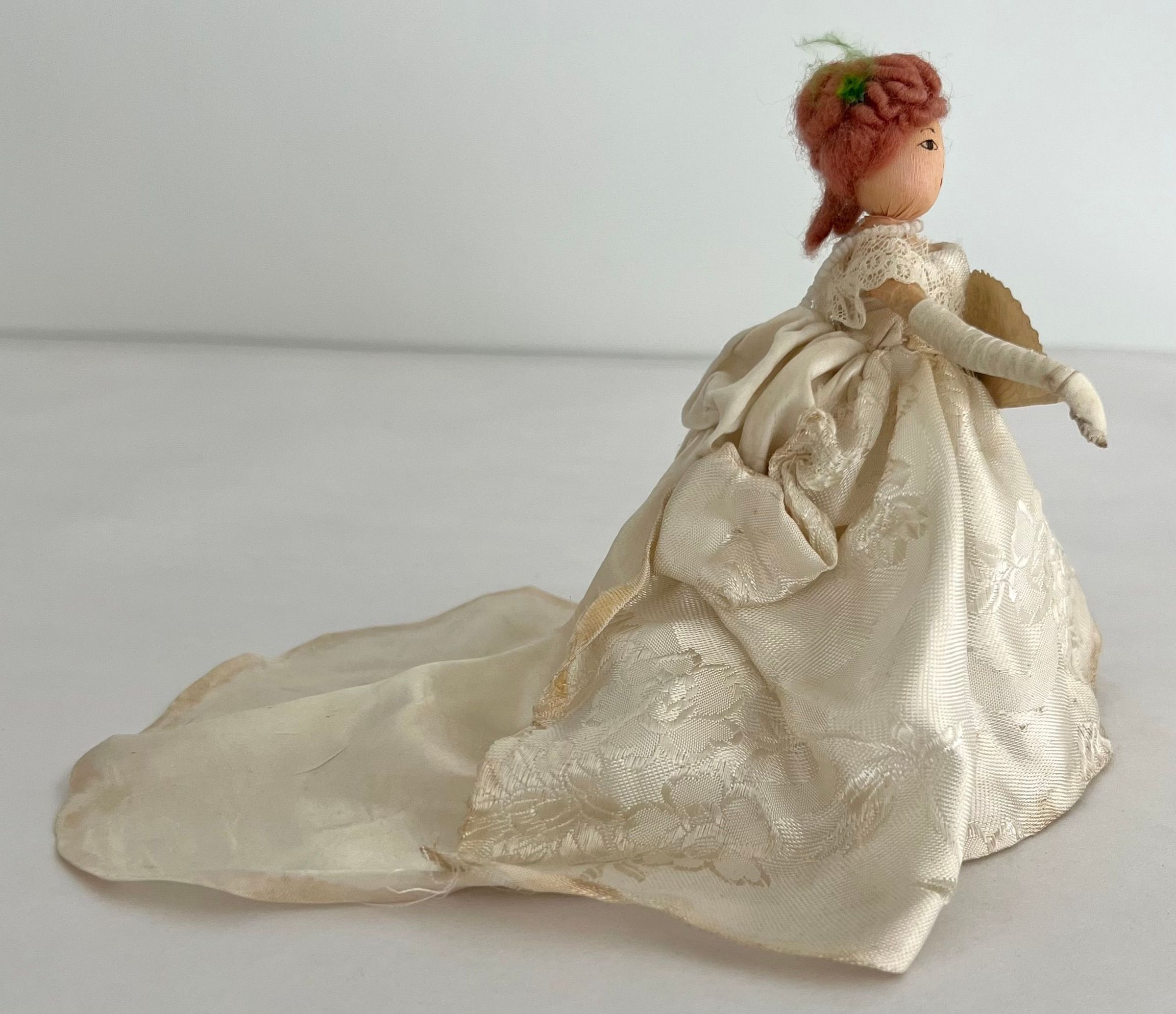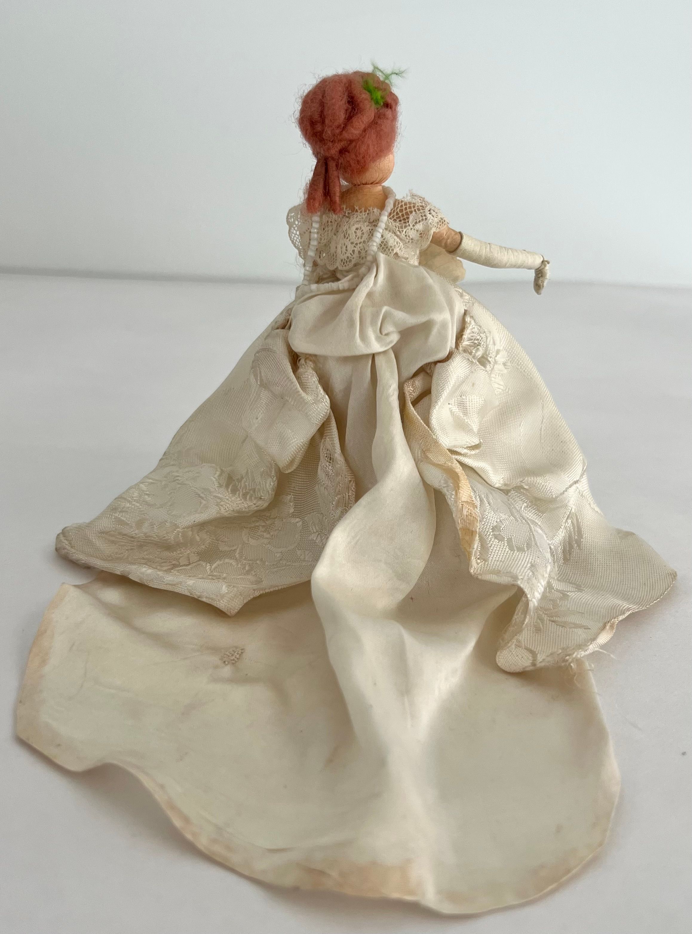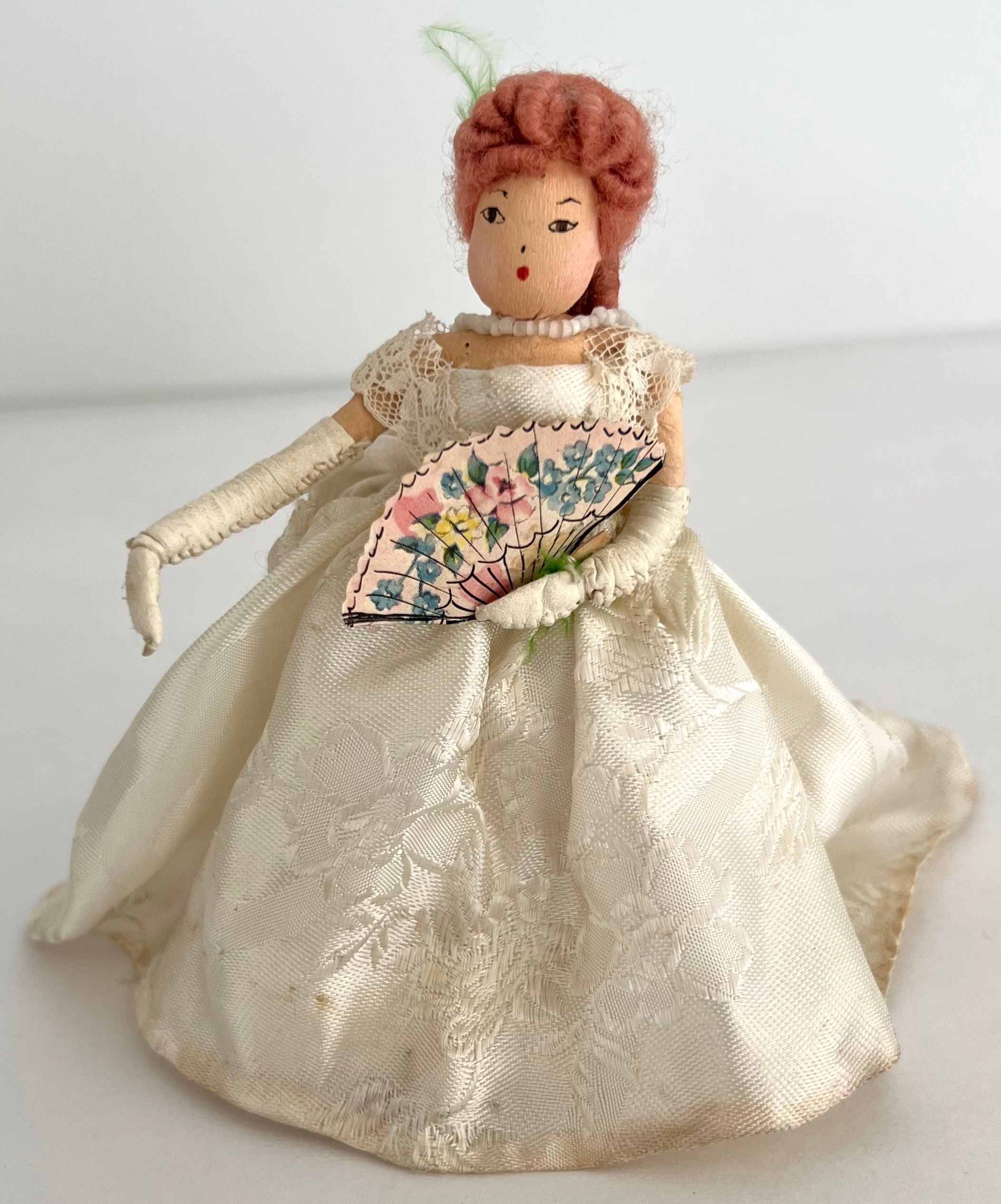 Standing position. Wears brownish-pink toned satin gown with brownish velvet panel in front. Horizontal strips of creme lace circle neck, catch at waist, and descend length of dress. Sequins accent lacing. Long puffed sleeves with ruffled cuffs. Long strand of pink beads worn. Grey hair worn on top of head.Collection