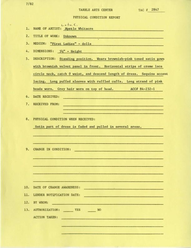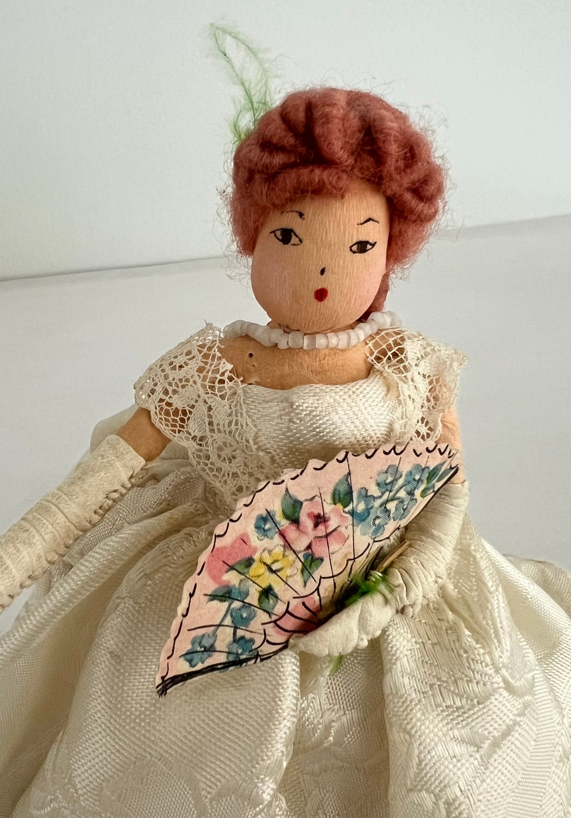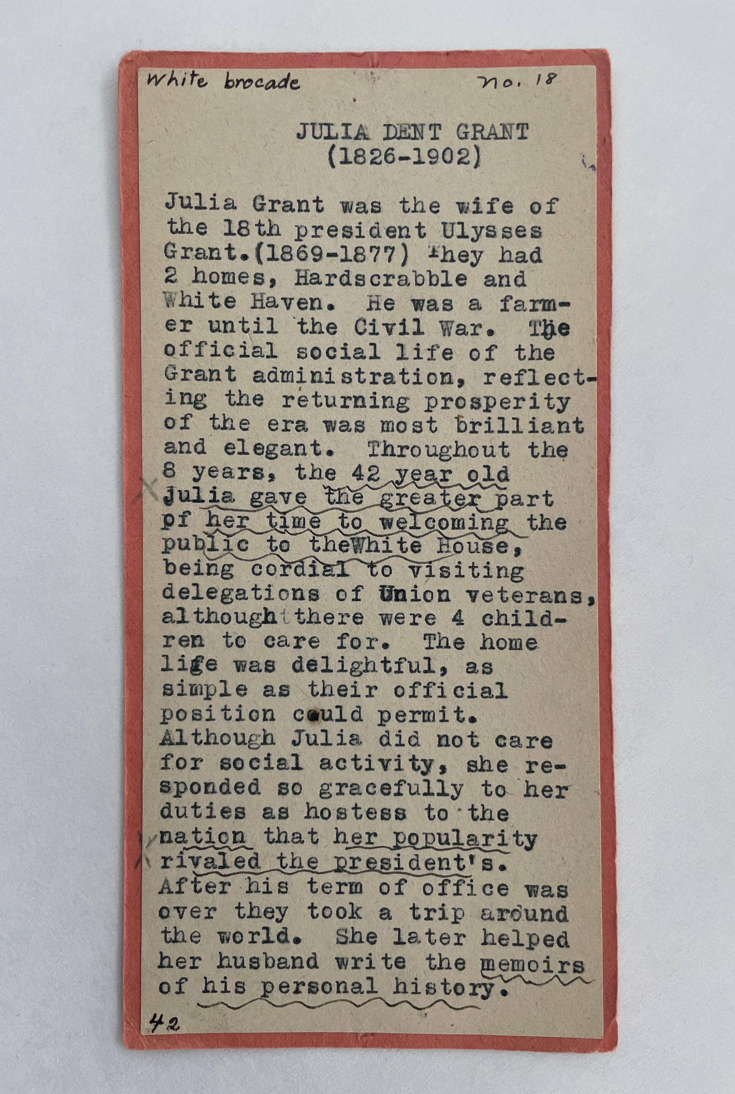 Standing position. Wears brownish-pink toned satin gown with brownish velvet panel in front. Horizontal strips of creme lace circle neck, catch at waist, and descend length of dress. Sequins accent lacing. Long puffed sleeves with ruffled cuffs. Long strand of pink beads worn. Grey hair worn on top of head.Collection