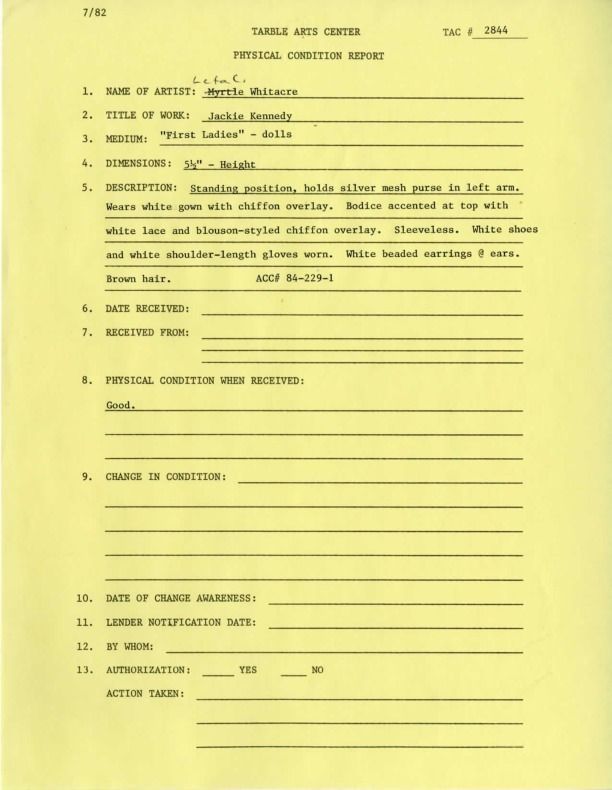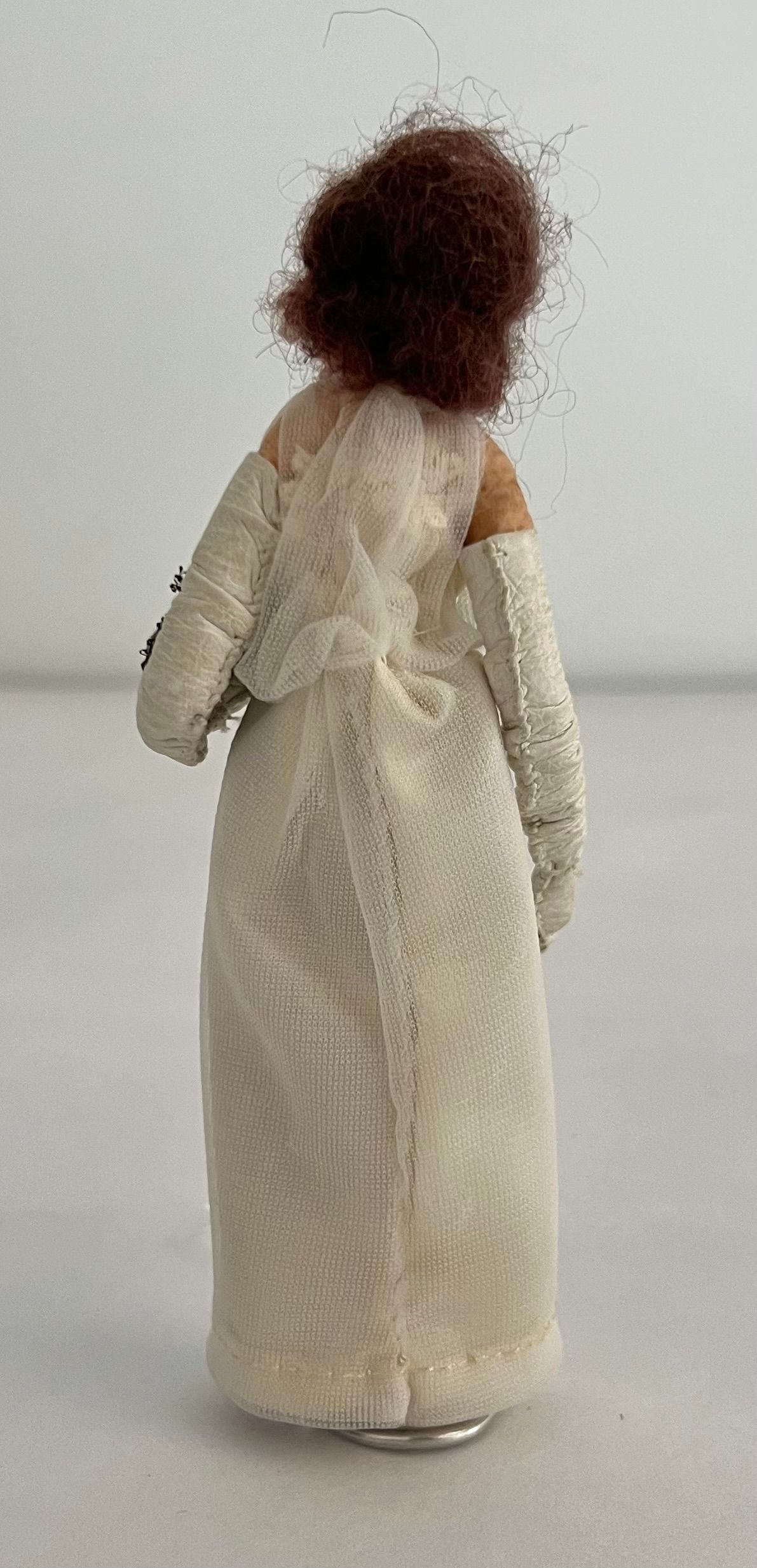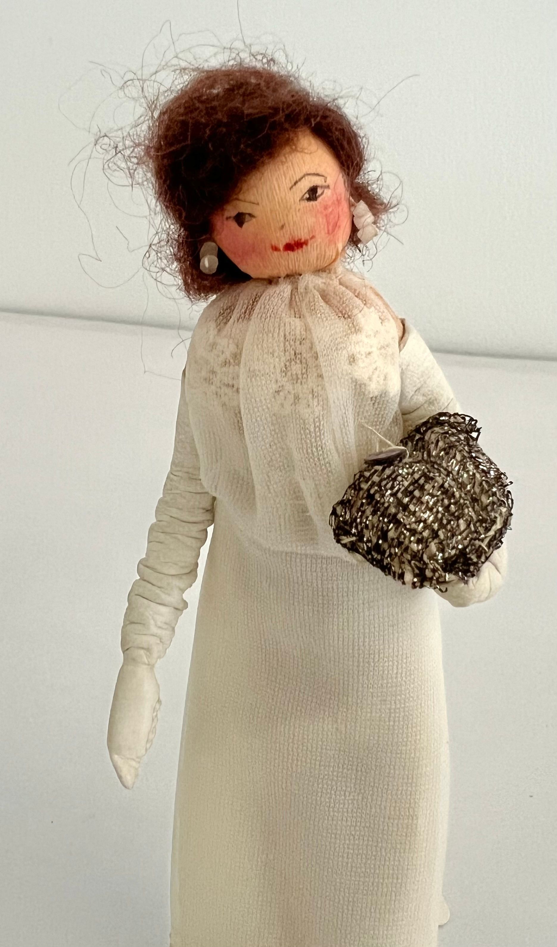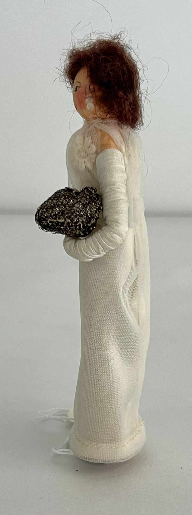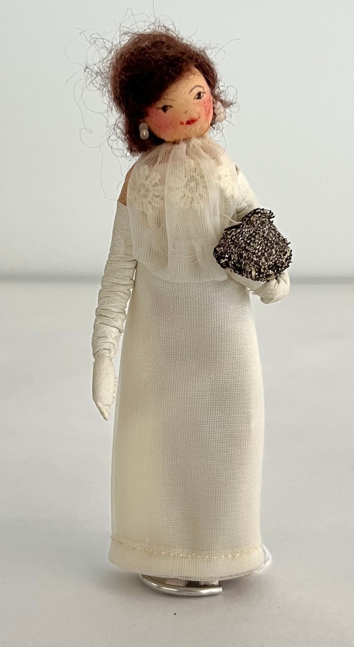 Standing position, holds silver mesh purse in left arm. Wears white gown with chiffon overlay. Bodice accented at top with white lace and blouson-styled chiffon overlay. Sleeveless. White shoes and white shoulder-length gloves worn. White beaded earrings at ears. Brown hair.Collection