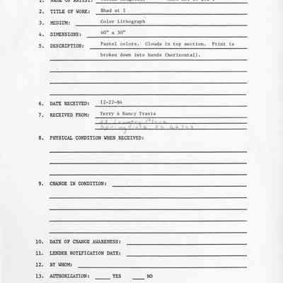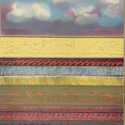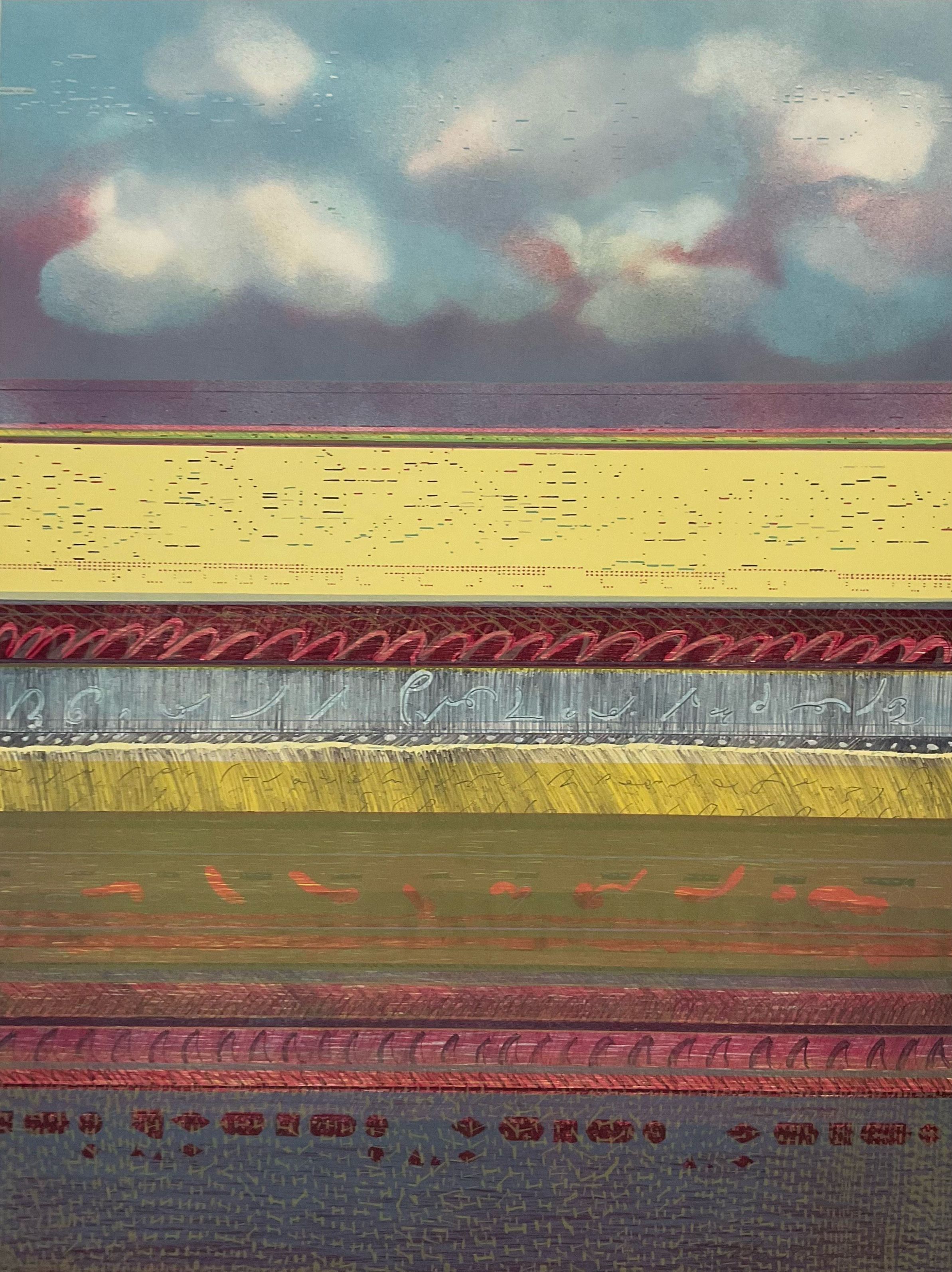 Vertical picture of 9 horizontal bands of color and markings: blue, purple, yellow/pink/blue, pink/light pink blue-gray/shorthand, yellow/shorthand characters green/orange, pink/purple blue/green. Pastel colors. Clouds in top section.Collection