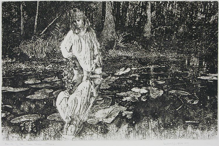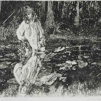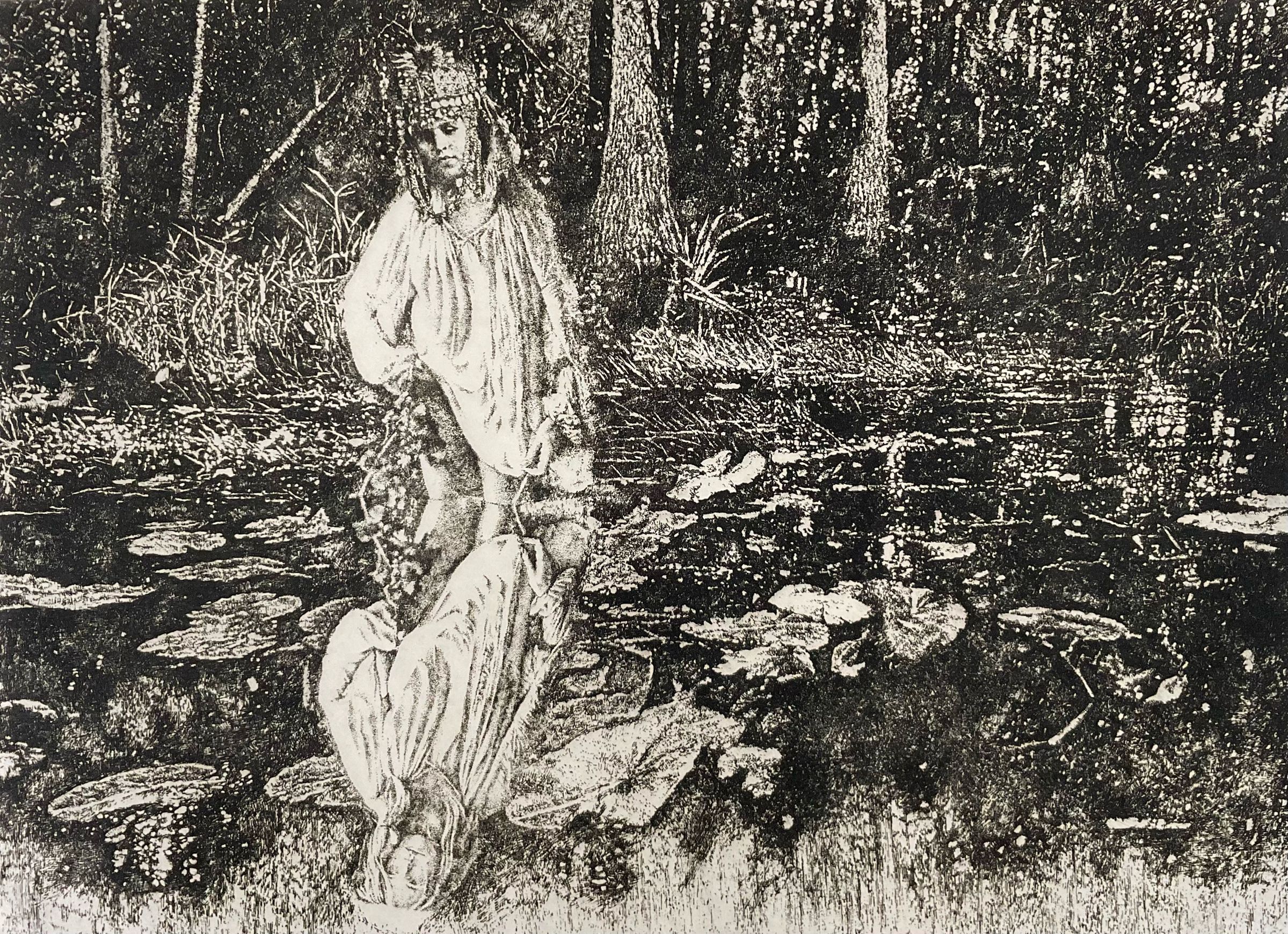 Black and white. Young woman in ceremonial helmet & Tunic, Wades into a still river in lush forest. Far bank of river is behind woman's waist. Looks orientalistic/exotic.Collection