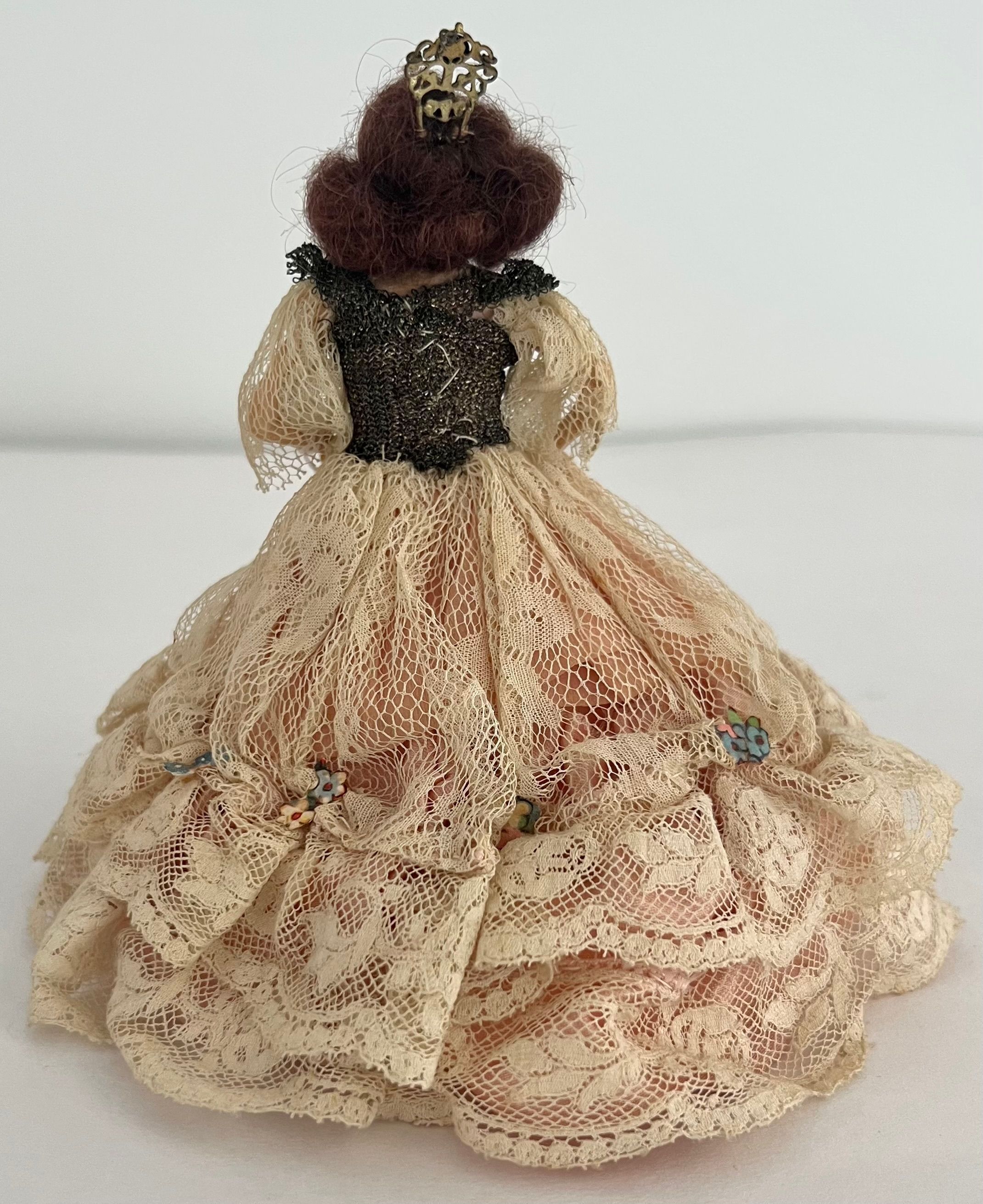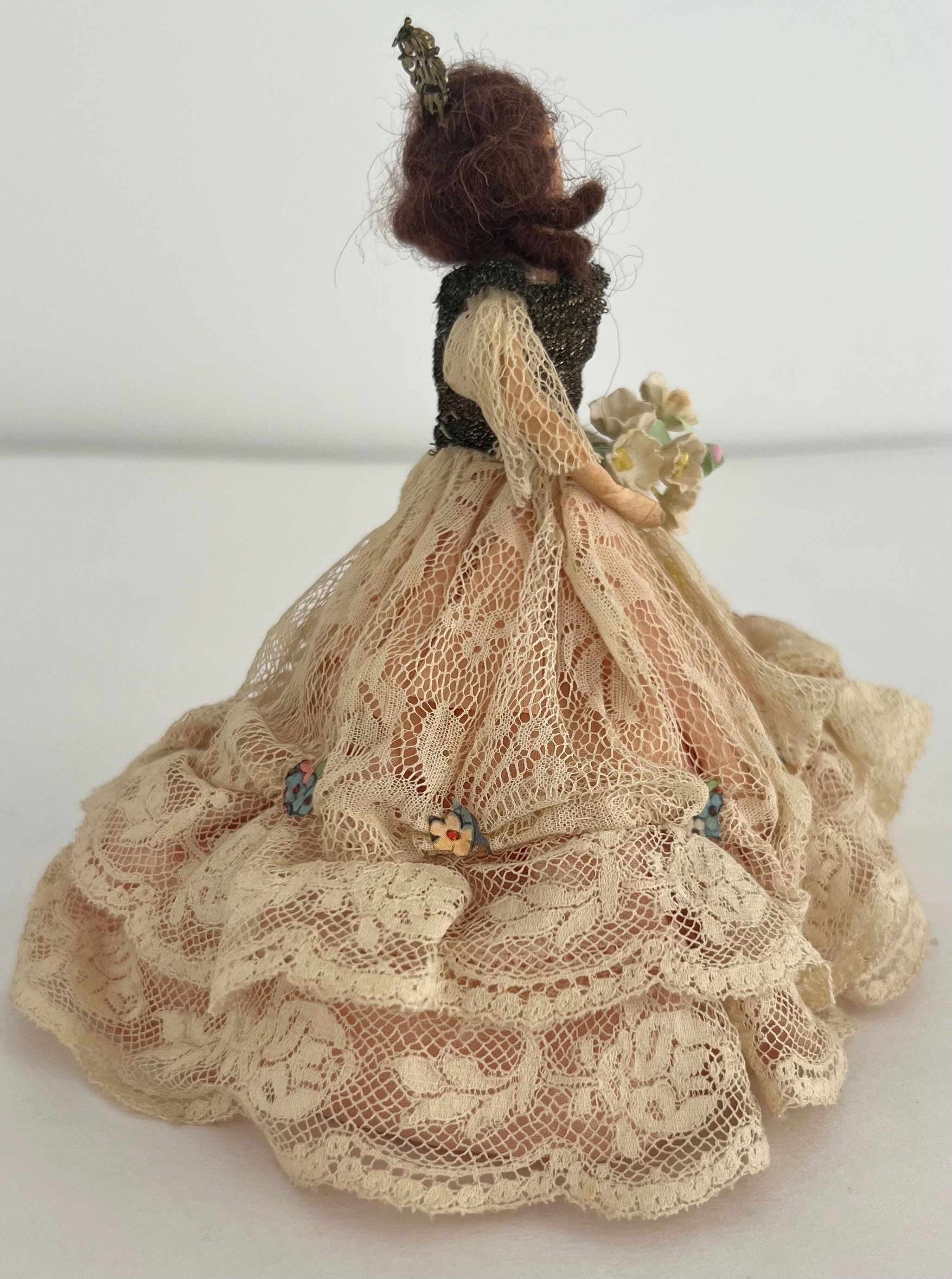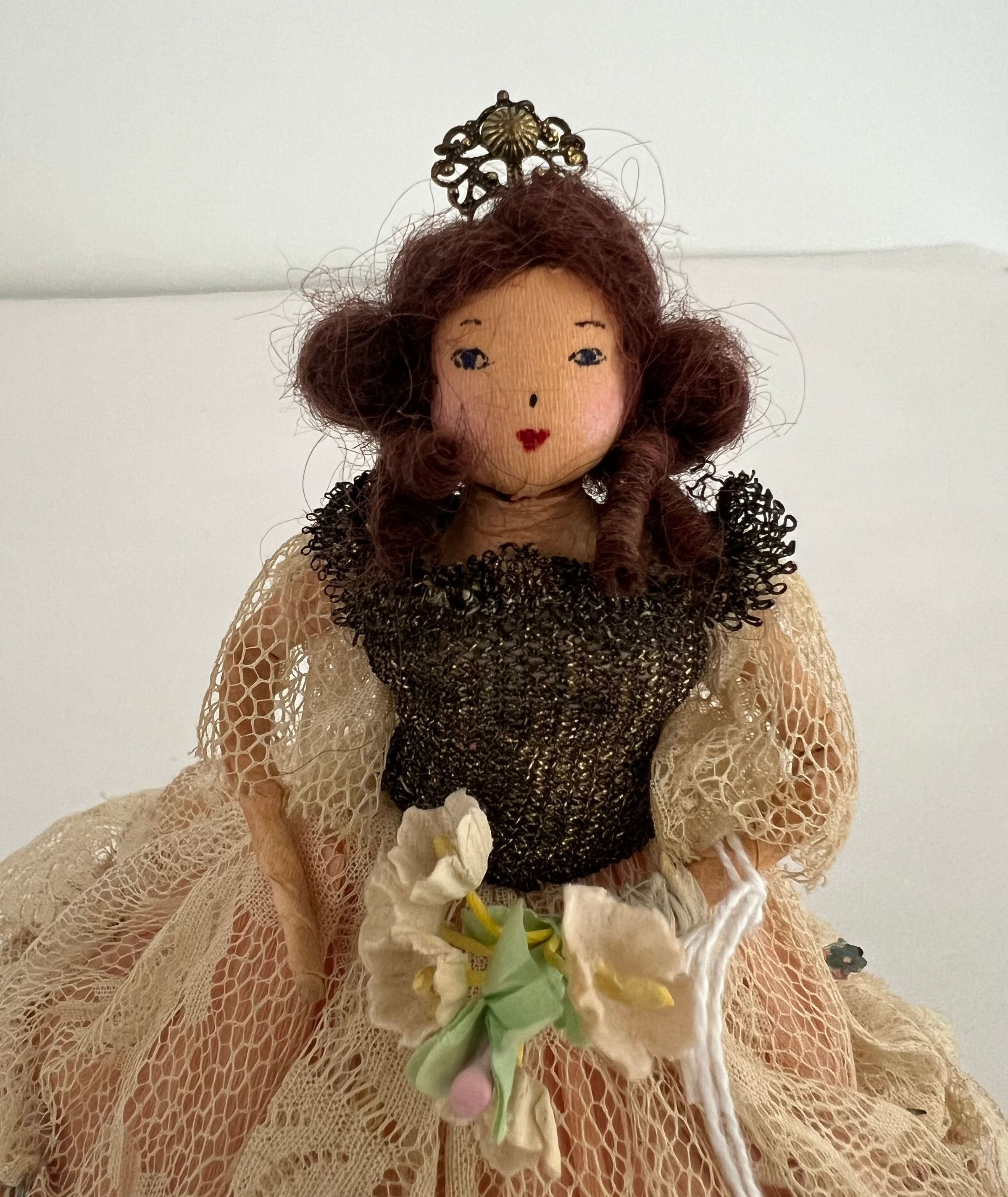 Standing position, holds bouquet of flowers in right hand. Wears full, hooped gown of pink taffeta totally covered with white lace. Two tiers of lace ruffles accent bottom and are caught with paper flowers. Bodice is made from from a black and gold mesh material, sleeves are 3/4 length an made from white netting. Long brown hair worn in ringlets. Gold metal antiqued tiara worn.Collection