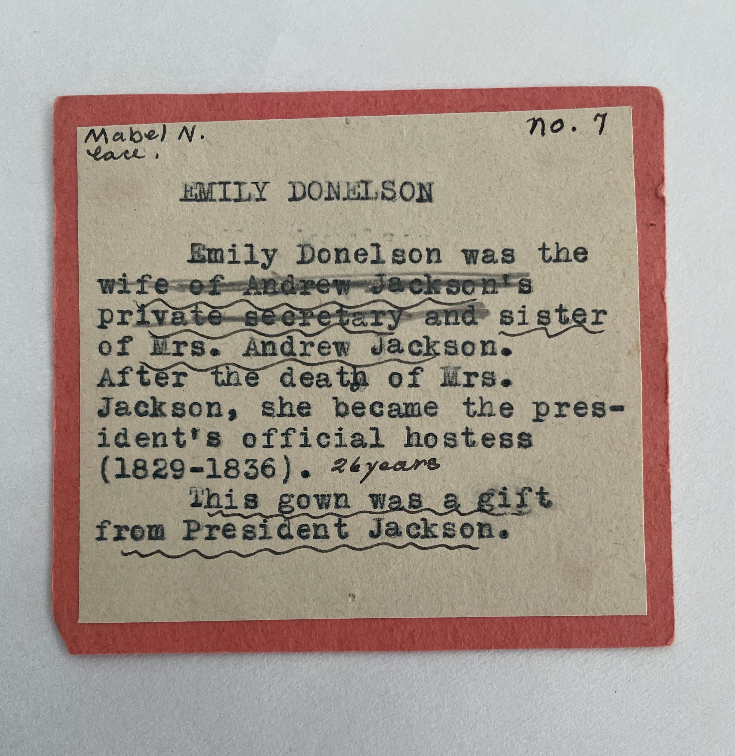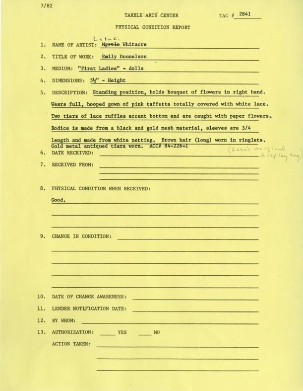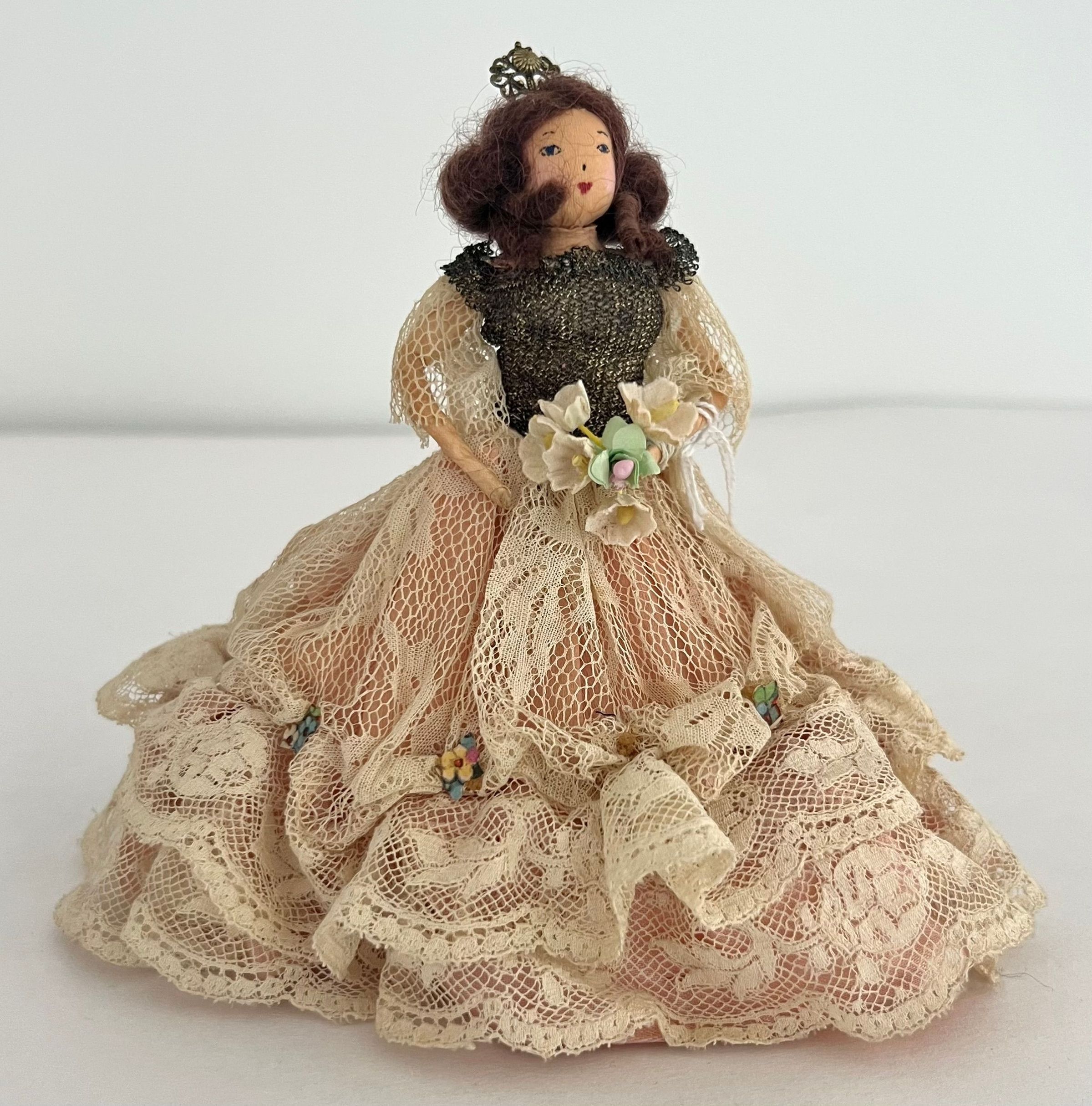 Standing position, holds bouquet of flowers in right hand. Wears full, hooped gown of pink taffeta totally covered with white lace. Two tiers of lace ruffles accent bottom and are caught with paper flowers. Bodice is made from from a black and gold mesh material, sleeves are 3/4 length an made from white netting. Long brown hair worn in ringlets. Gold metal antiqued tiara worn.Collection