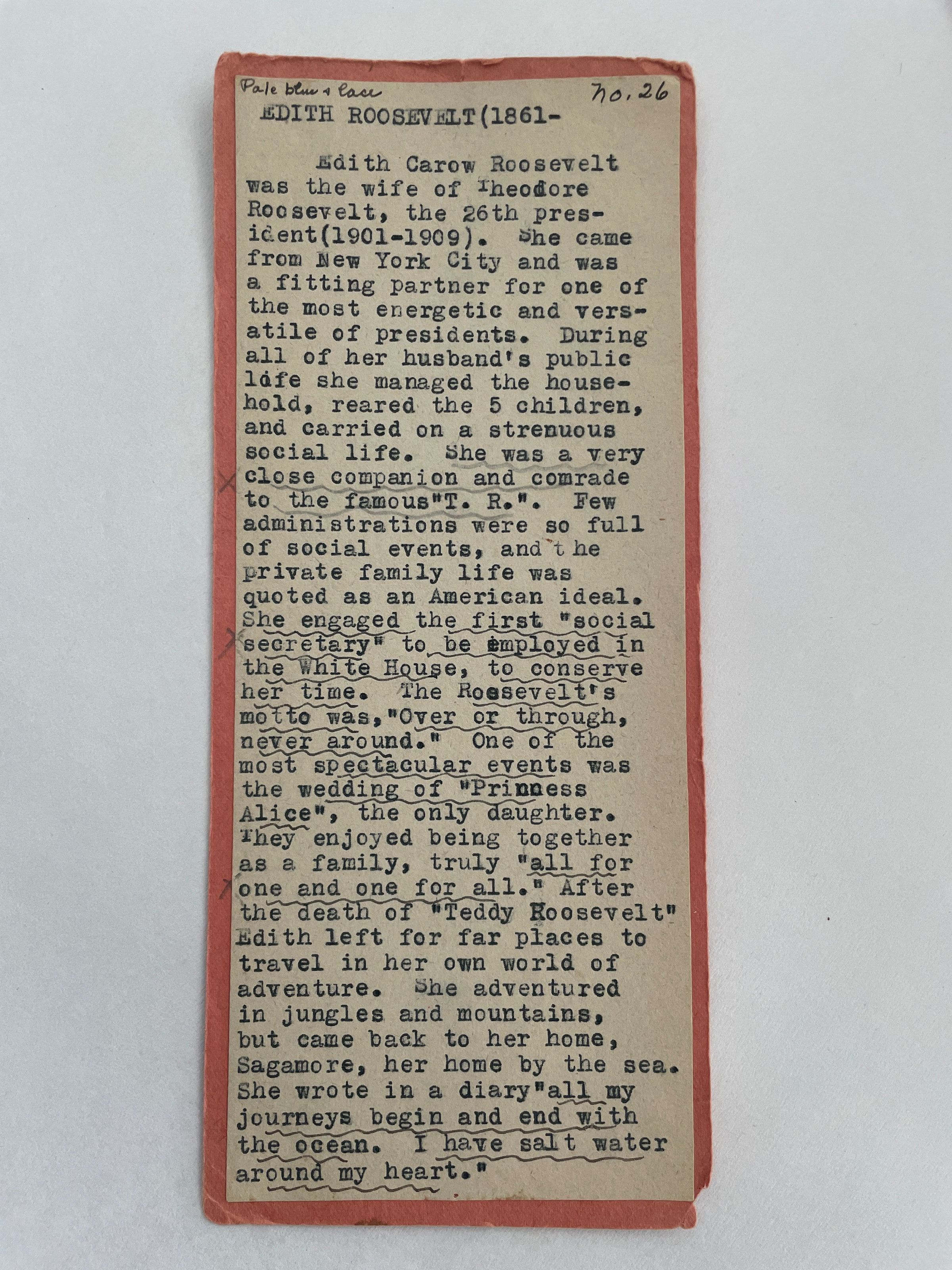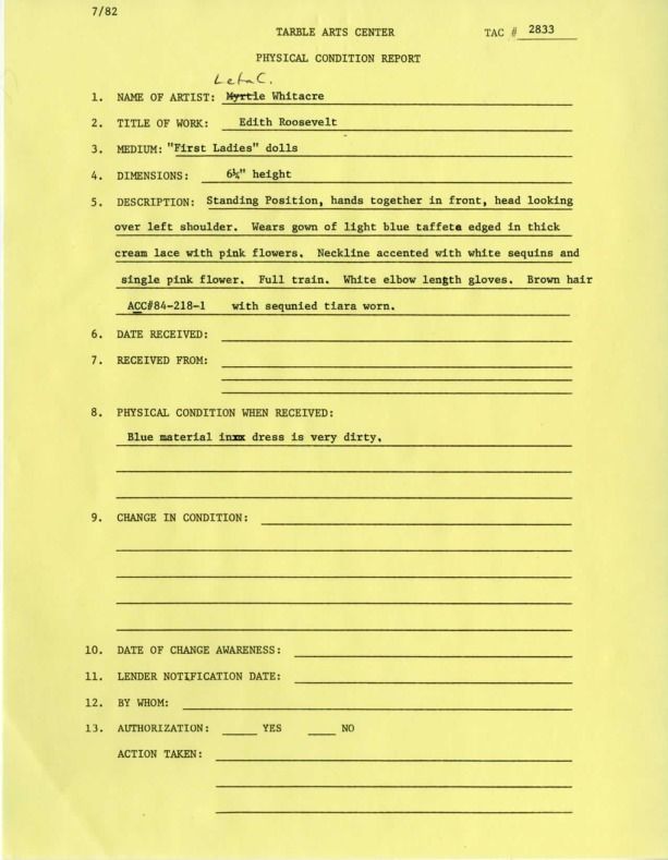 Standing position, hands together in front, head looking over left shoulder. Wears gown of light blue taffeta edged in thick cream lace with pink flowers. Neckline accented with white sequins and single pink flower. White elbow length gloves. Brown hair with sequined worn.Collection
