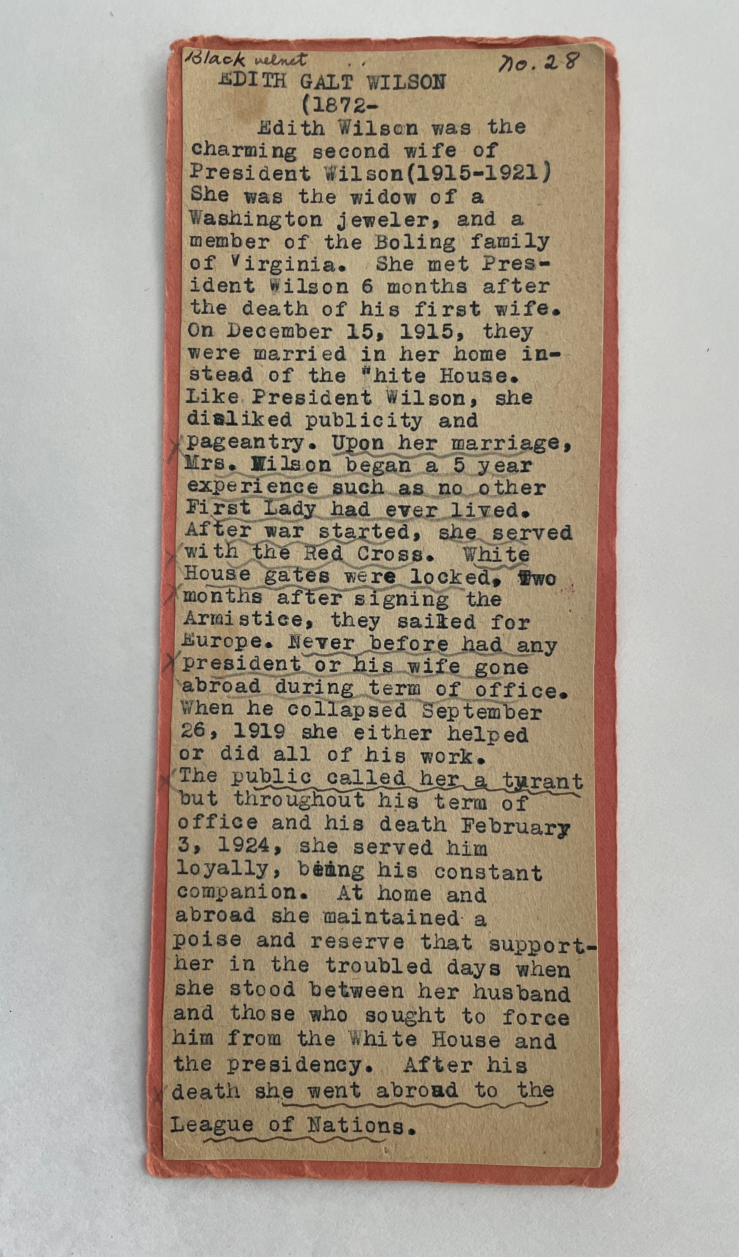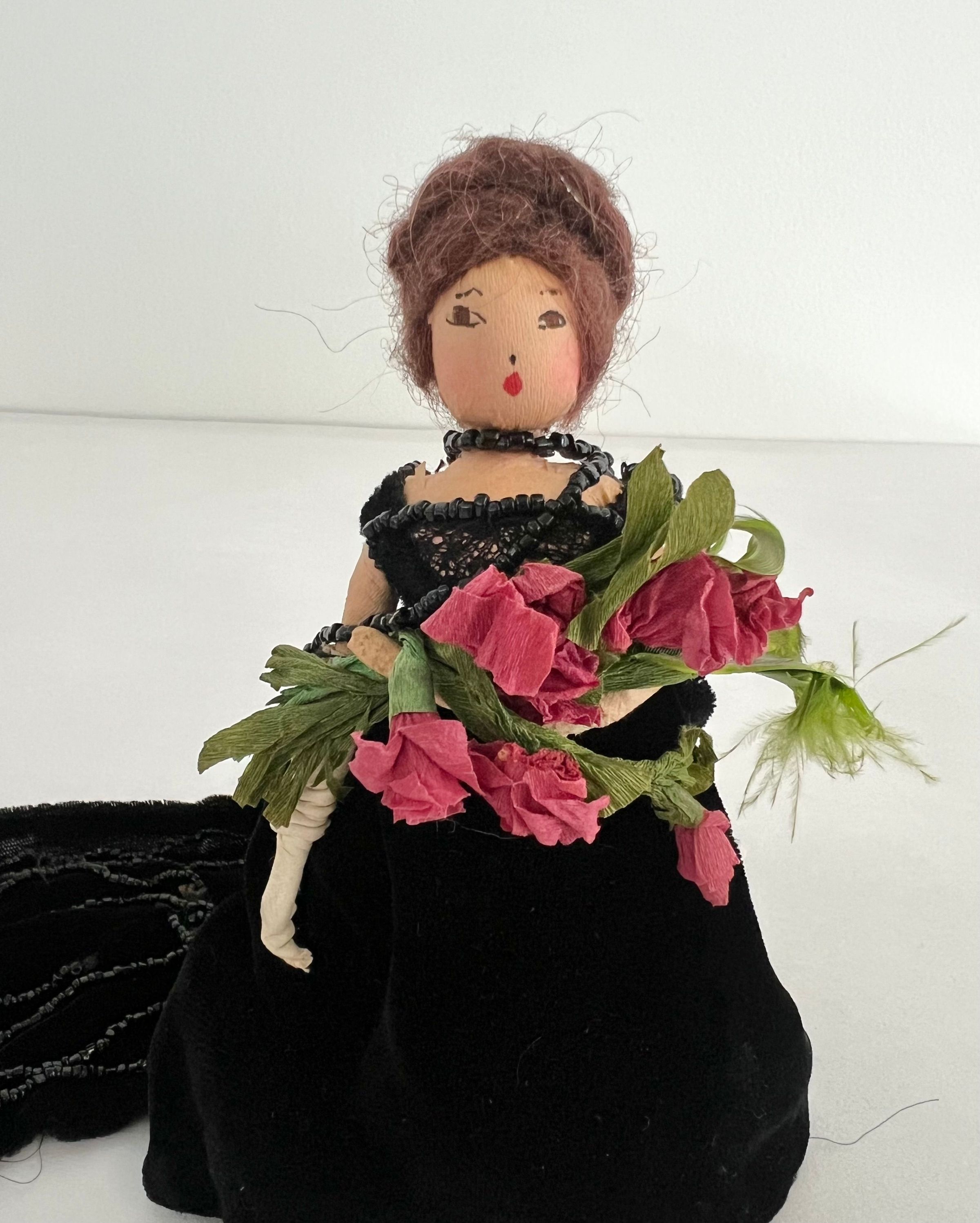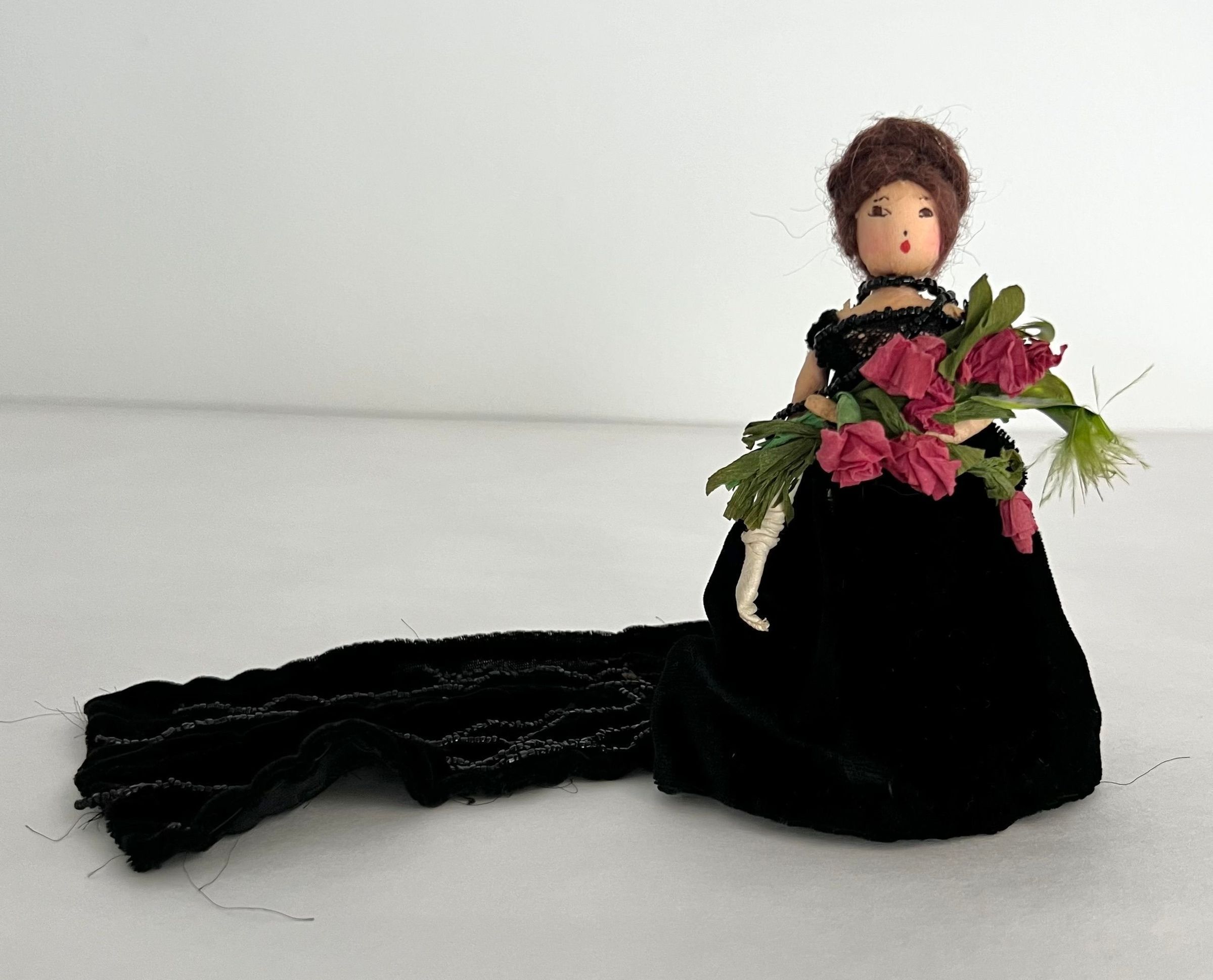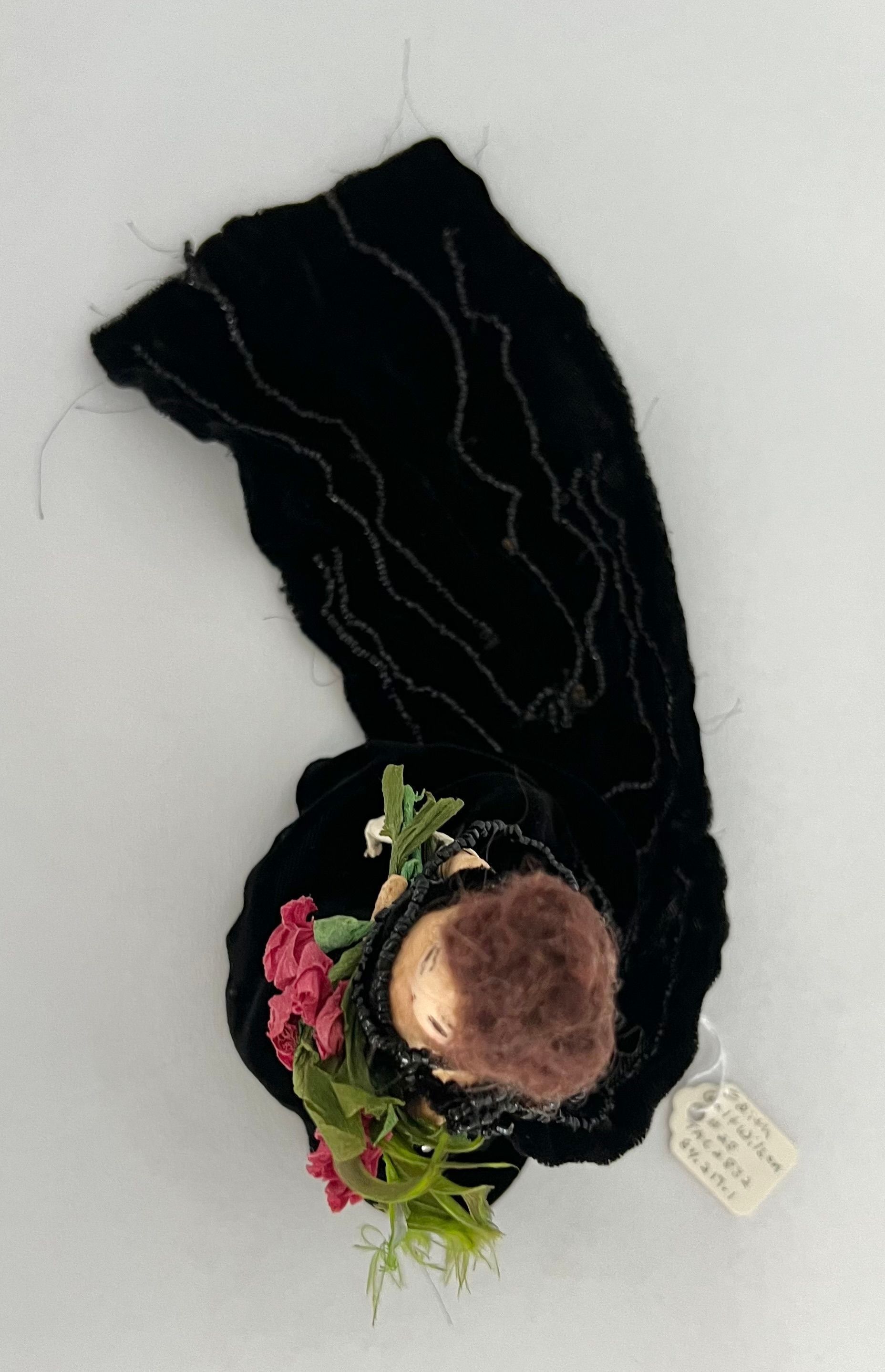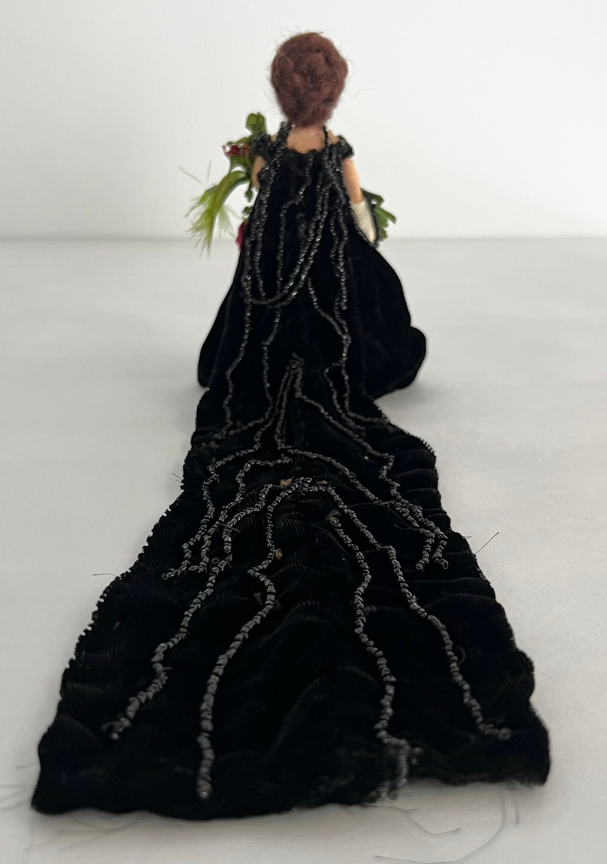 Standing position, holds bouquet of red roses with greenery in left arm. Wears black velvet gown with long train. Strings of beads decorate back of dress, train and white bodice. White elbow length gloves. Brown hair in bun style.Collection