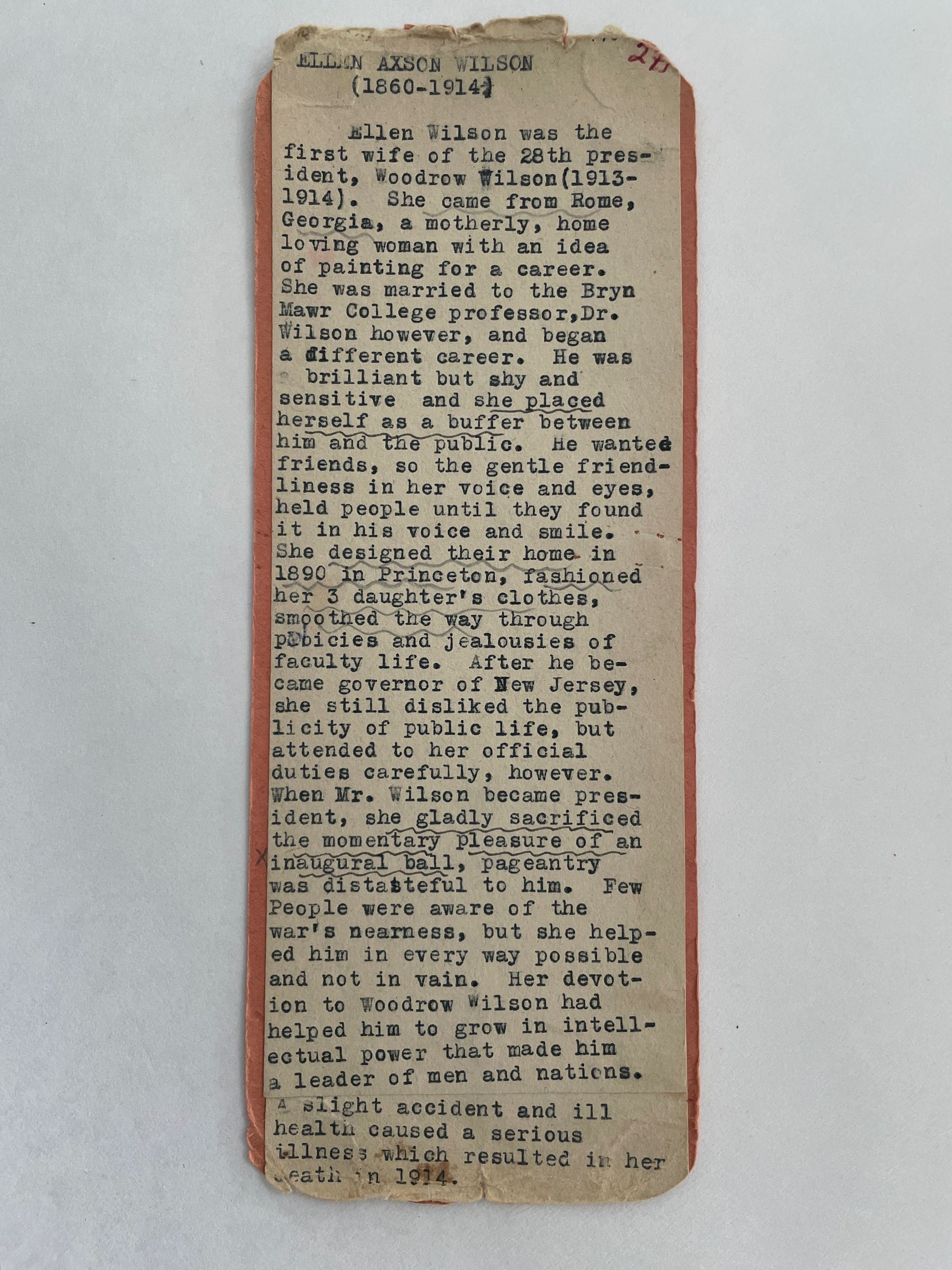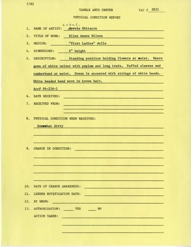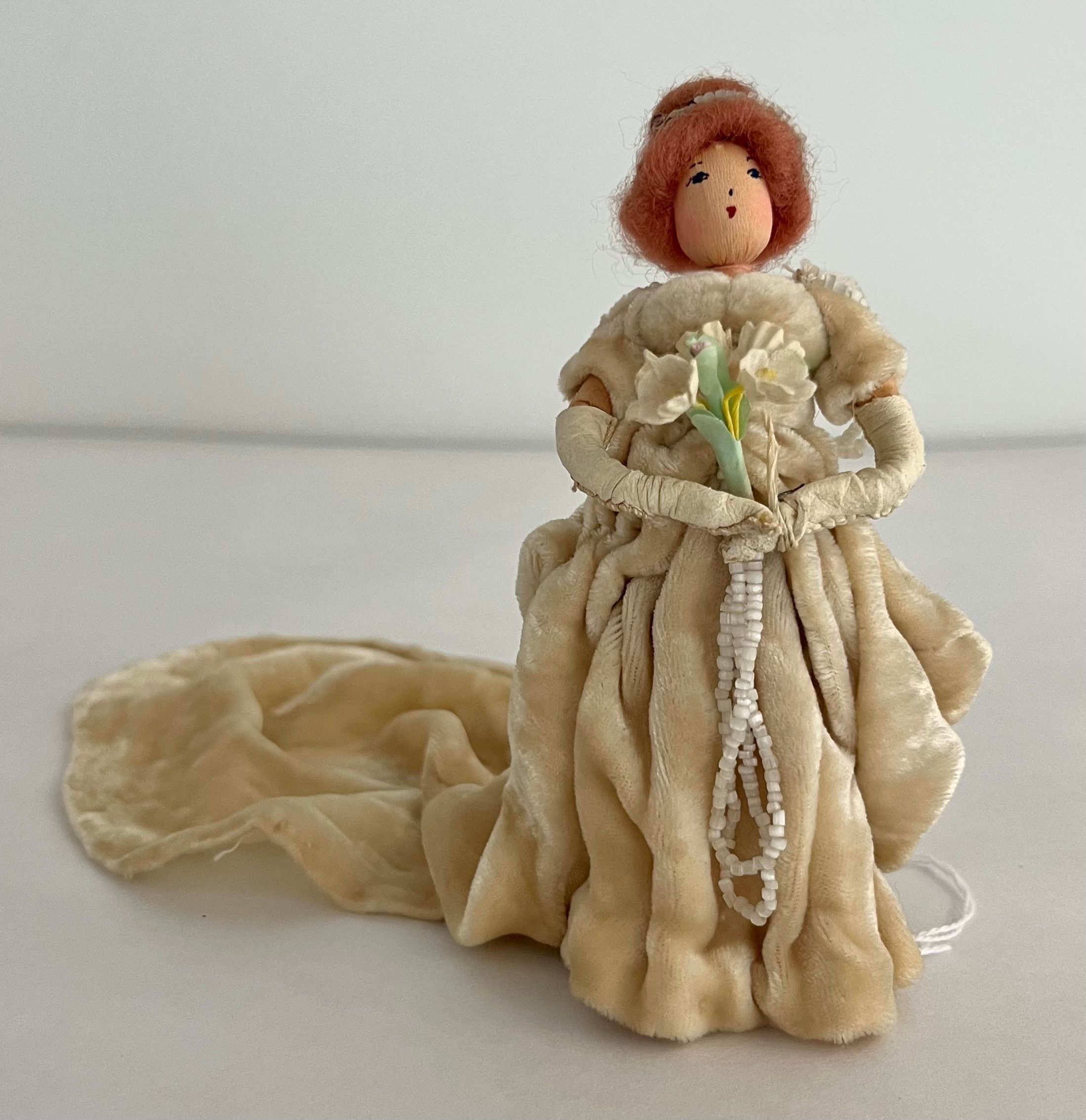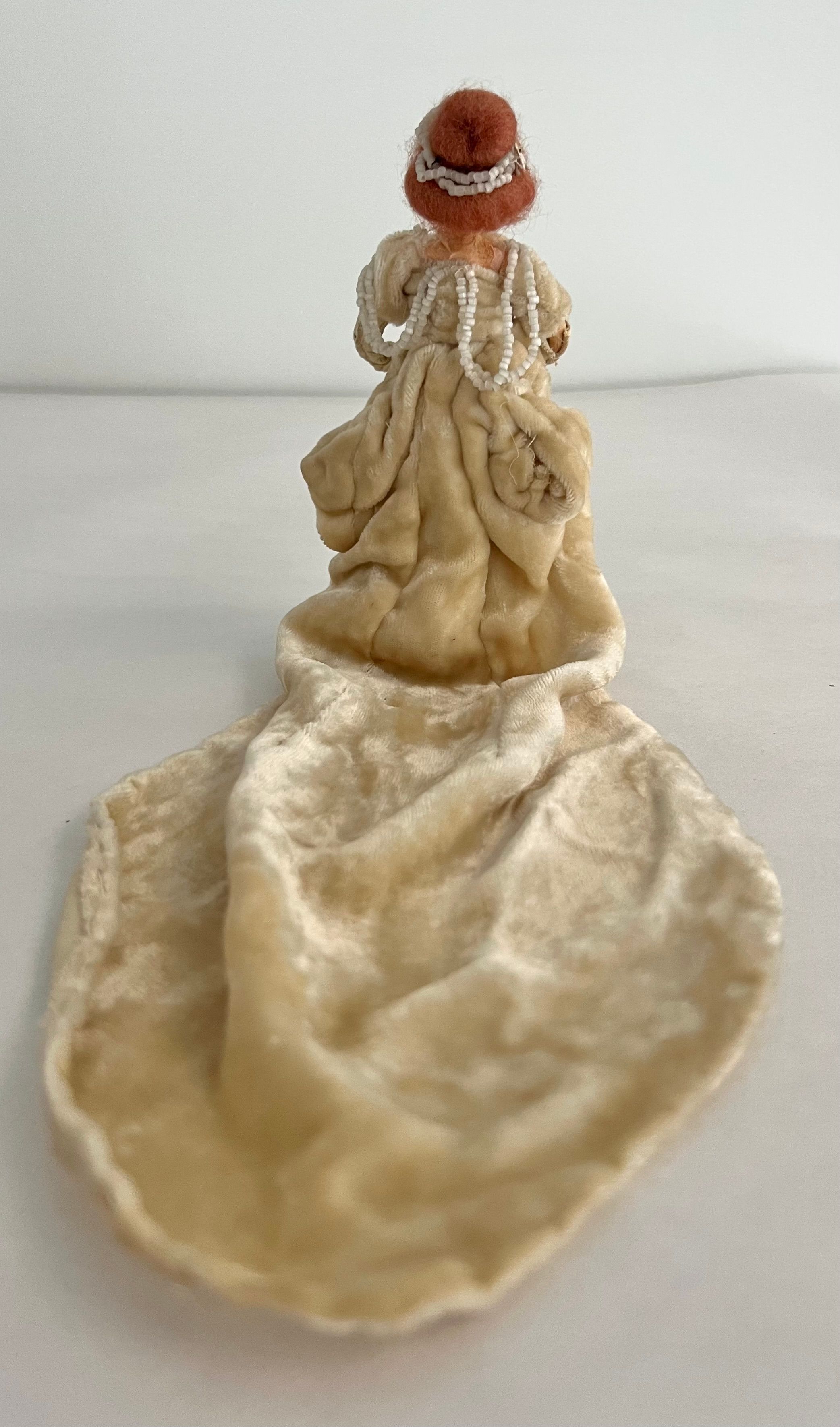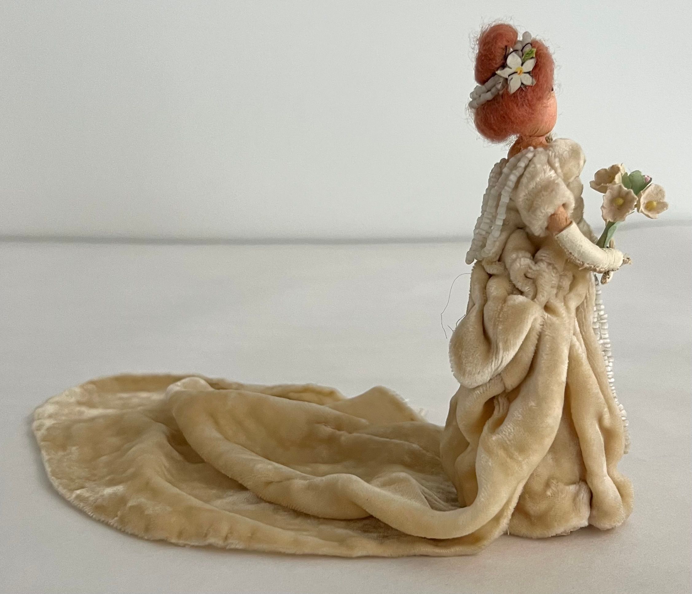 Standing position holding flowers at waist. Wears gown of white velvet with peplum and long train. Puffed sleeves and cumberbund at waist. Dress is accented with strings of white beads. White beaded band worn in brown hair.Collection