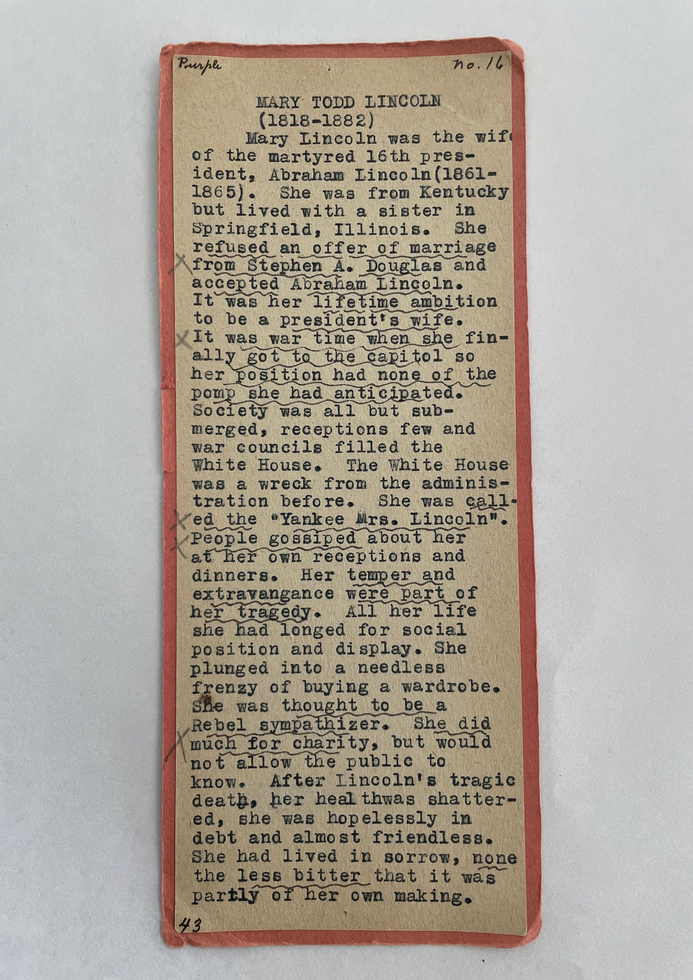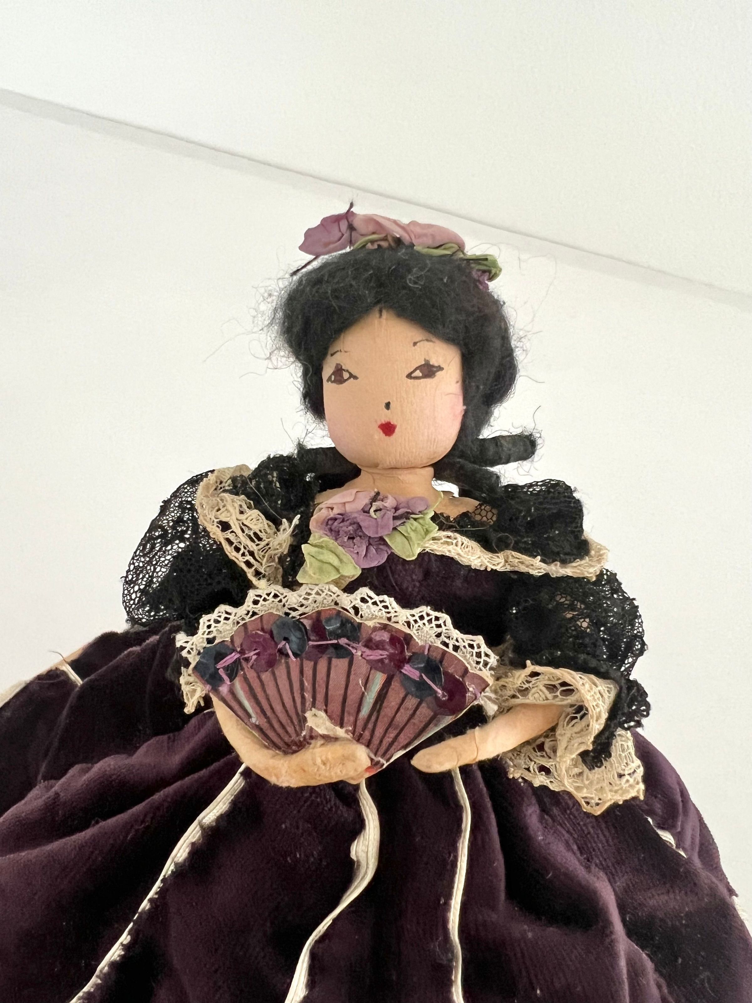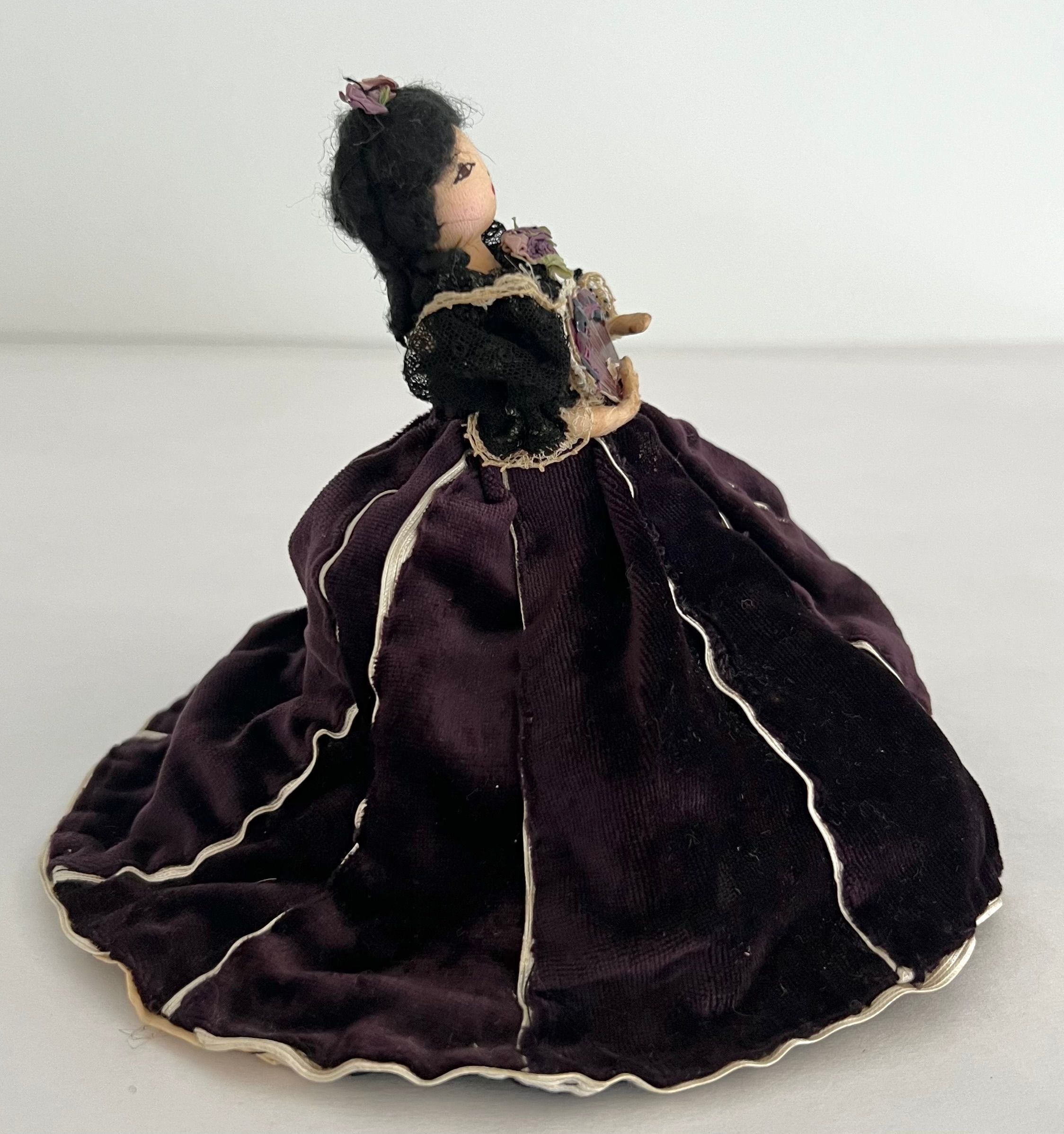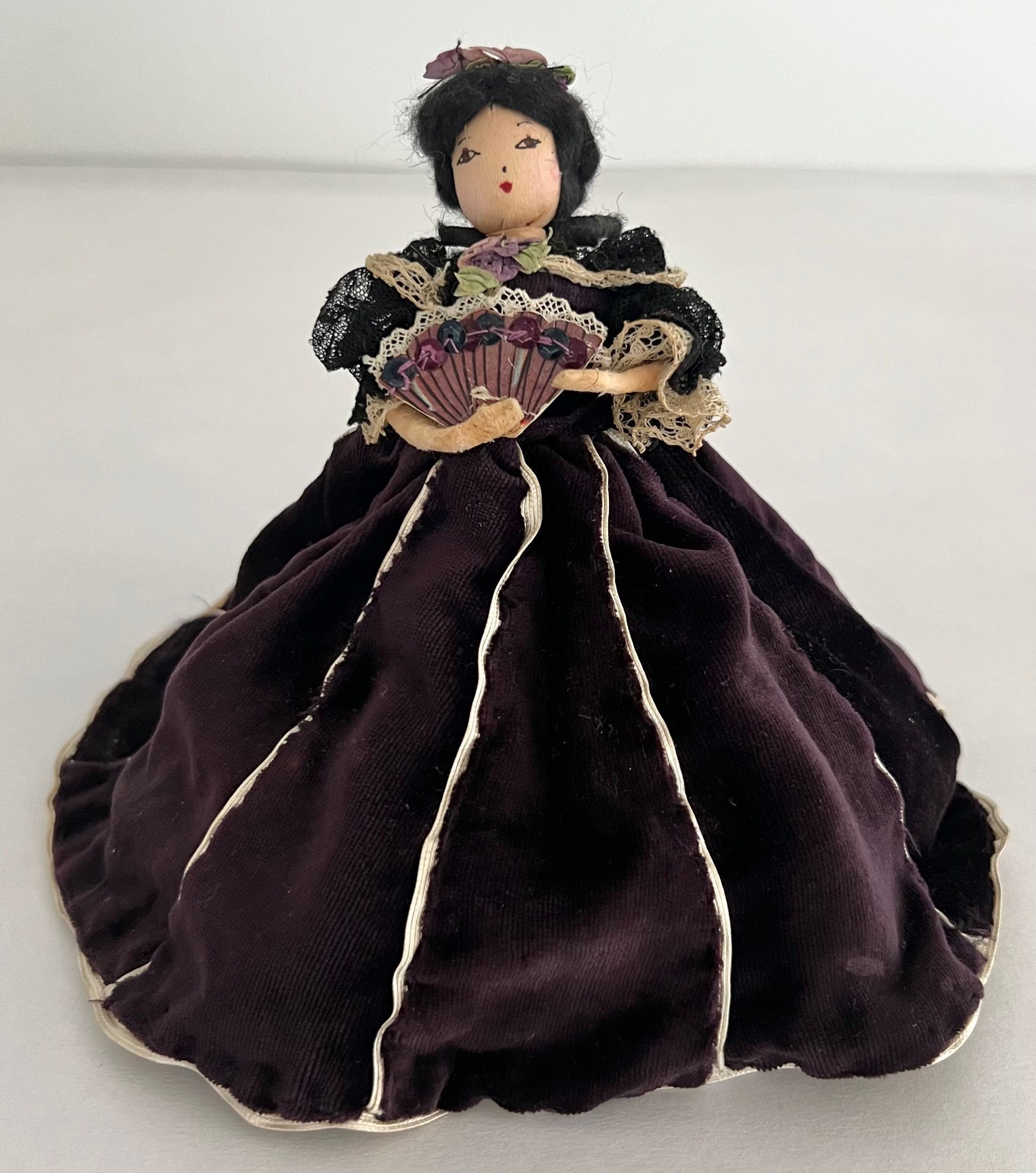 Standing position holds purple sequined fan at chest wearspurple velvet hooped gown with white vertical piping. Top andsleeves are trimmed in black lace and edged with creme lace.Collection