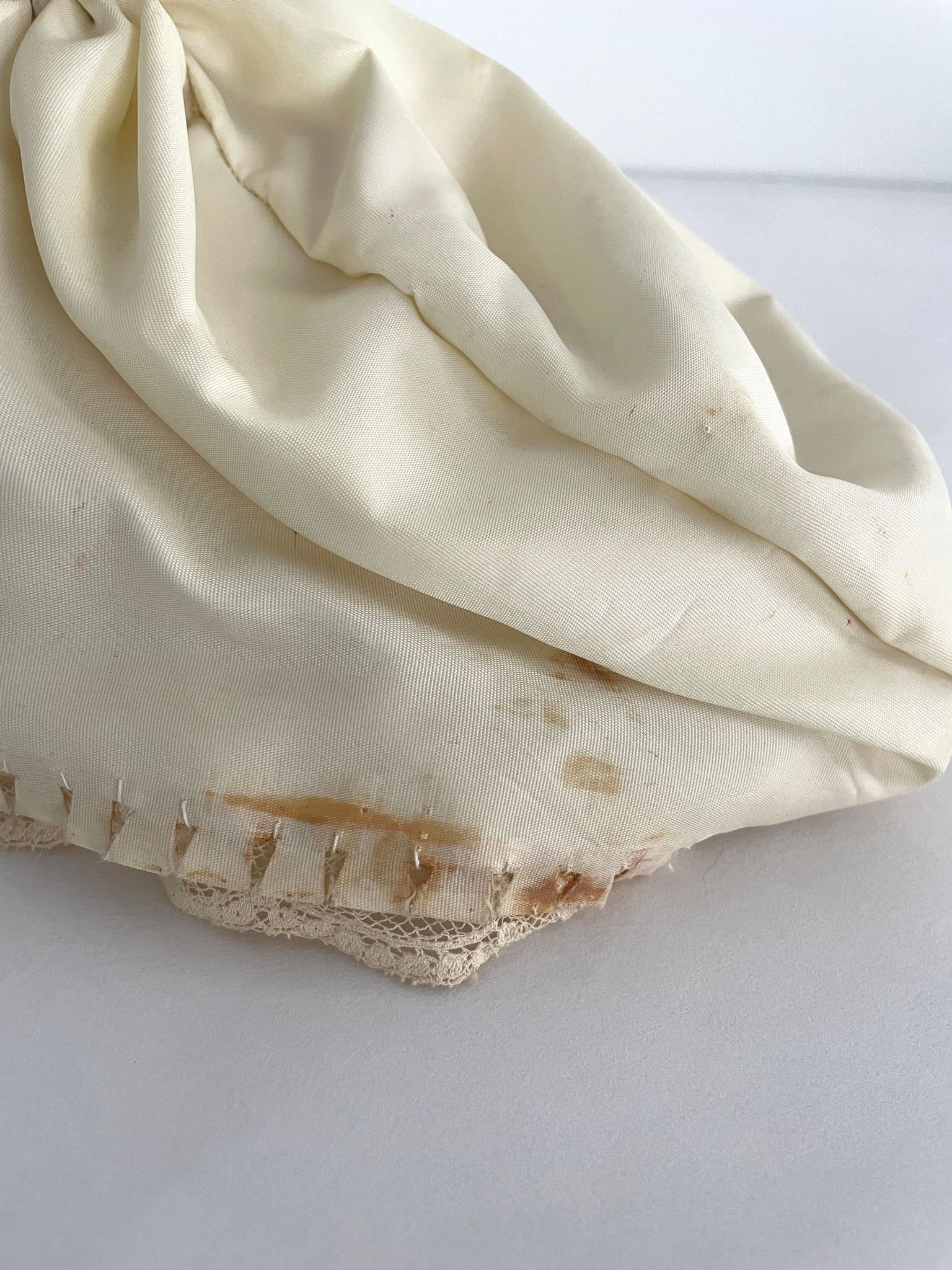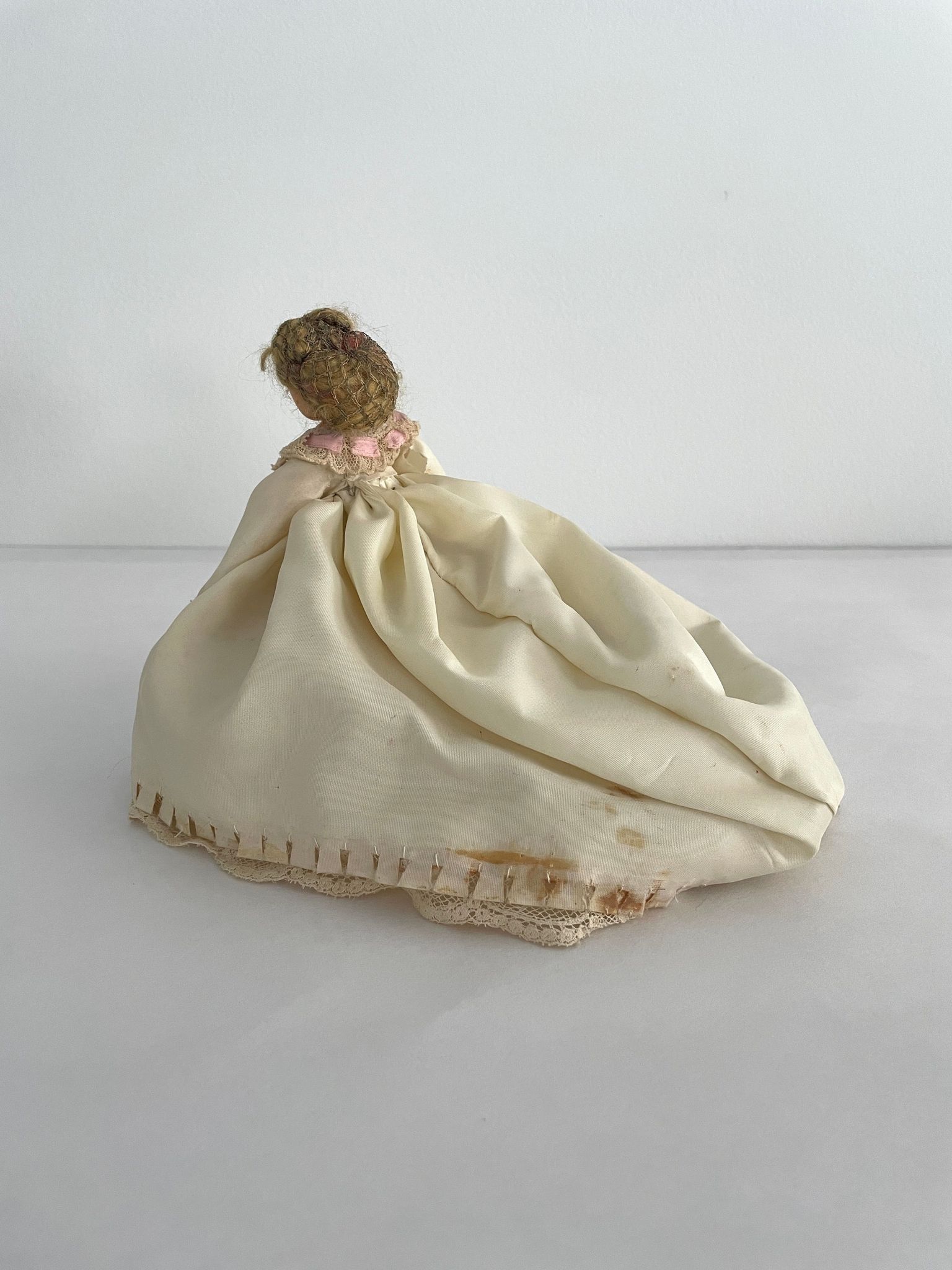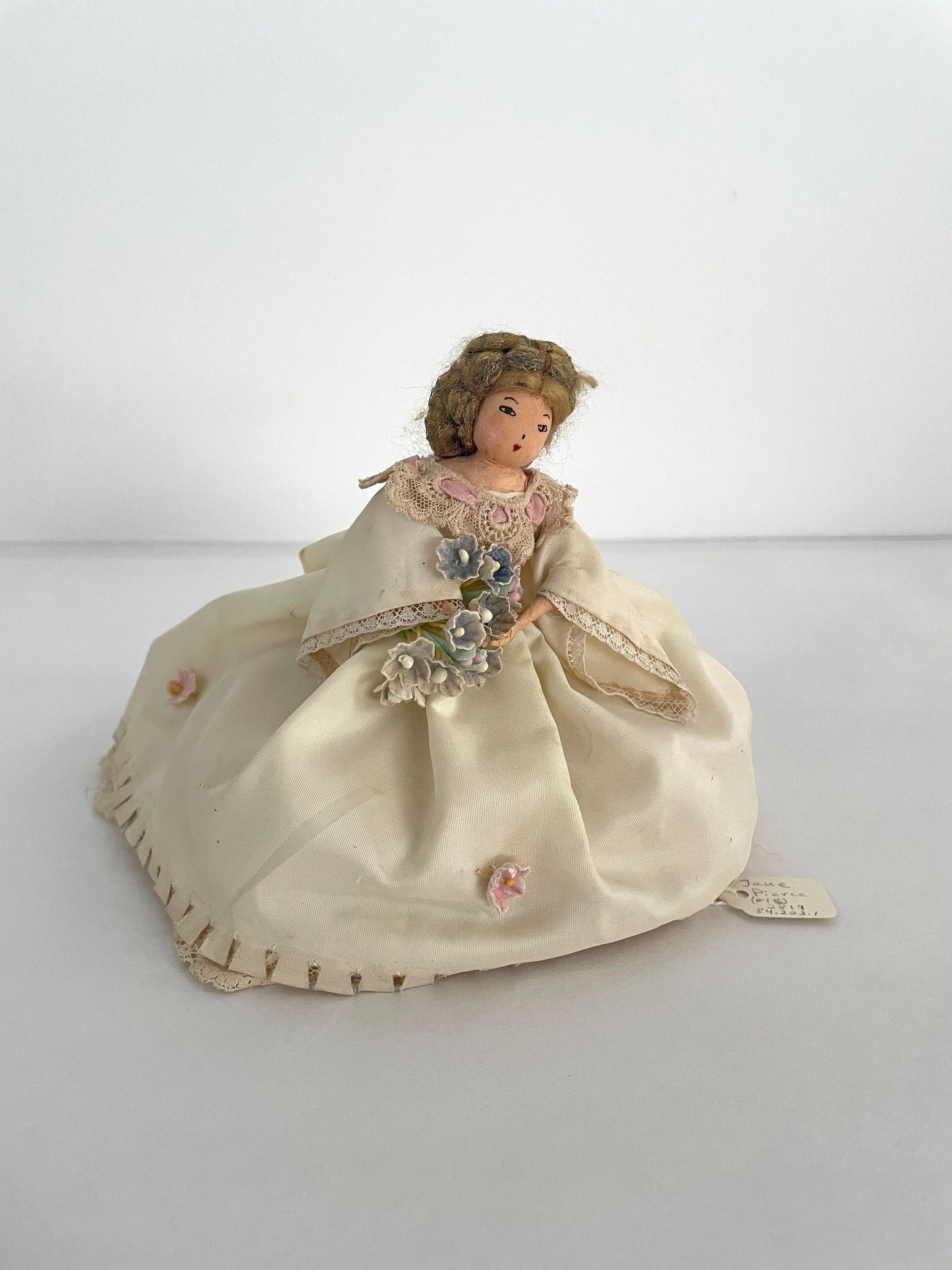 Standing position holds bouquet. Wears creme wedding gown trimmed in creme lace. Accented at bottom with tiny purple flowers. Hooped with long train. Long angel sleeves, neckline trimmed with pink ribbon. light brown hair with netted head covering,Collection