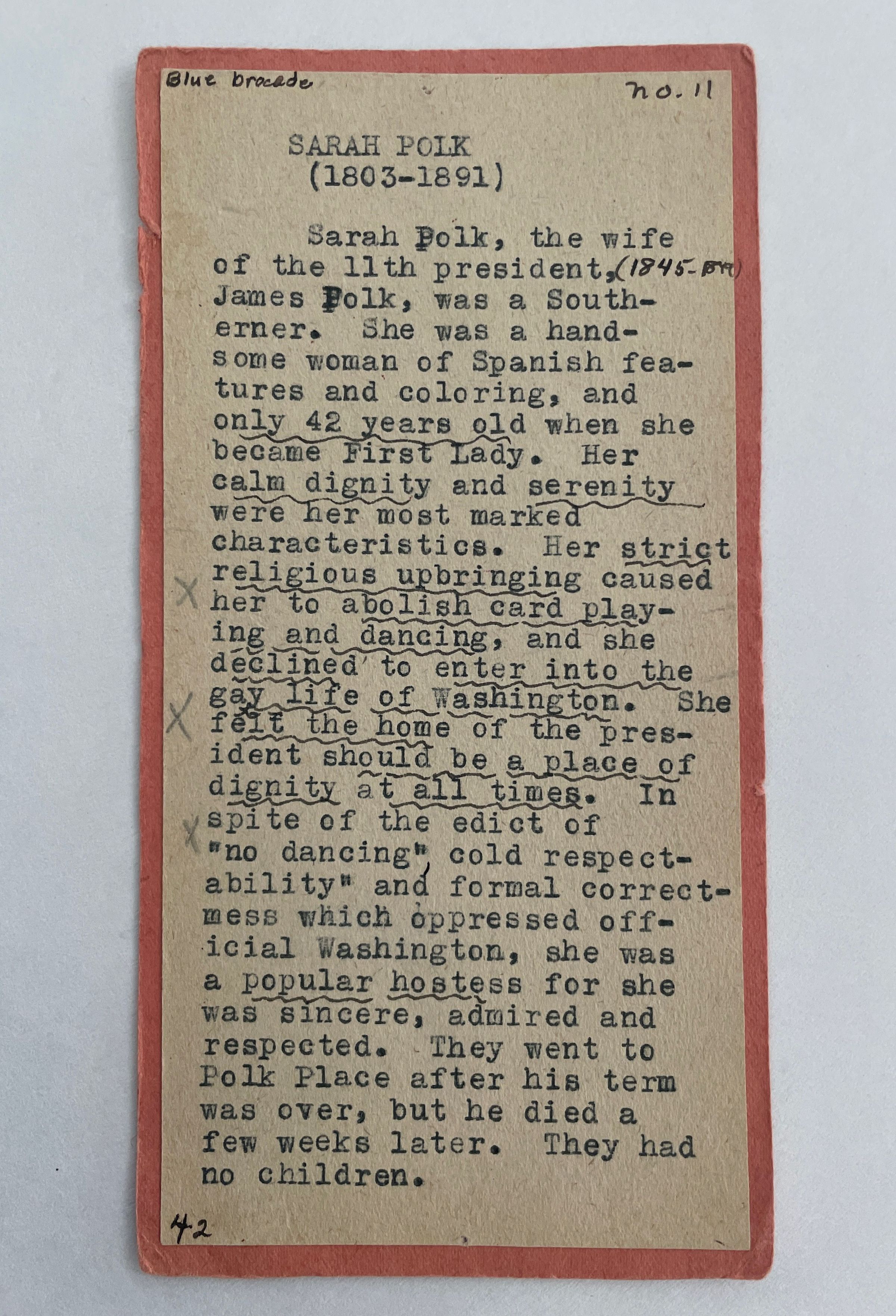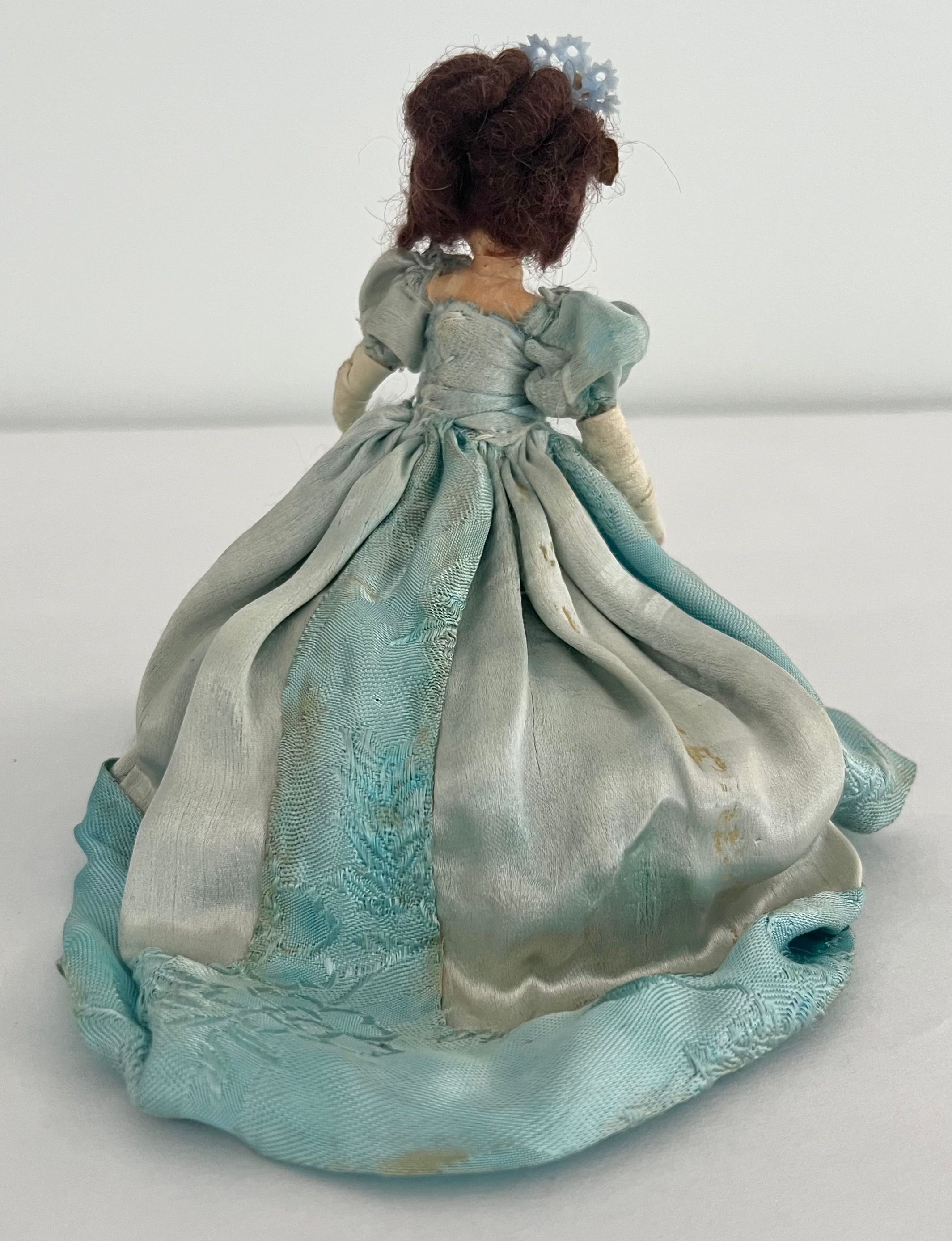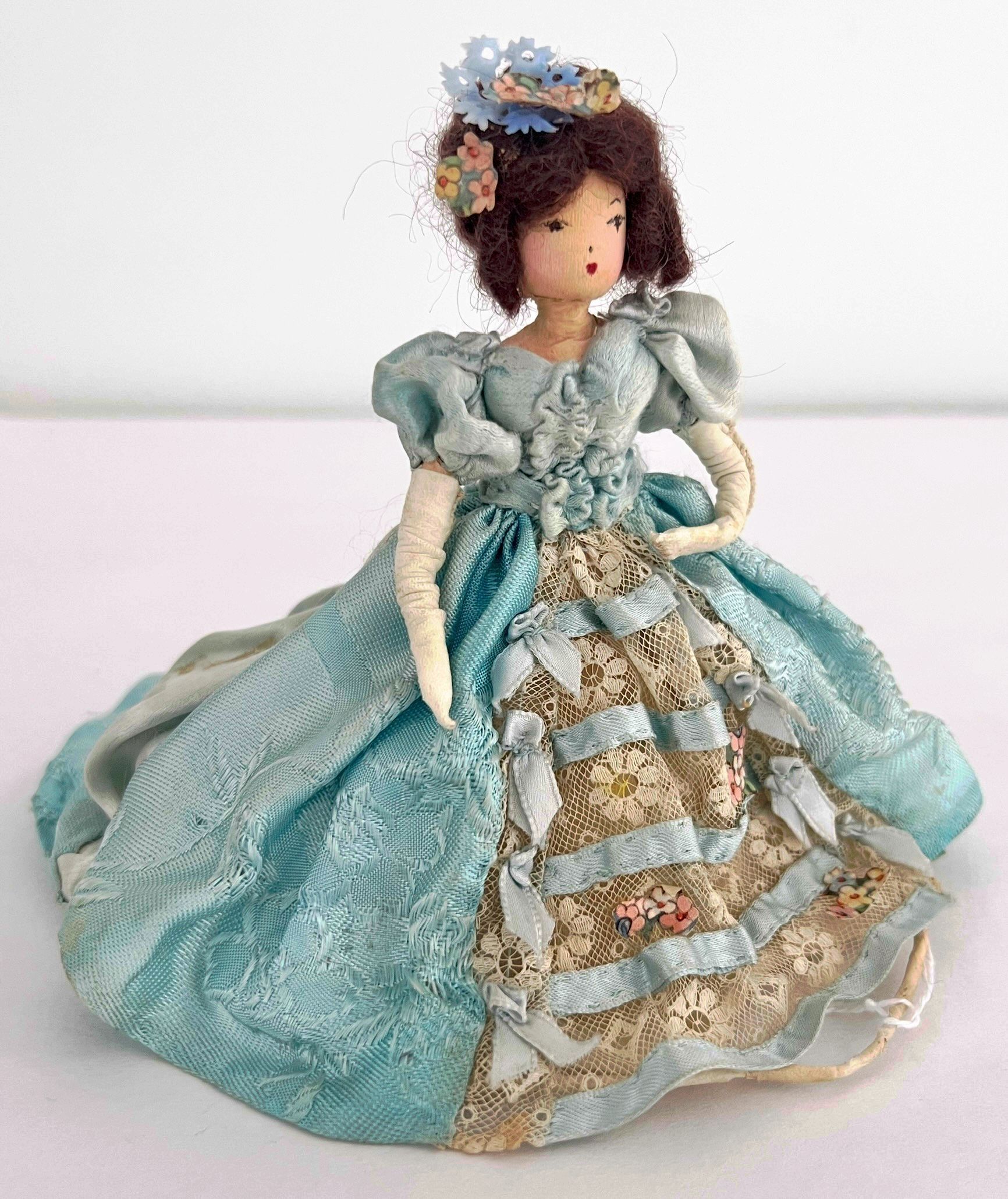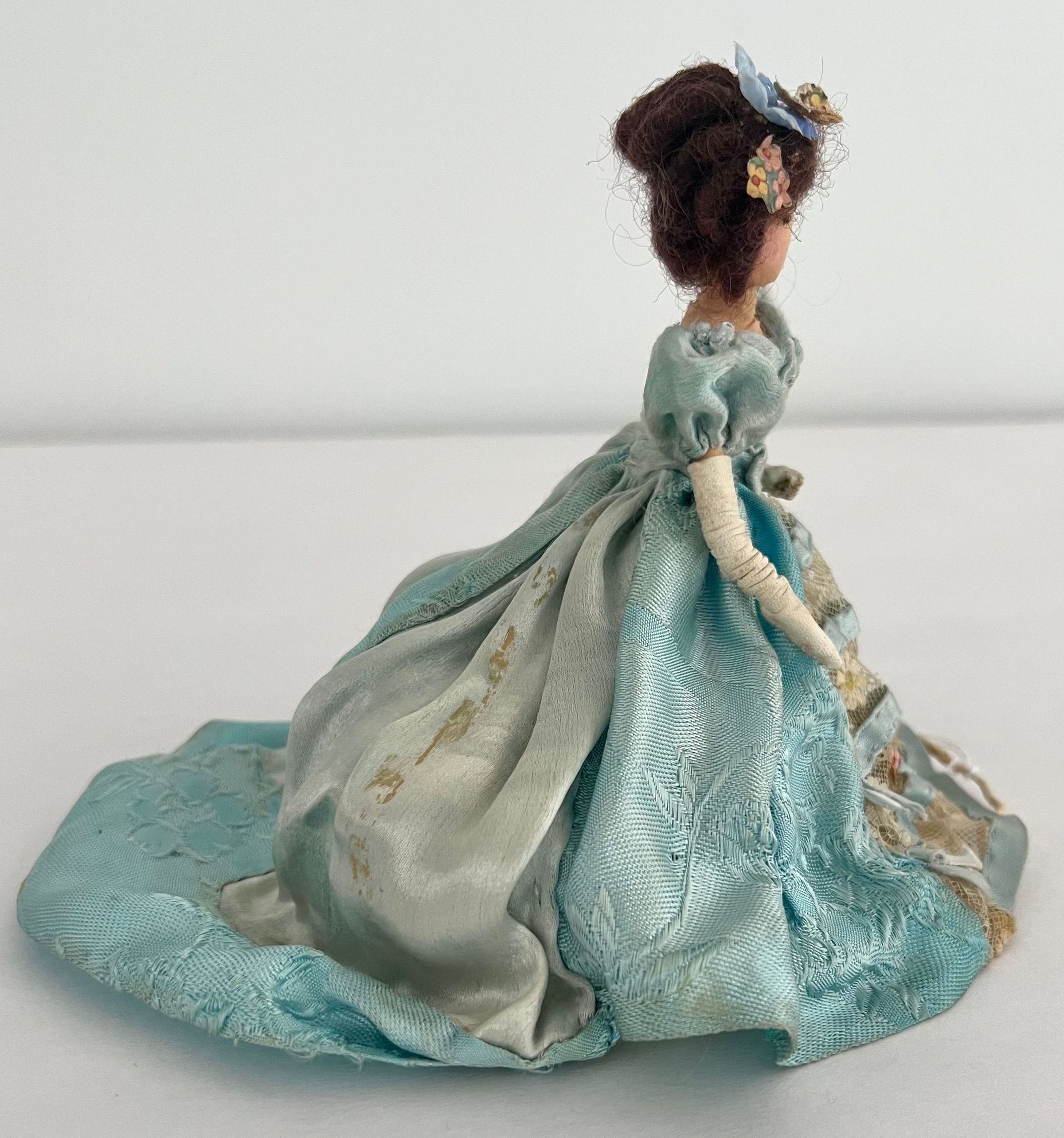 Standing position. Wears blue brocade hooped gown with front creme lace insert with horizontal blue ribboning. Short puffed sleeves. Sleeves and bodice are blue velvet. Sashed waist. Fan attached with pin at lower right of gown. Brown hair with flowers.Collection