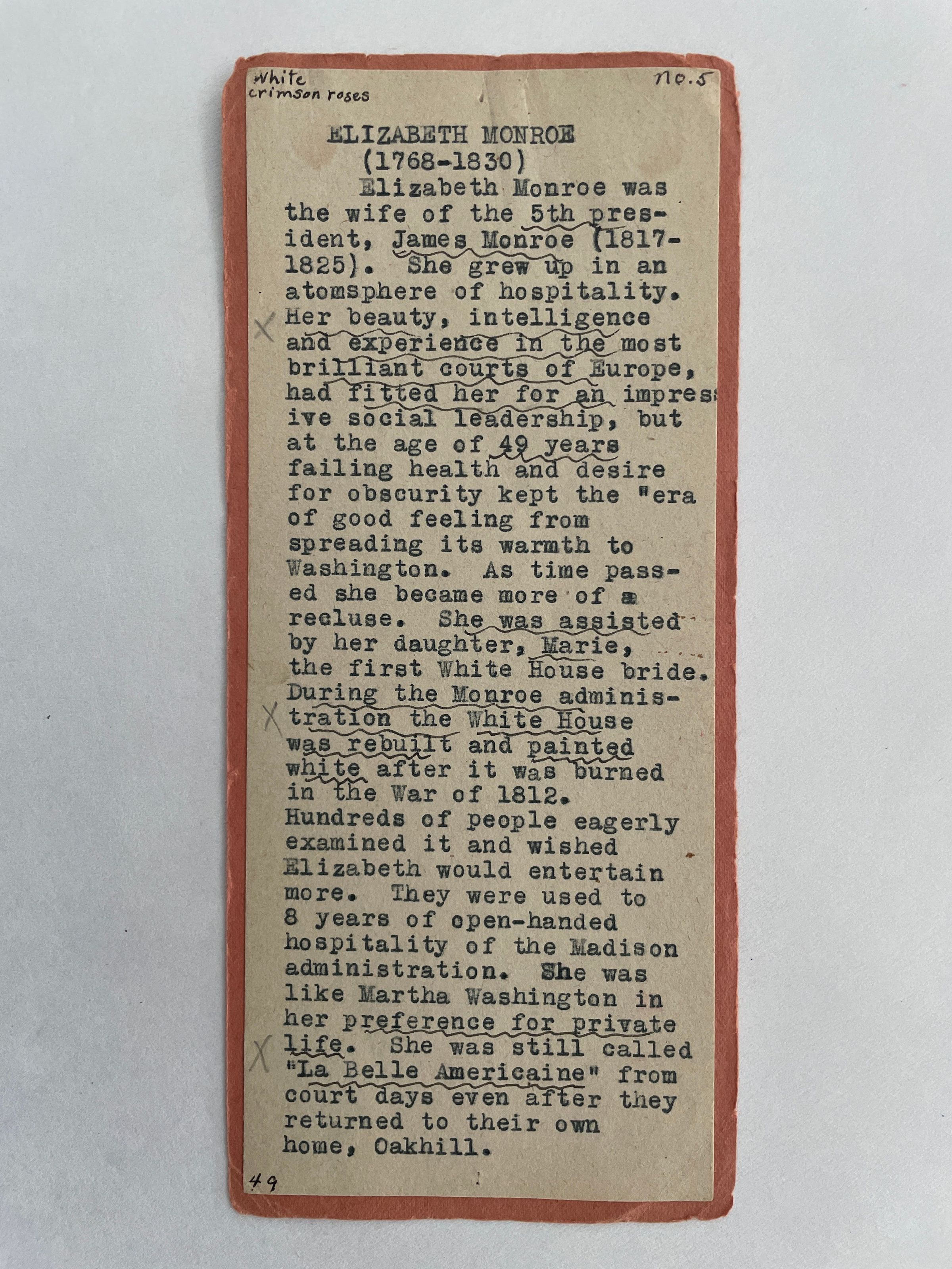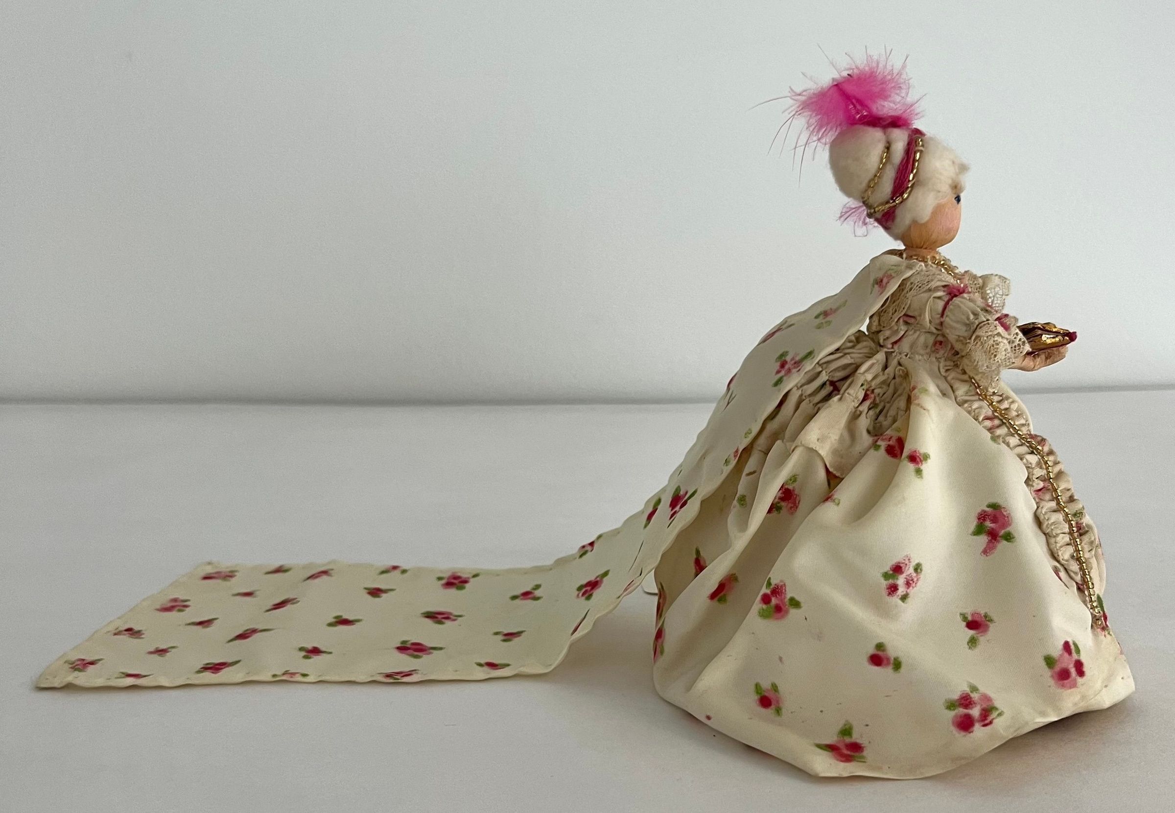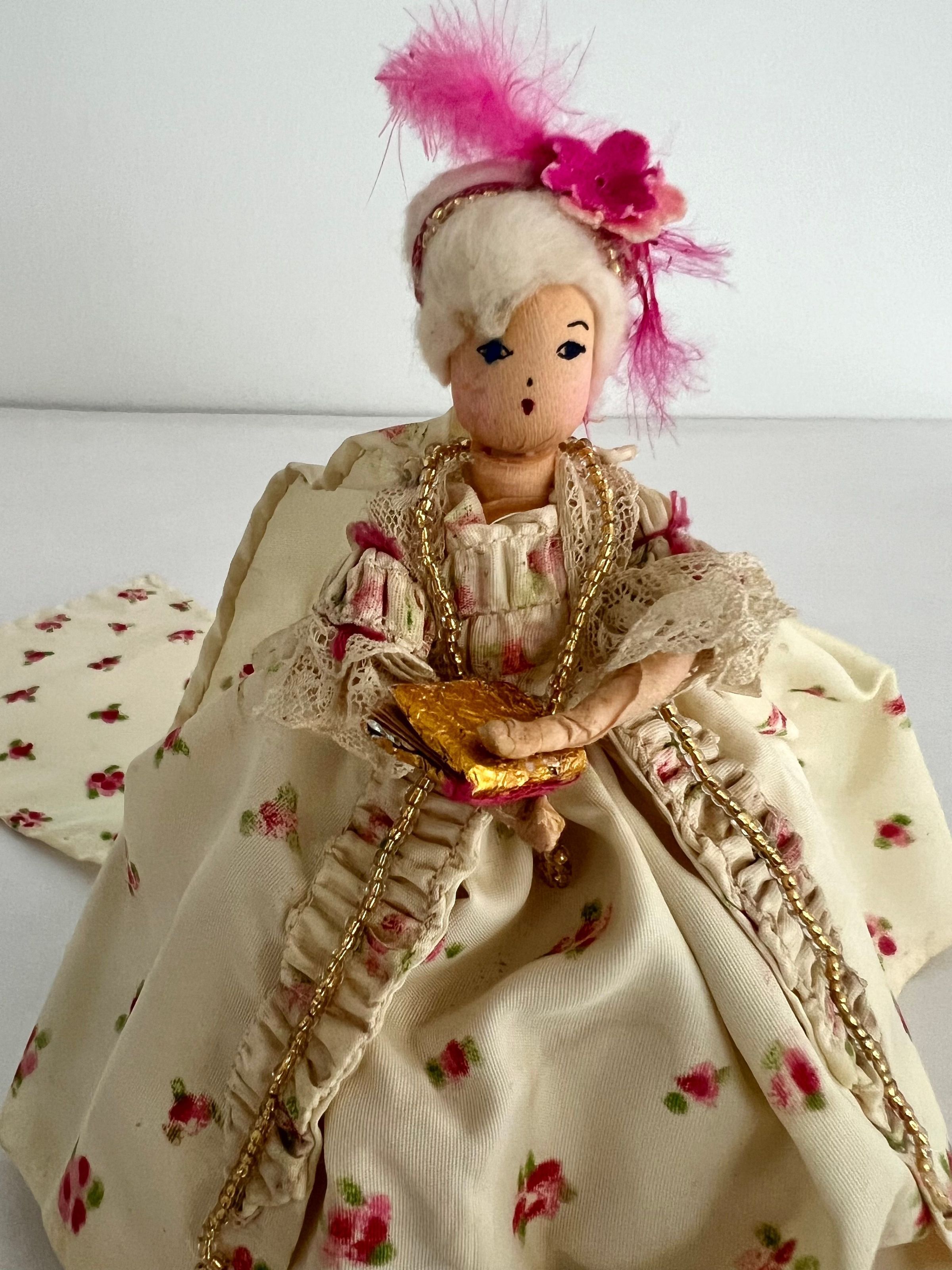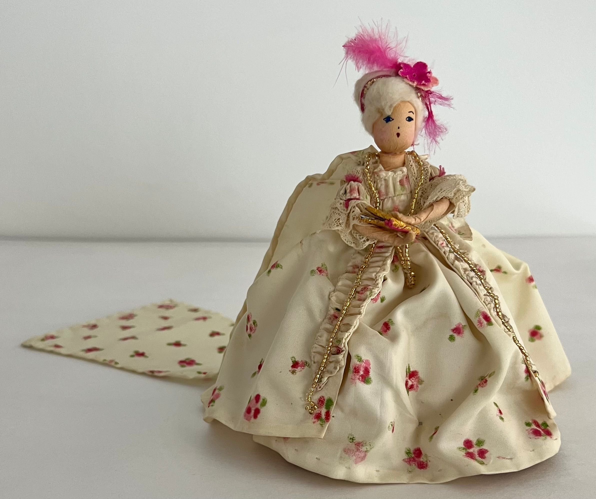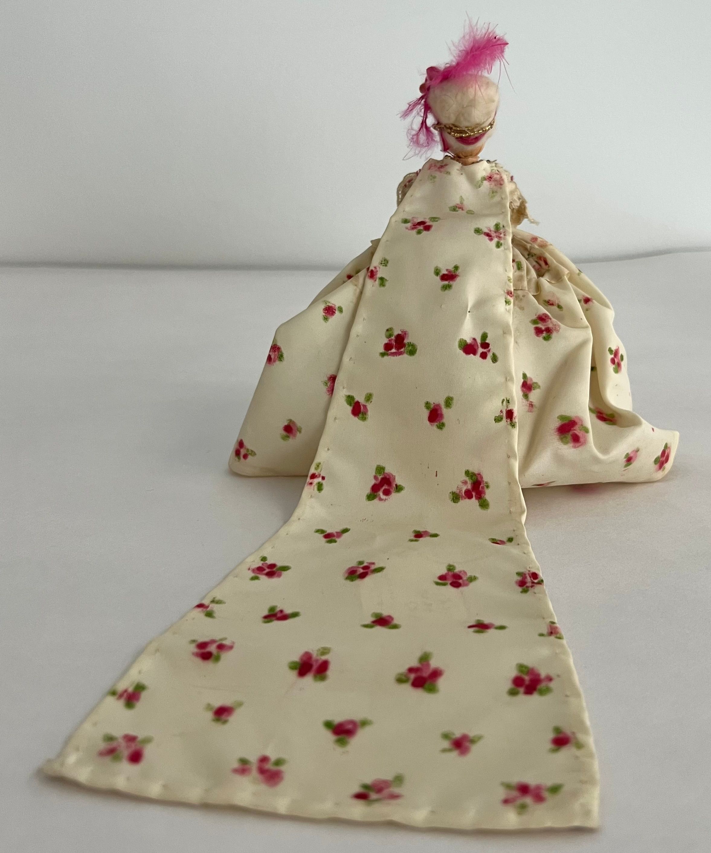 Standing position, wears white taffeta dress with pink rose print, gold trimming, gold necklace, lacy leg-of-mutton sleeves, gold band with pink feathers and flower worn, in hair, white hair, holds gold book.Collection