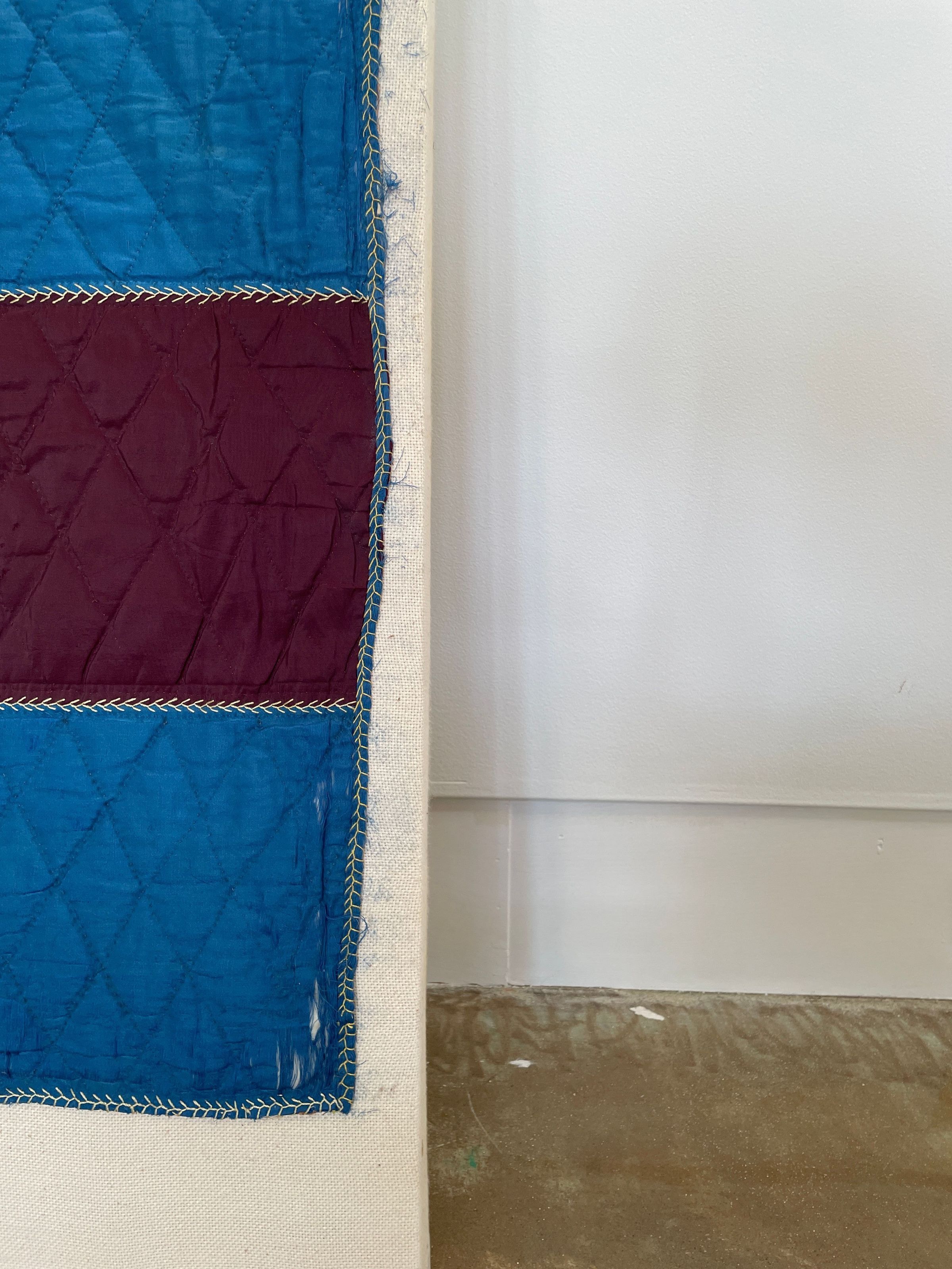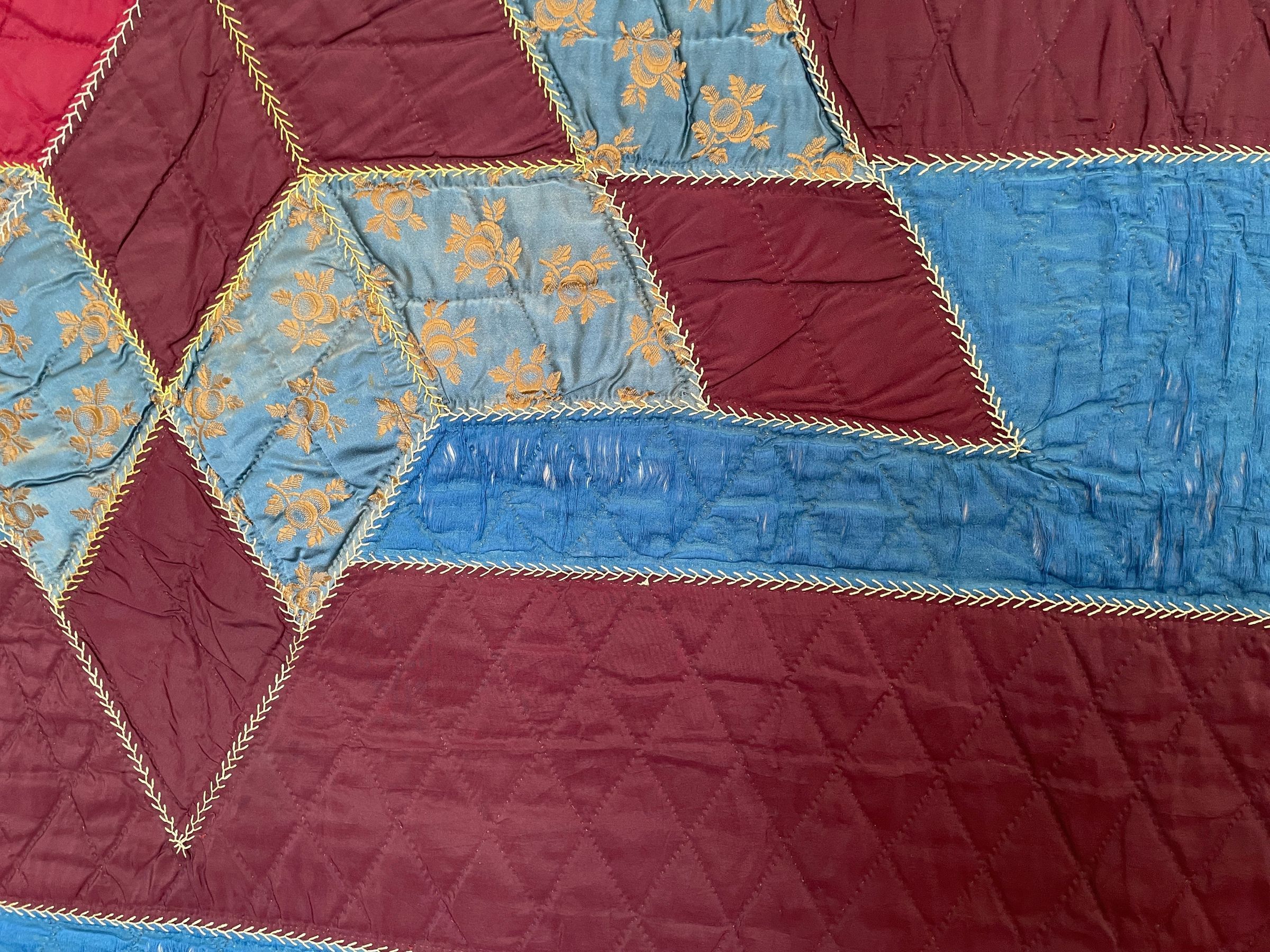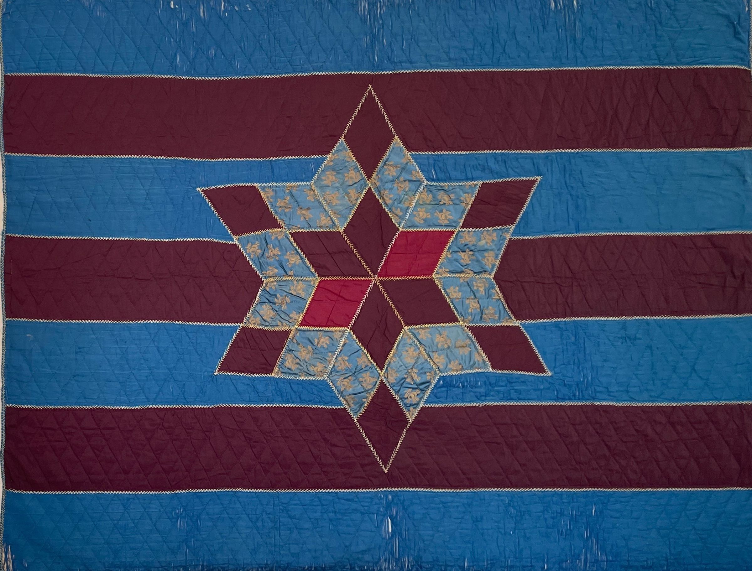 Face of quilt comprised of 7 blue and red stripes. Large star in middle. Star of 2 shades of red and blue fabric with embroidered flowers. Appears hand quilted. Back of quilt is a flowers (beige) patterned fabric.Collection
