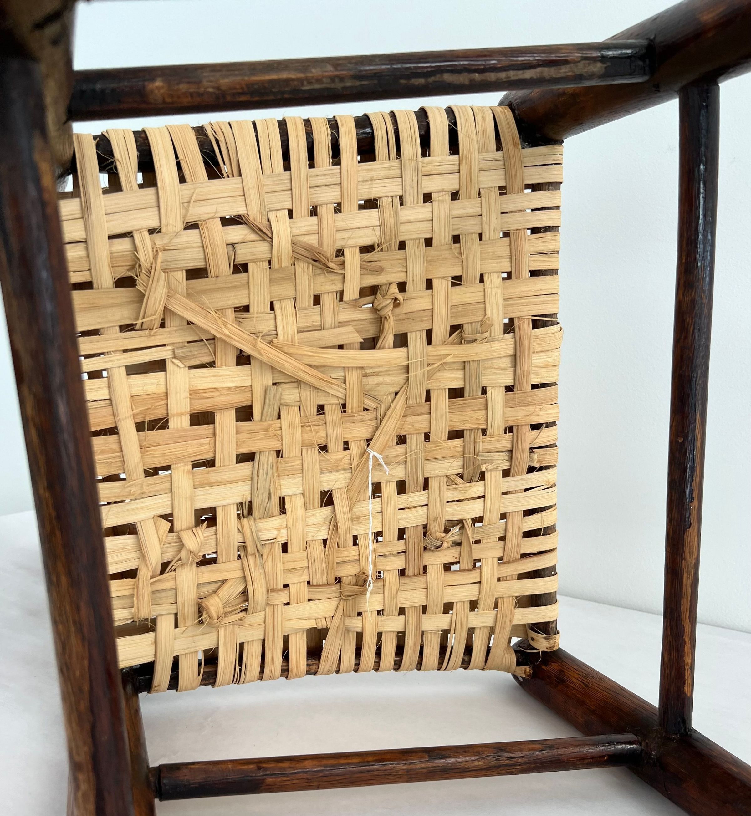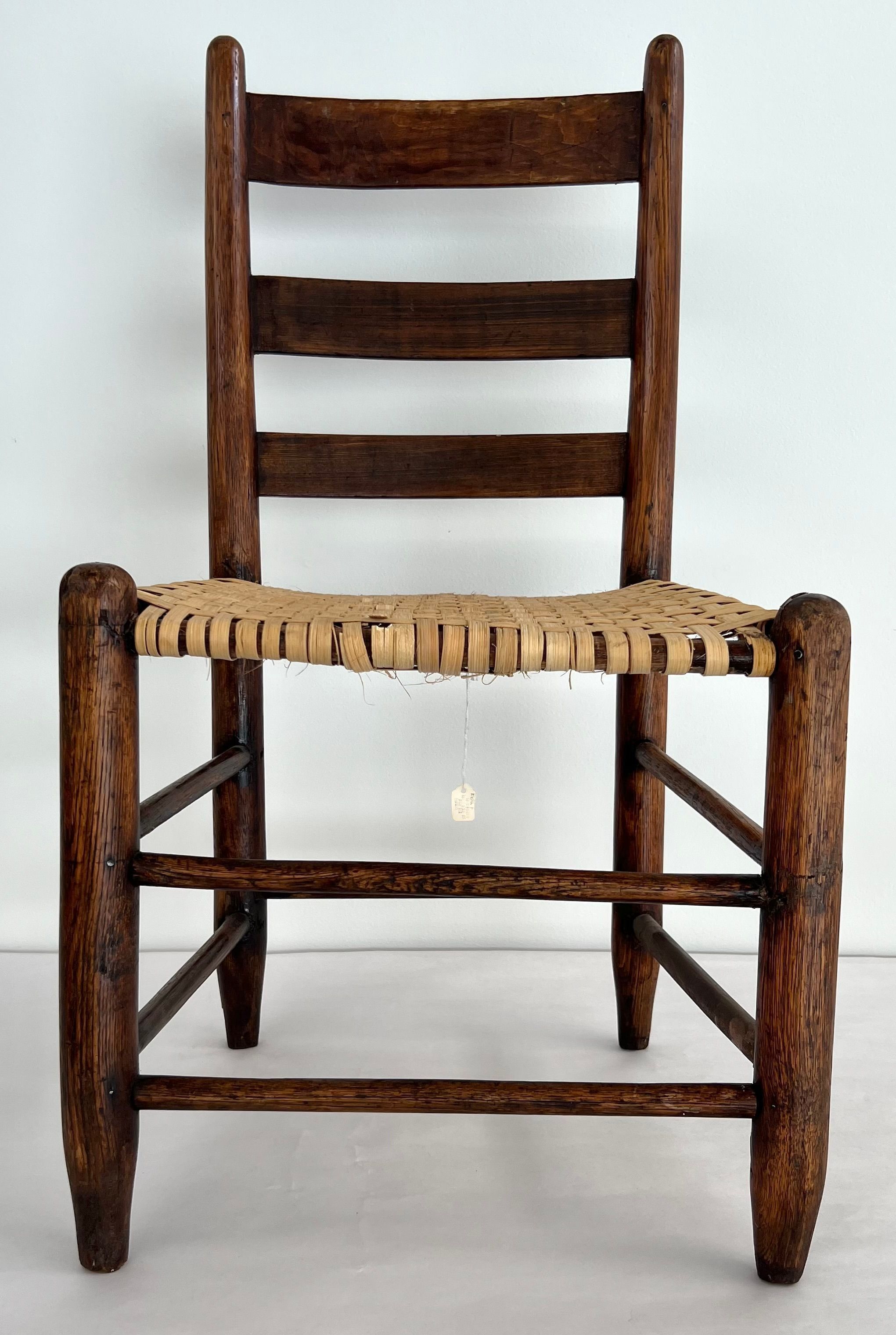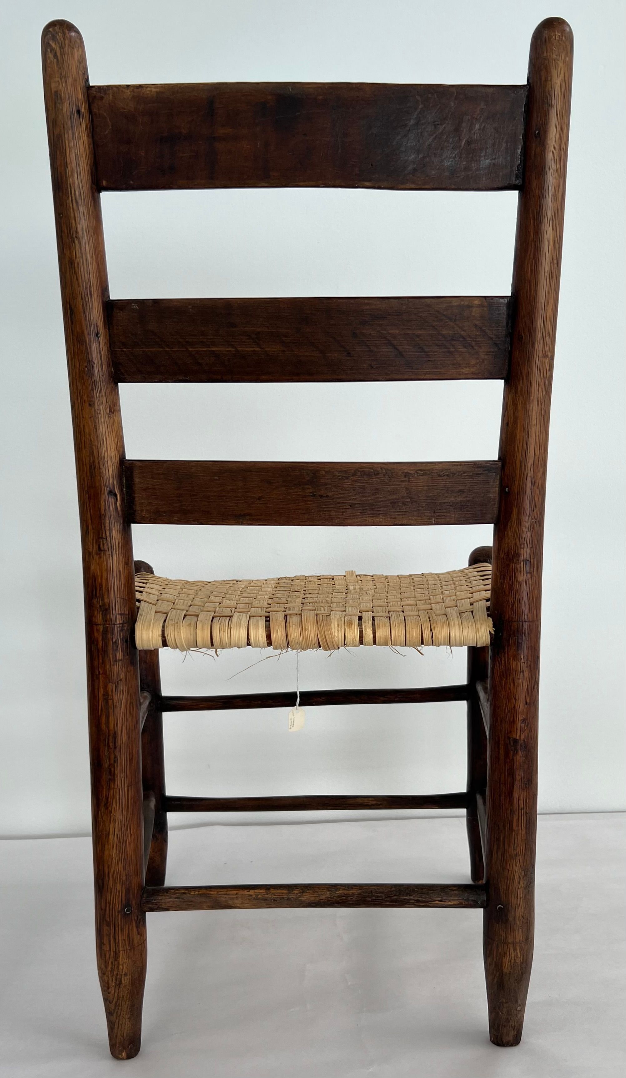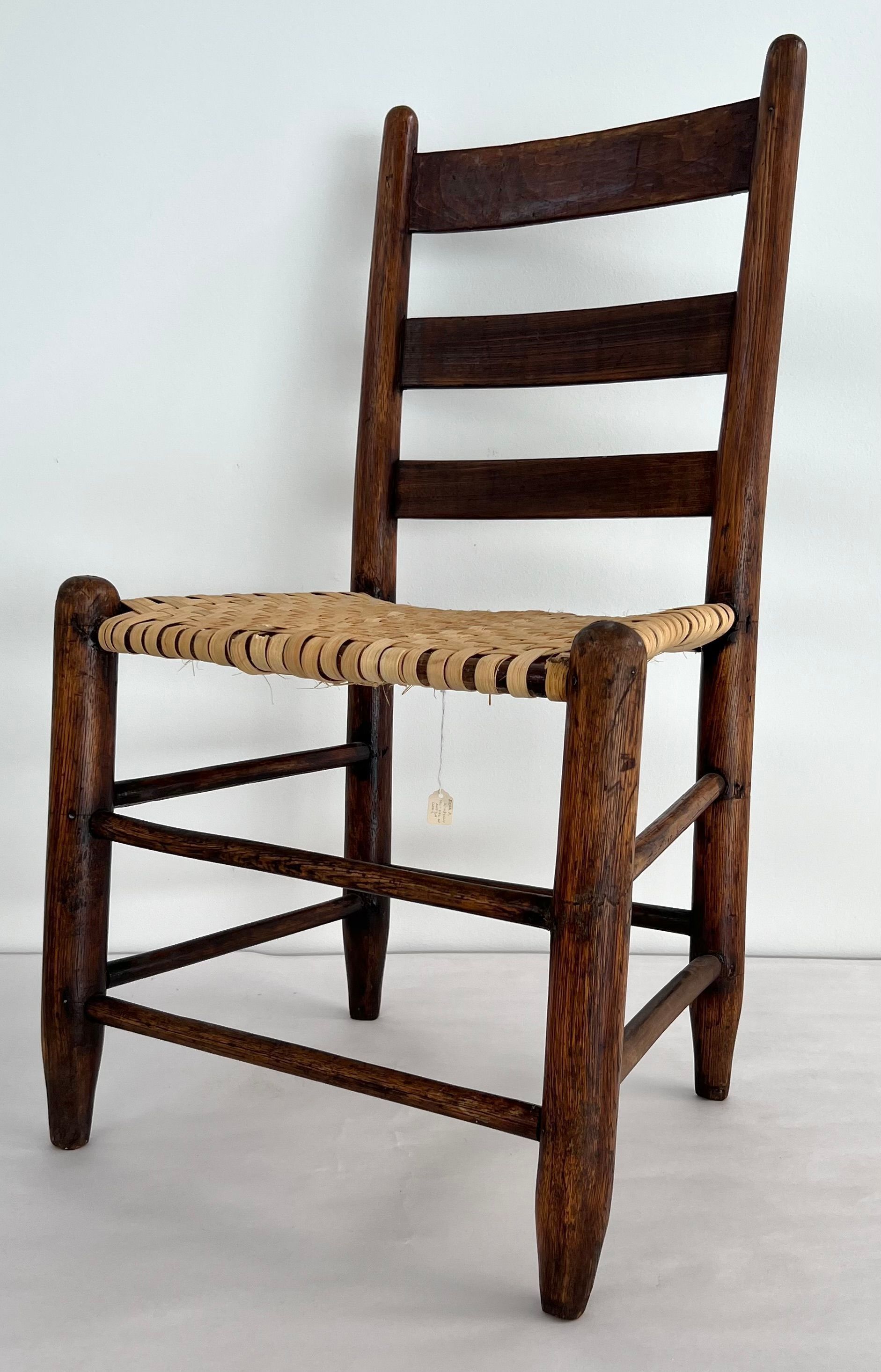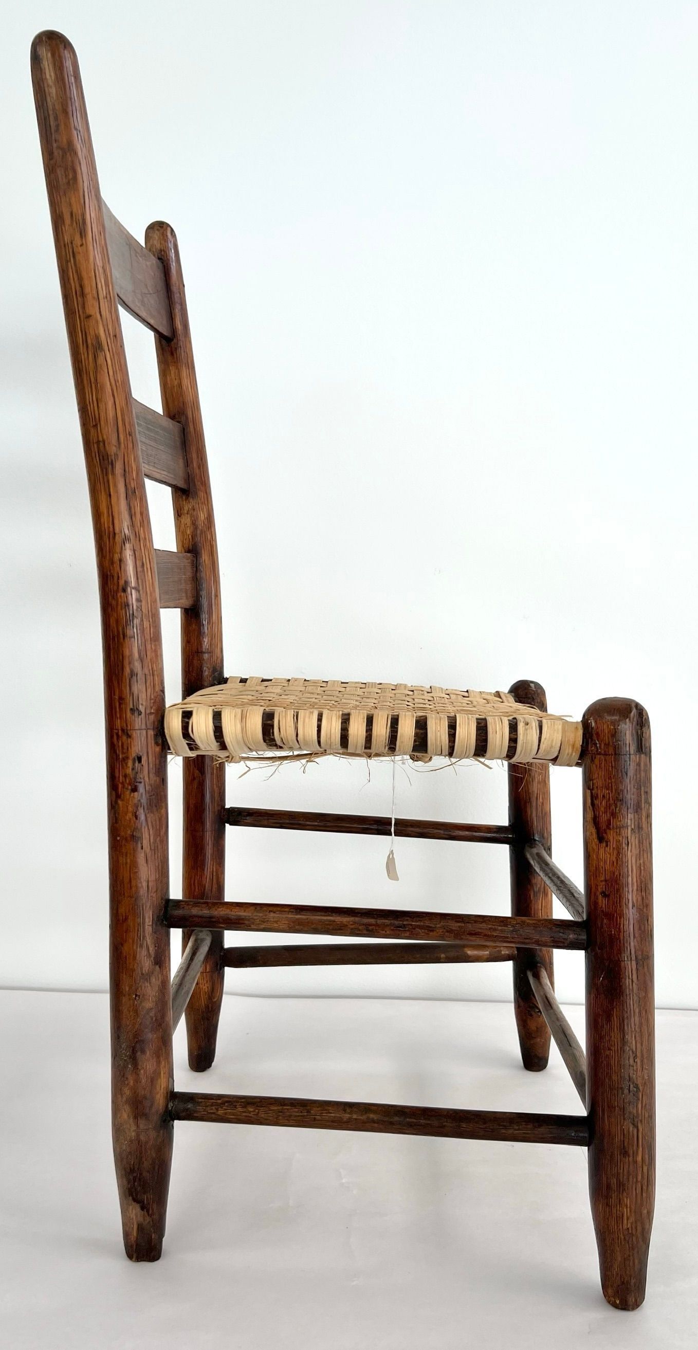 Brown split oak bottom, wood ladder-back chair with a cane seat, no decorative carvings. The natural color cane seat has an over-under weave. The woven seat is damaged and the weave is loose.Collection