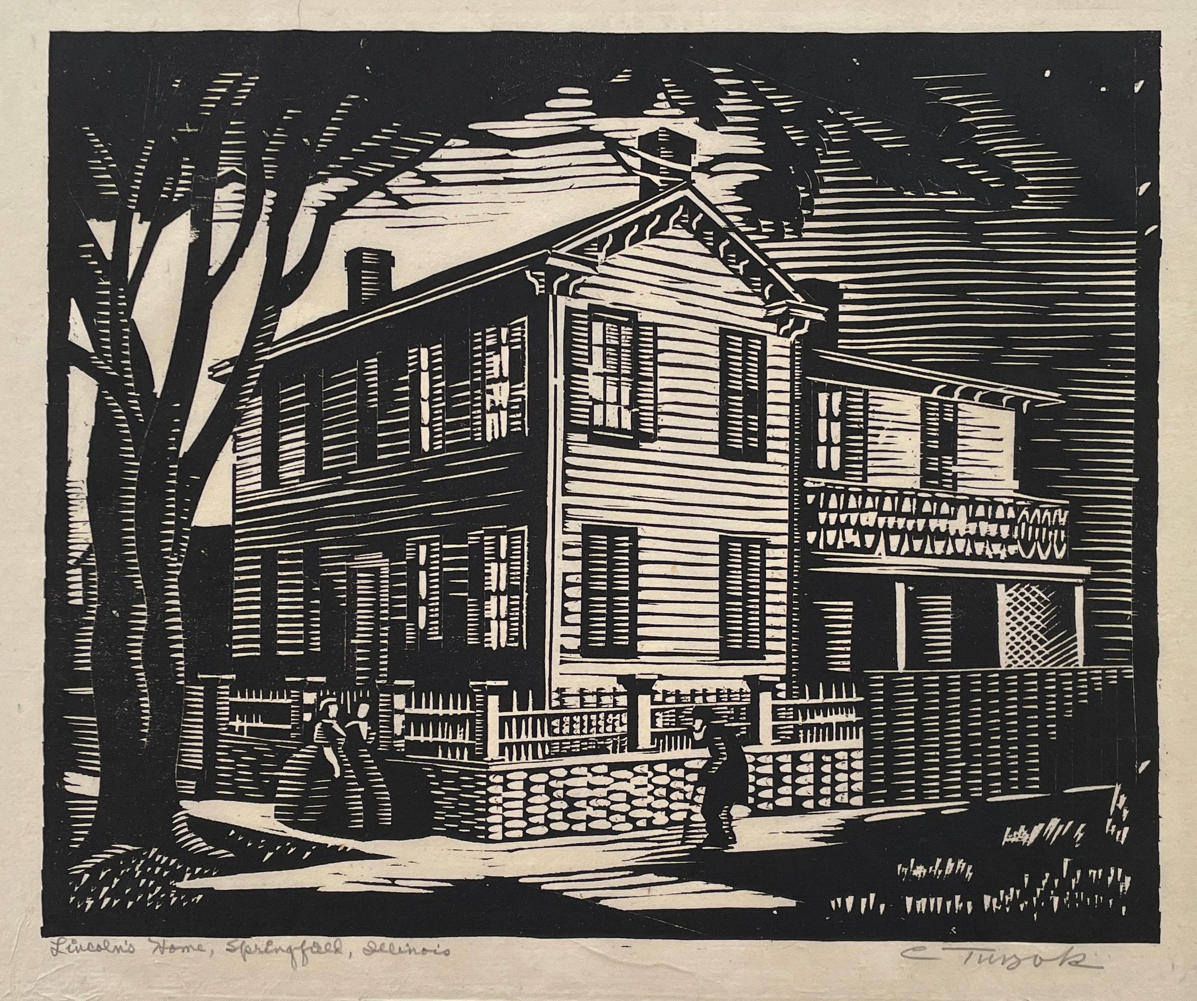 Corner view of two-story house situated on a corner fenced in yard. On the sidewalk outside the fence is a bent old man at right and a pair of ladies at left. There is a large tree in the left side of the picture.Wood cut printed in black ink images stylized; signed C. Turzak in lower right no edition # titled lower leftCollection