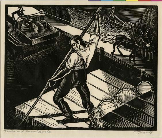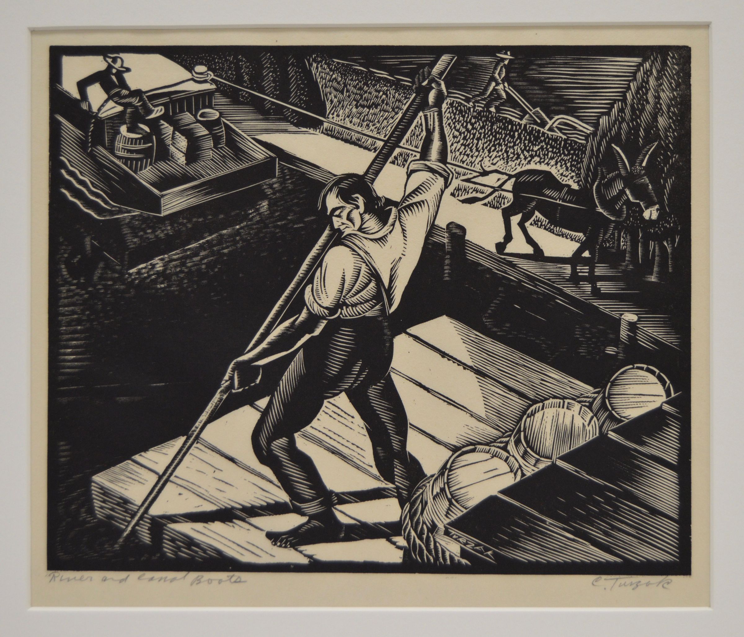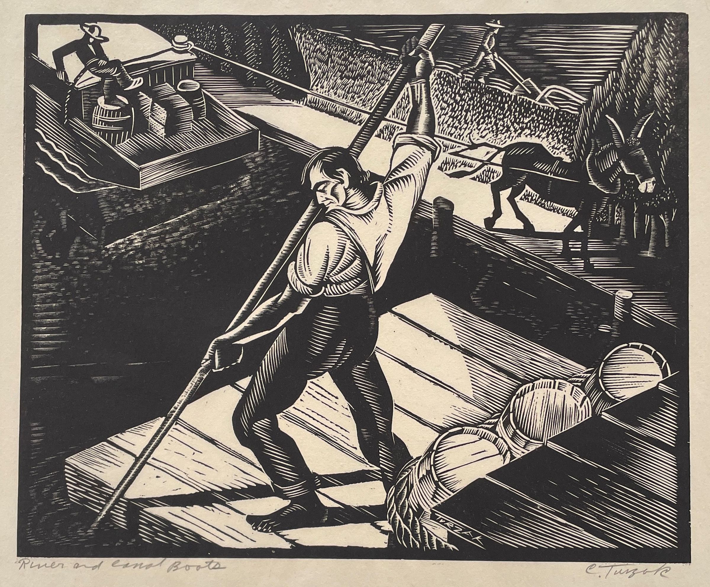 In the center of the composition is a figure guiding a river barge through a canal with a pole followed by another barge that is being pulled by a donkey. A farmer breaks earth further in the background.Wood cut printed in black ink images stylized; signed C. Turzak in lower right no edition # titled lower leftCollection