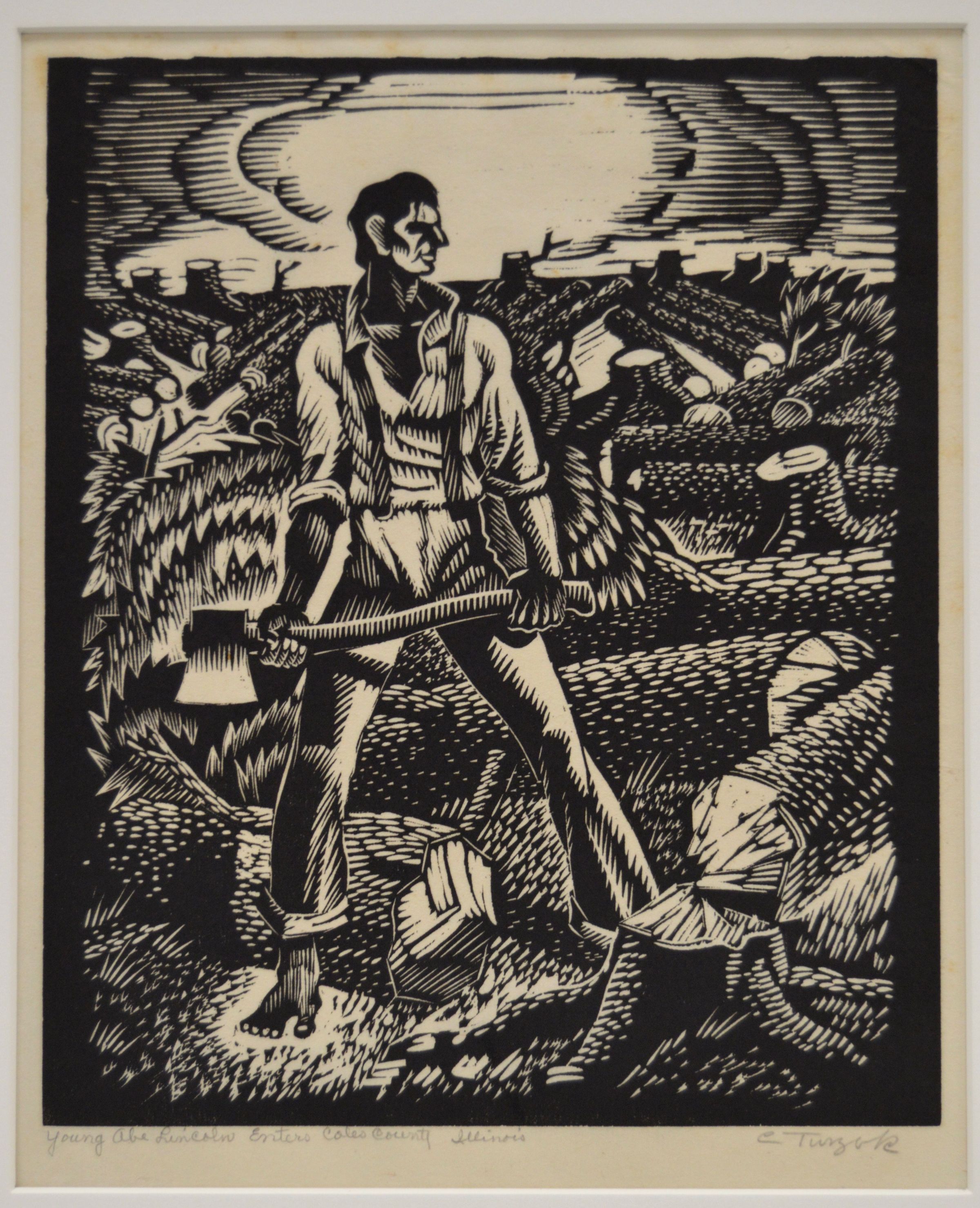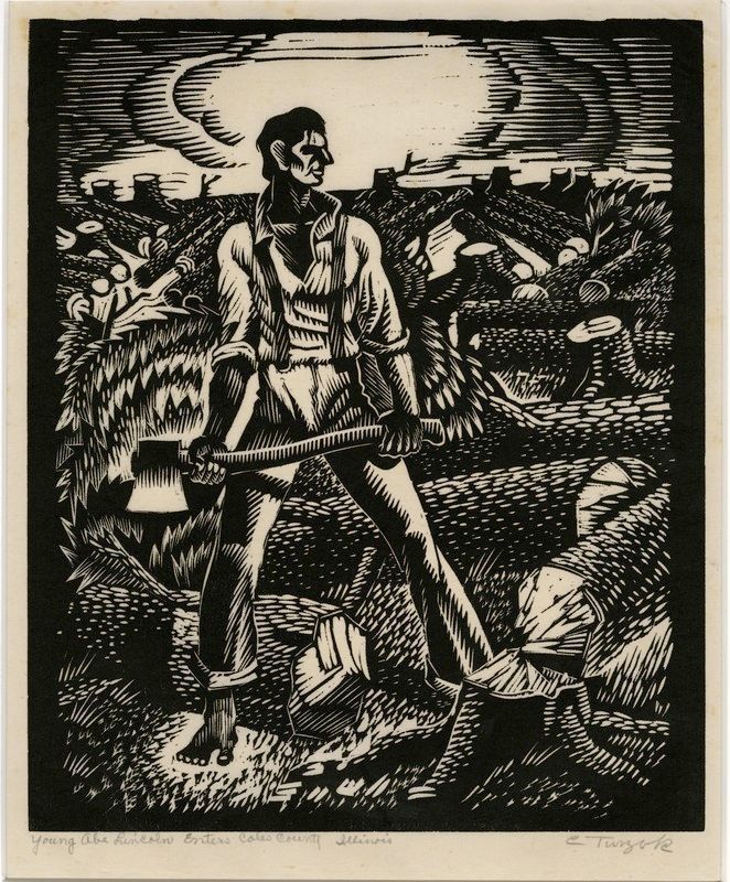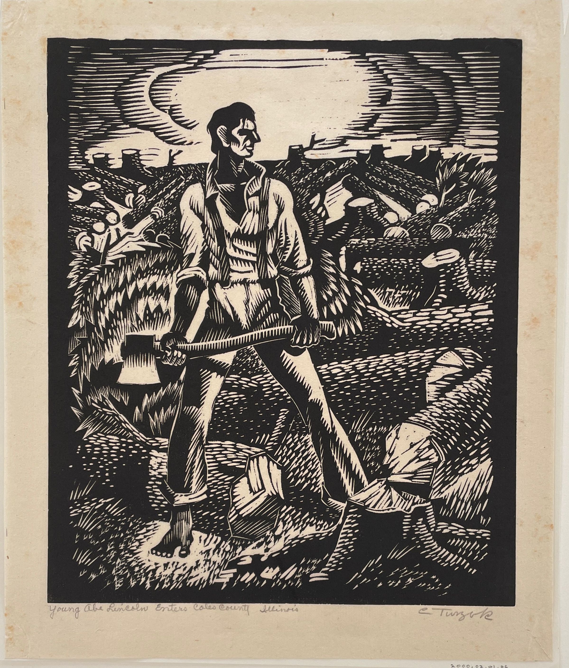 Figure stands barefoot holding an ax left-center on the page. Behind him we see that he has felled many trees. Black on tan paper. Signed "Charles Turzak" no edition numberCollection
